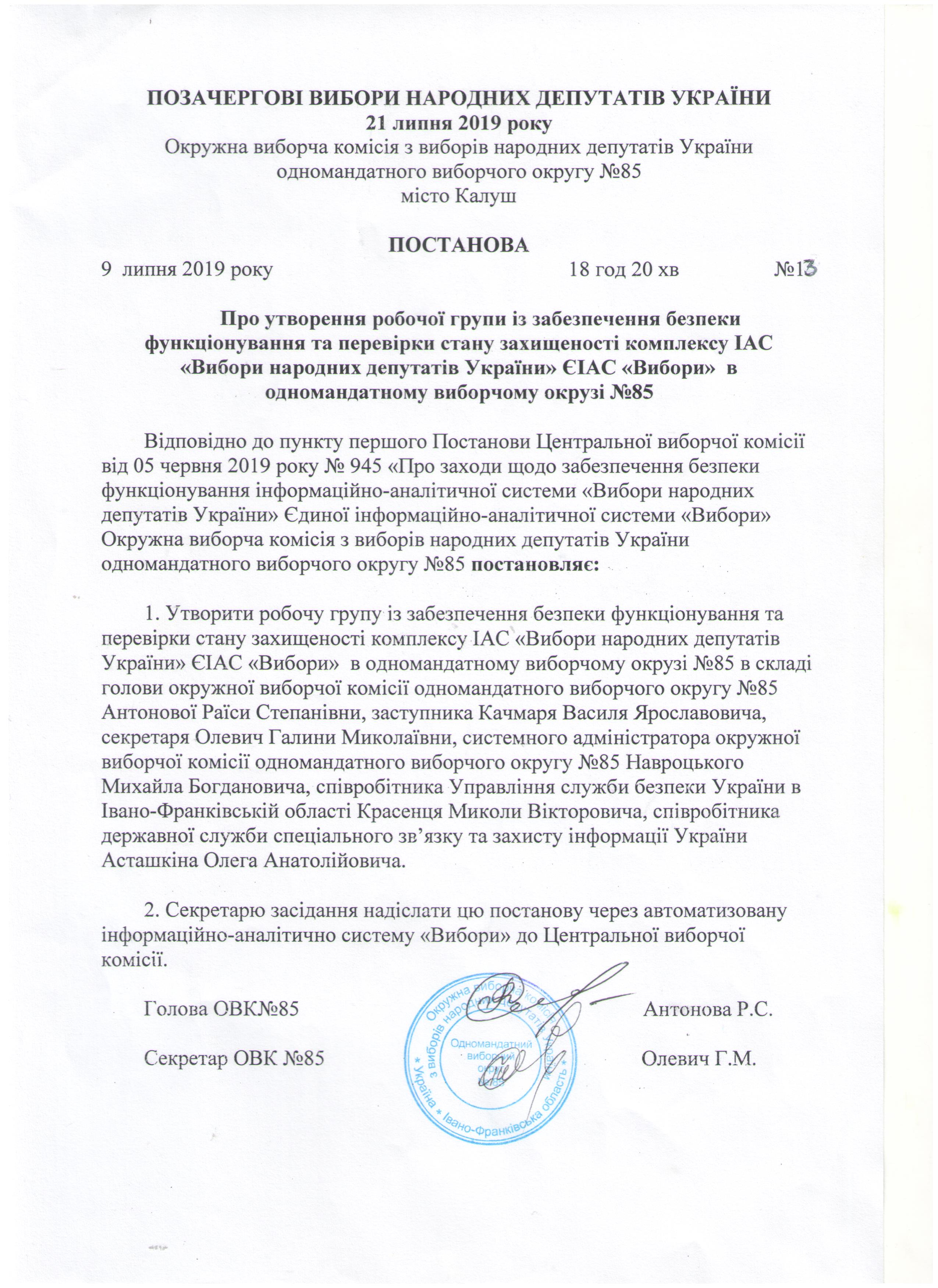 Про утворення робочої групи із забезпечення безпеки функціонування та перевірки стану захищеності комплексу ІАС "Вибори" в ОВК № 85 |
