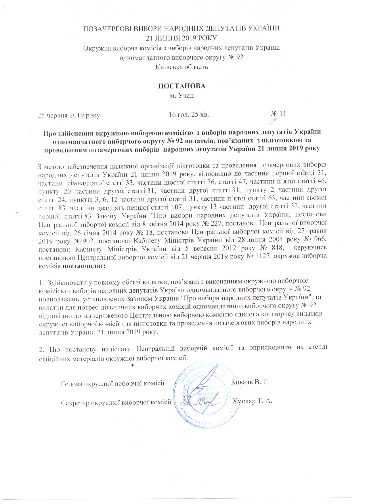 Про здійснення ОВК ОВК з виборів народних депутатів України ОВО № 92 видатків |