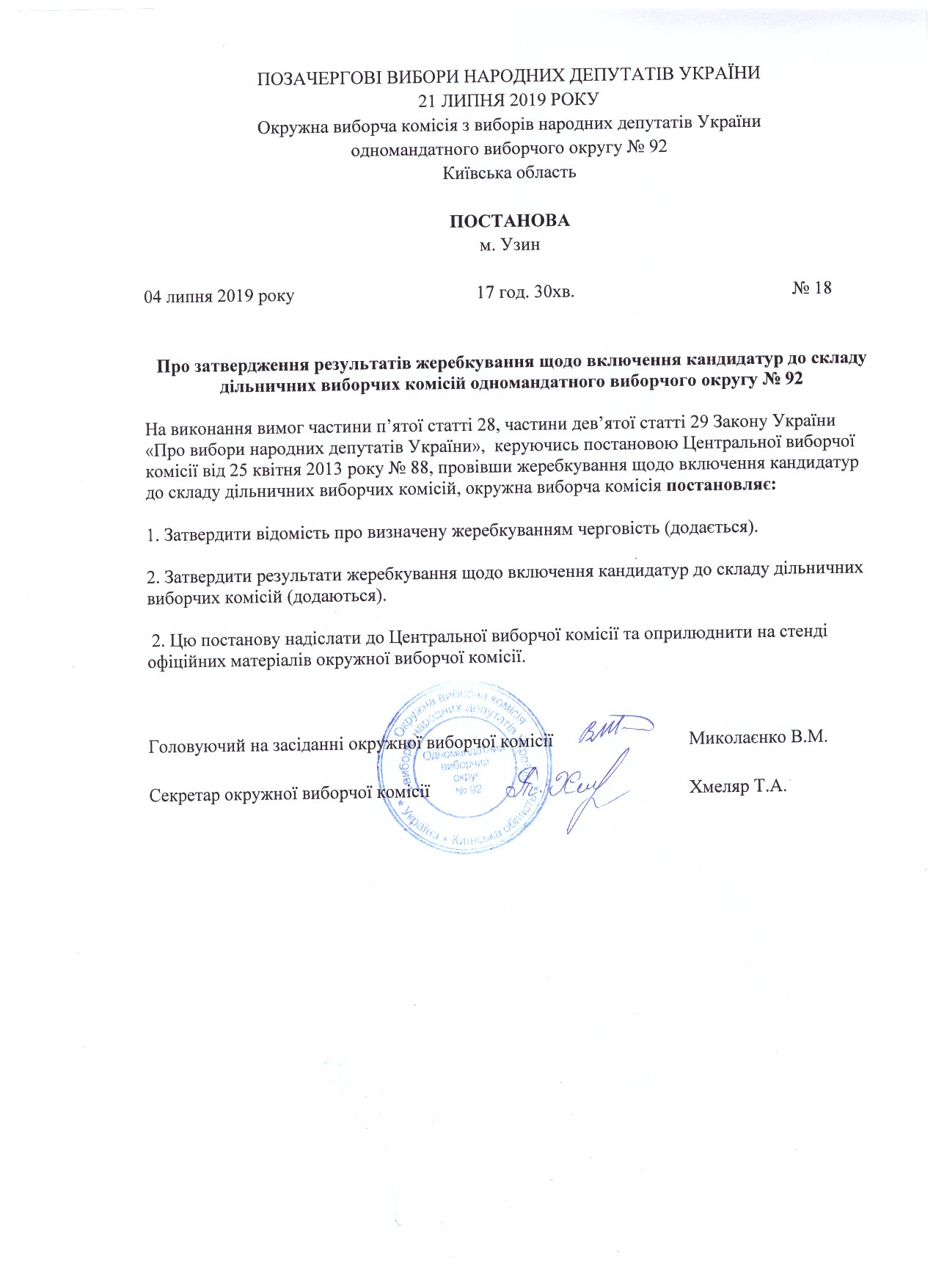 Про затвердження результатів жеребкування щодо включення кандидатур до складу дільничних виборчих комісій одномандатного виборчого округу № 92 |