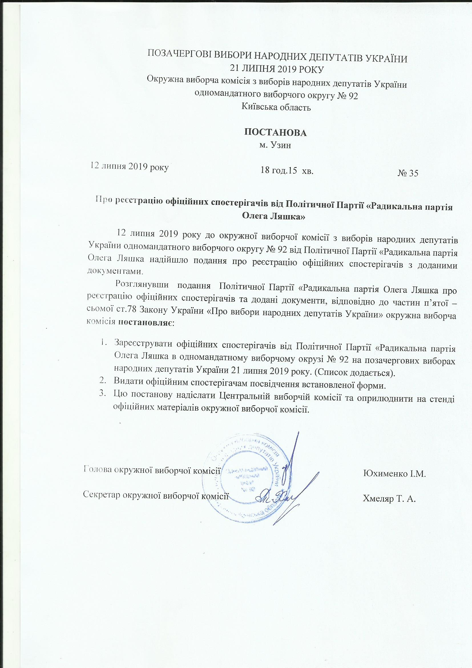 Про реєстрацію офіційних спостерігачів від Політичної Партії "Голос" в одномандатному виборчому окрузі №92 на позачергових виборах народних депутатів України 21 липня 2019 року |