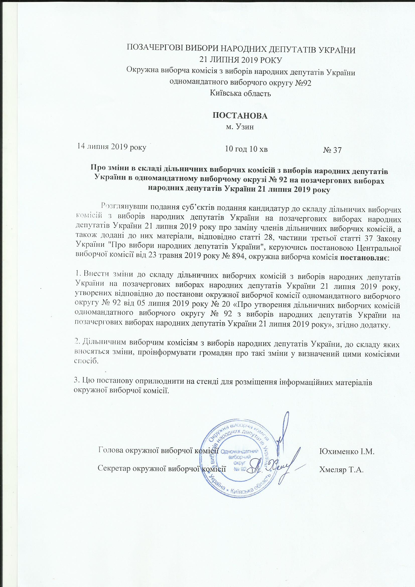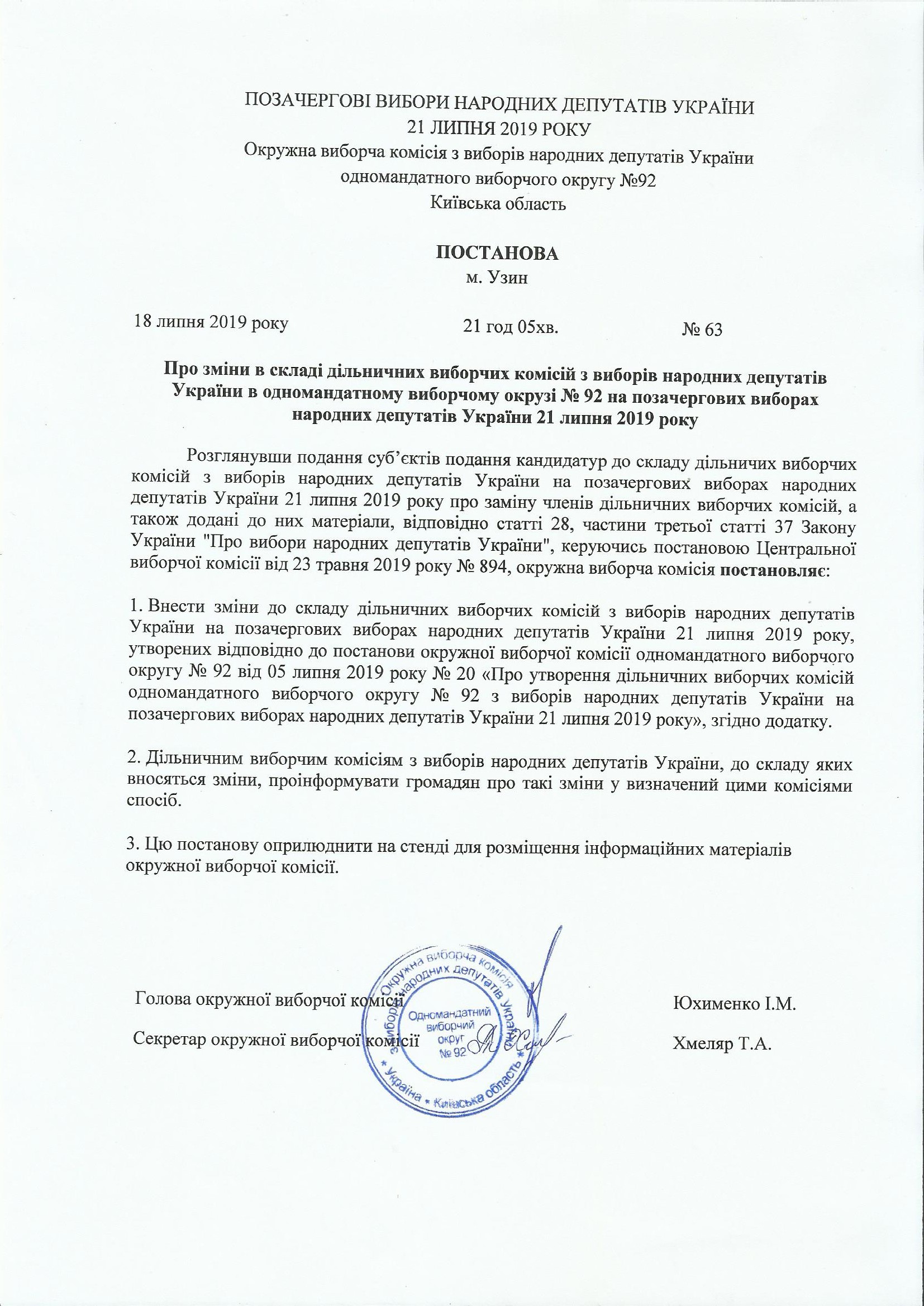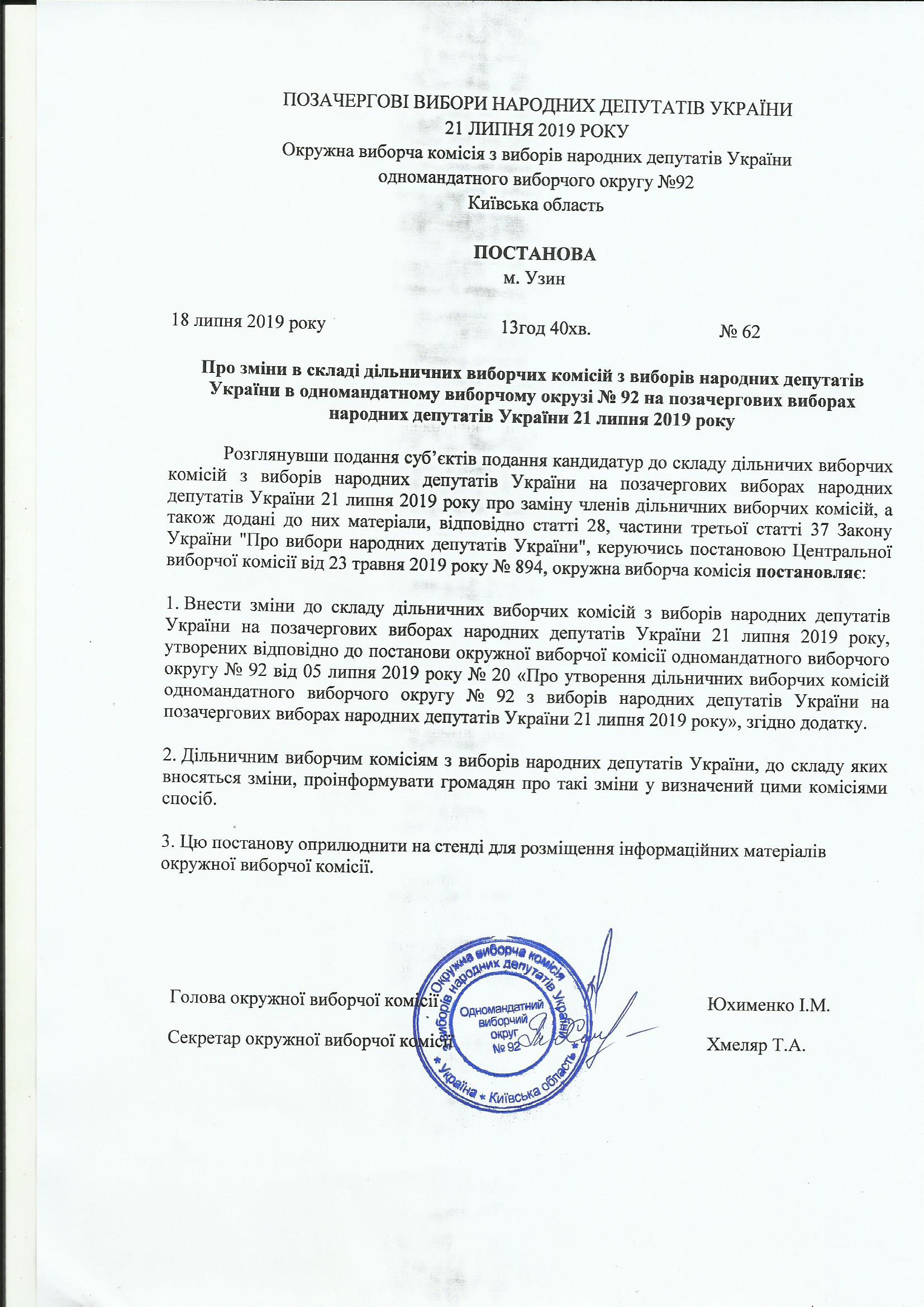 Про зміни в складі дільничних виборчих комісій з виборів народних депутатів України в одномандатному виборчому окрузі №92 на позачергових виборах народних депутатів України 21 липня 2019 |