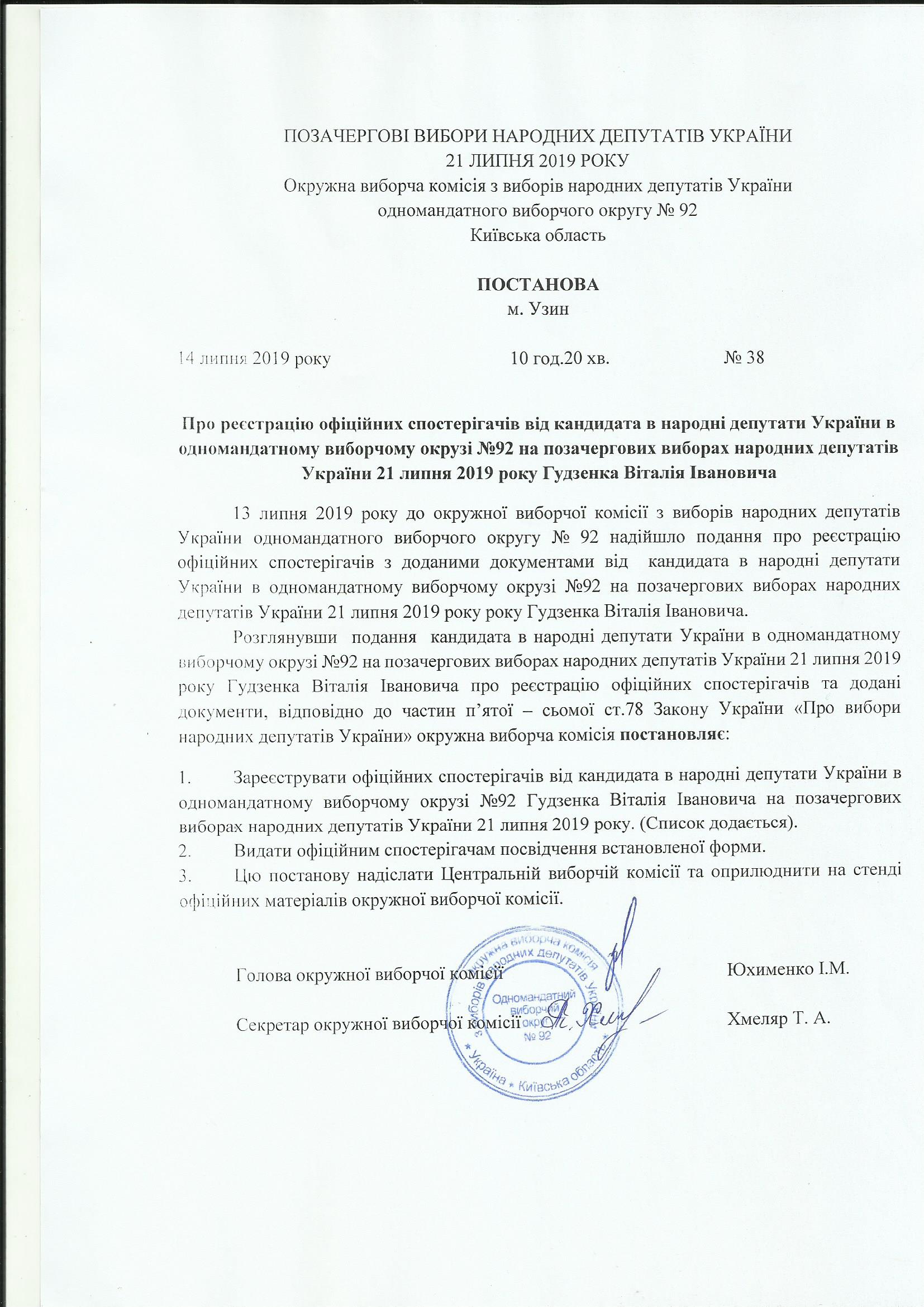 Про реєстрацію офіційних спостерігачів від кандидата в народні депутати України в одномандатному виборчому окрузі №92 на позачергових виборах народних депутатів України 21 липня 2019 року Гудзенка Віталія Івановича |