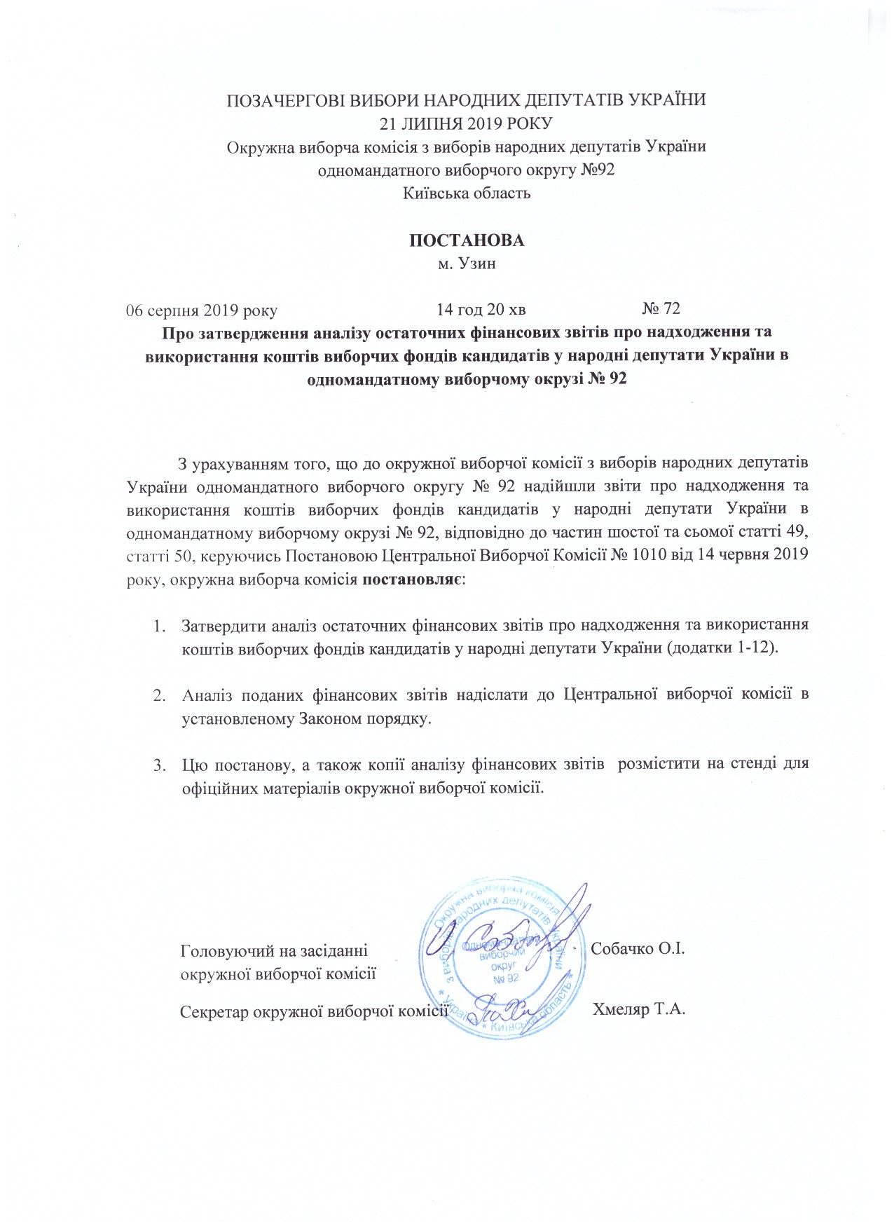 Про затвердження аналізу проміжних фінансових звітів про надходження і використання коштів виборчих фондів кандидатів у народні депутати Украіни в одномандатному виборчому окрузі №92 |