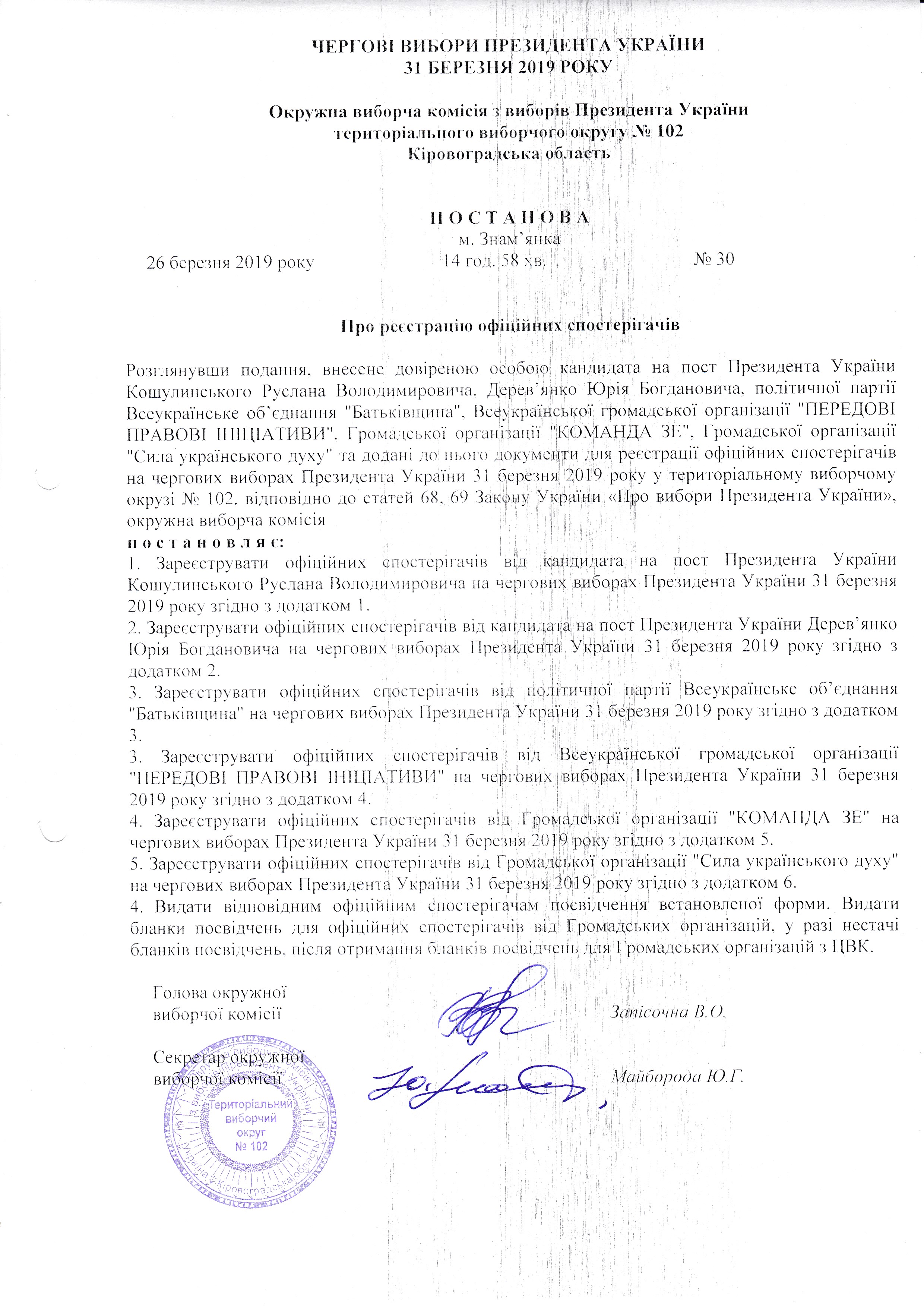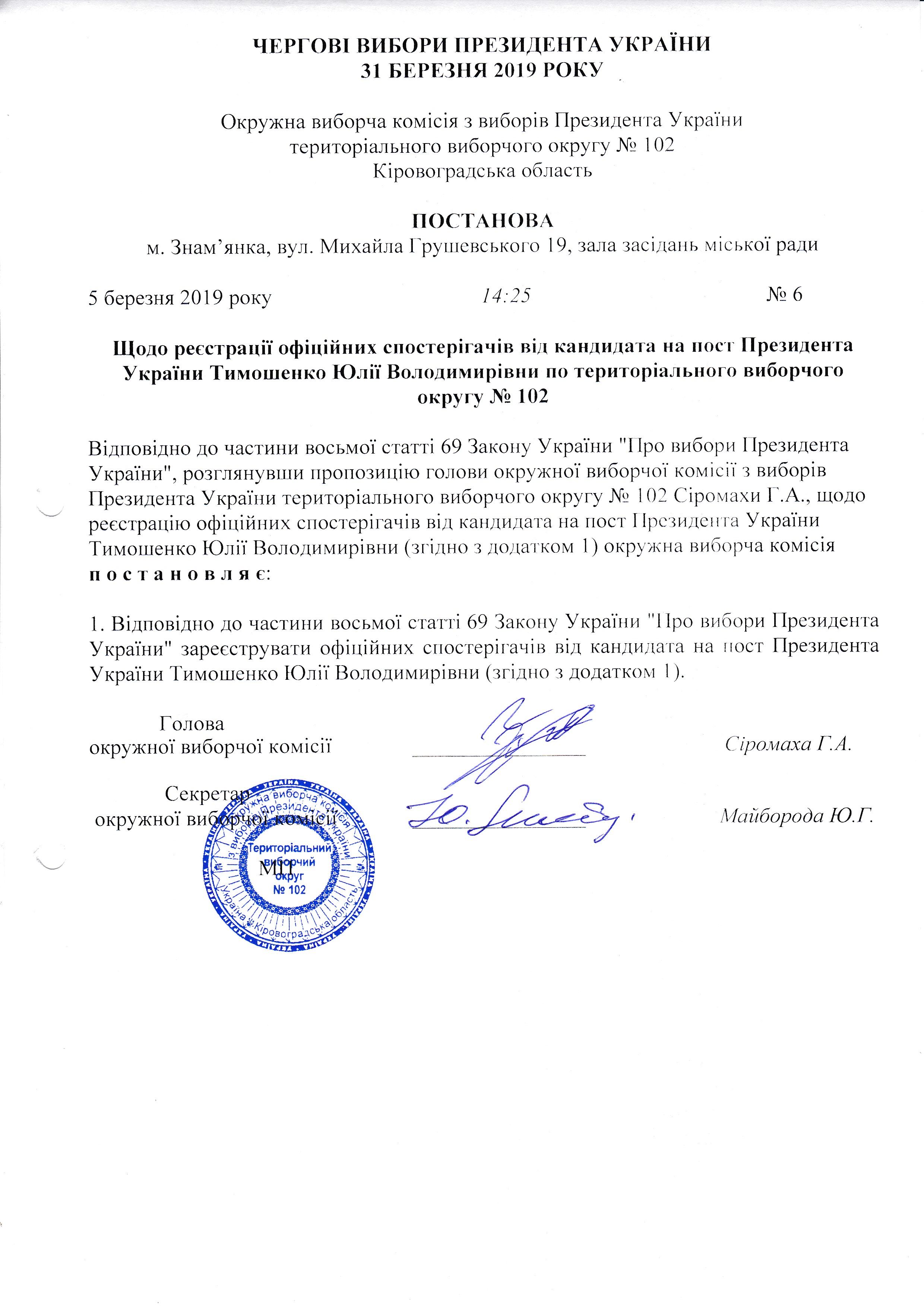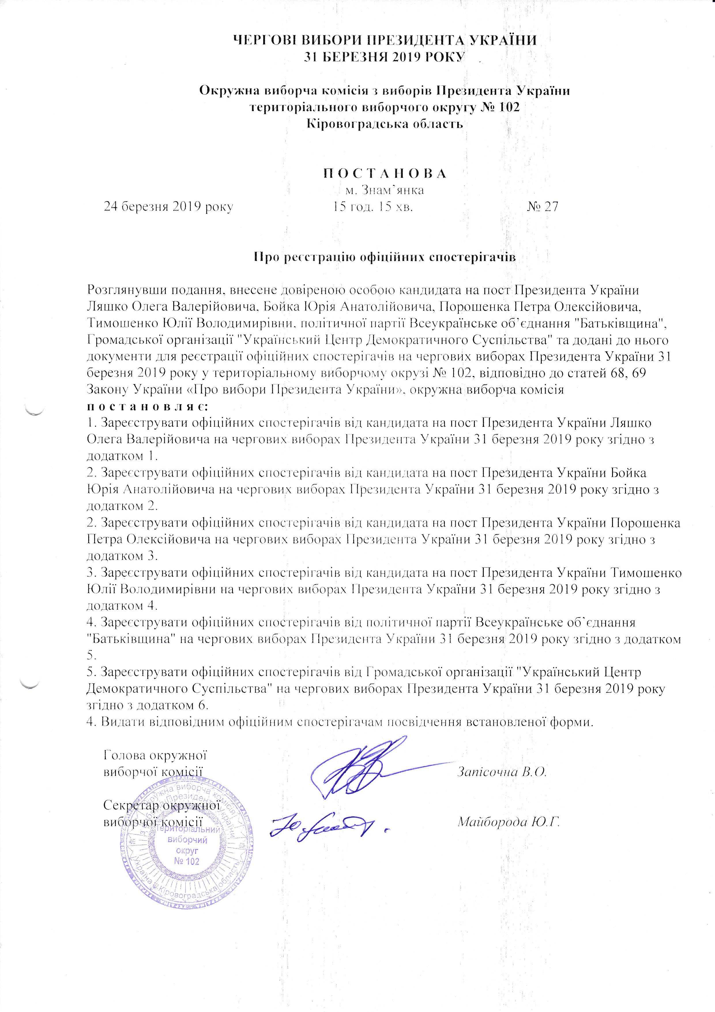 Щодо реєстрації офіційних спостерігачів від кандидата на пост Президента України Тимошенко Юлії Володимирівни по територіального виборчого округу № 102 |