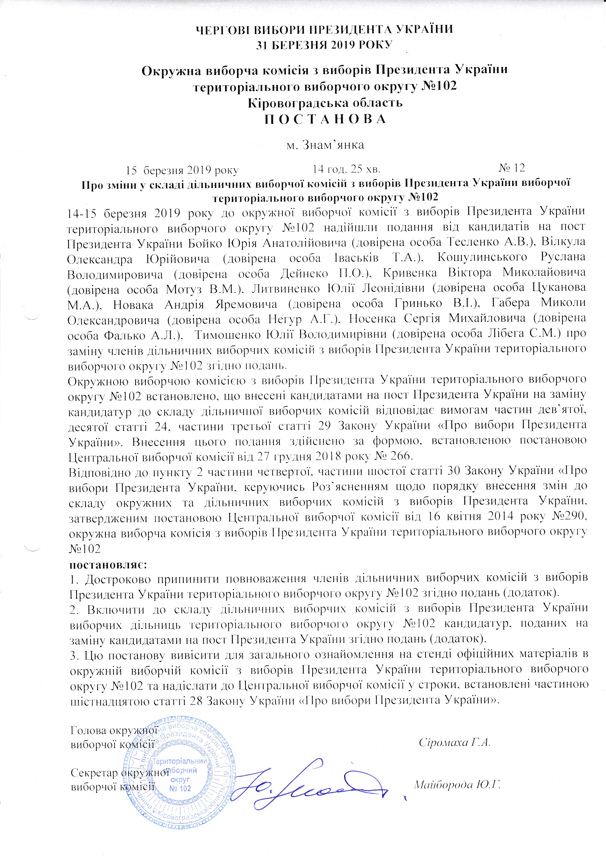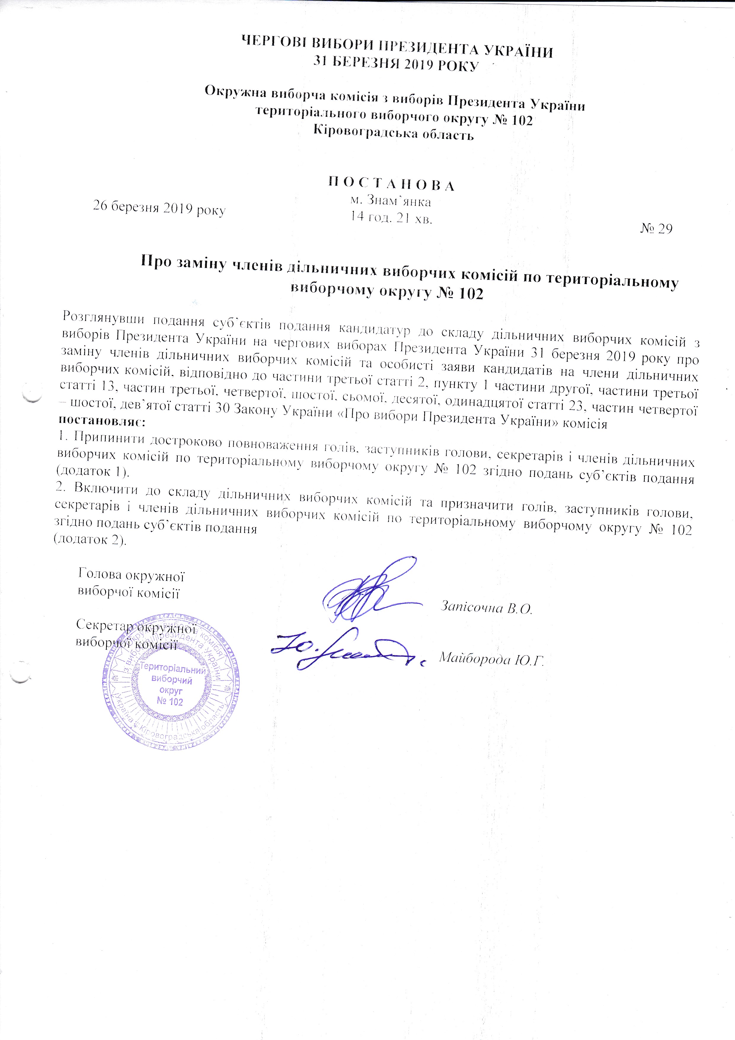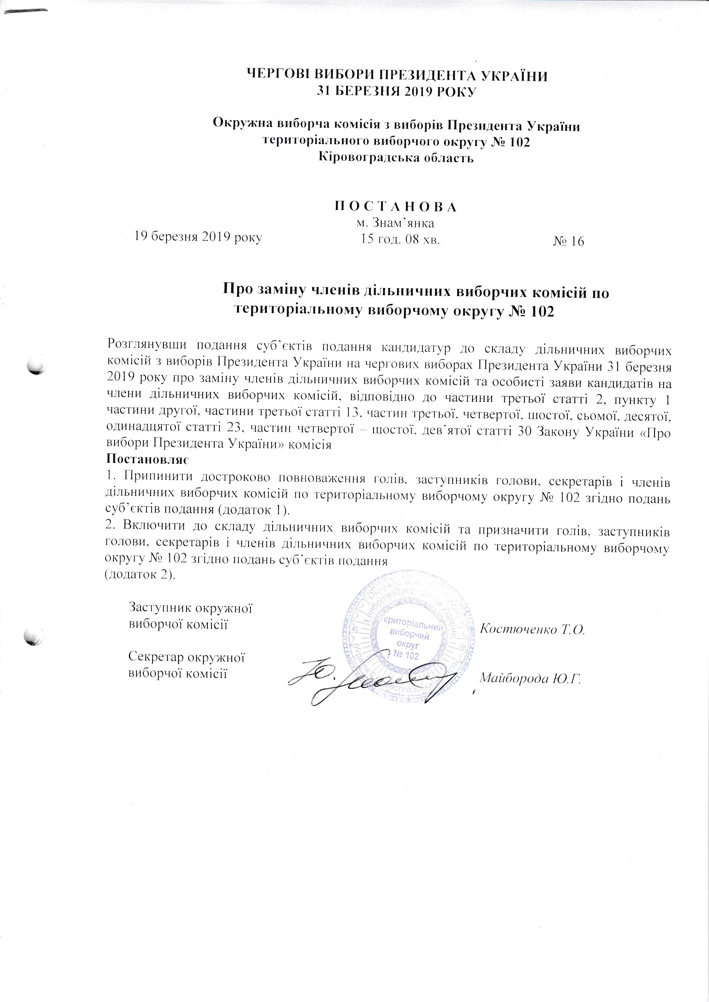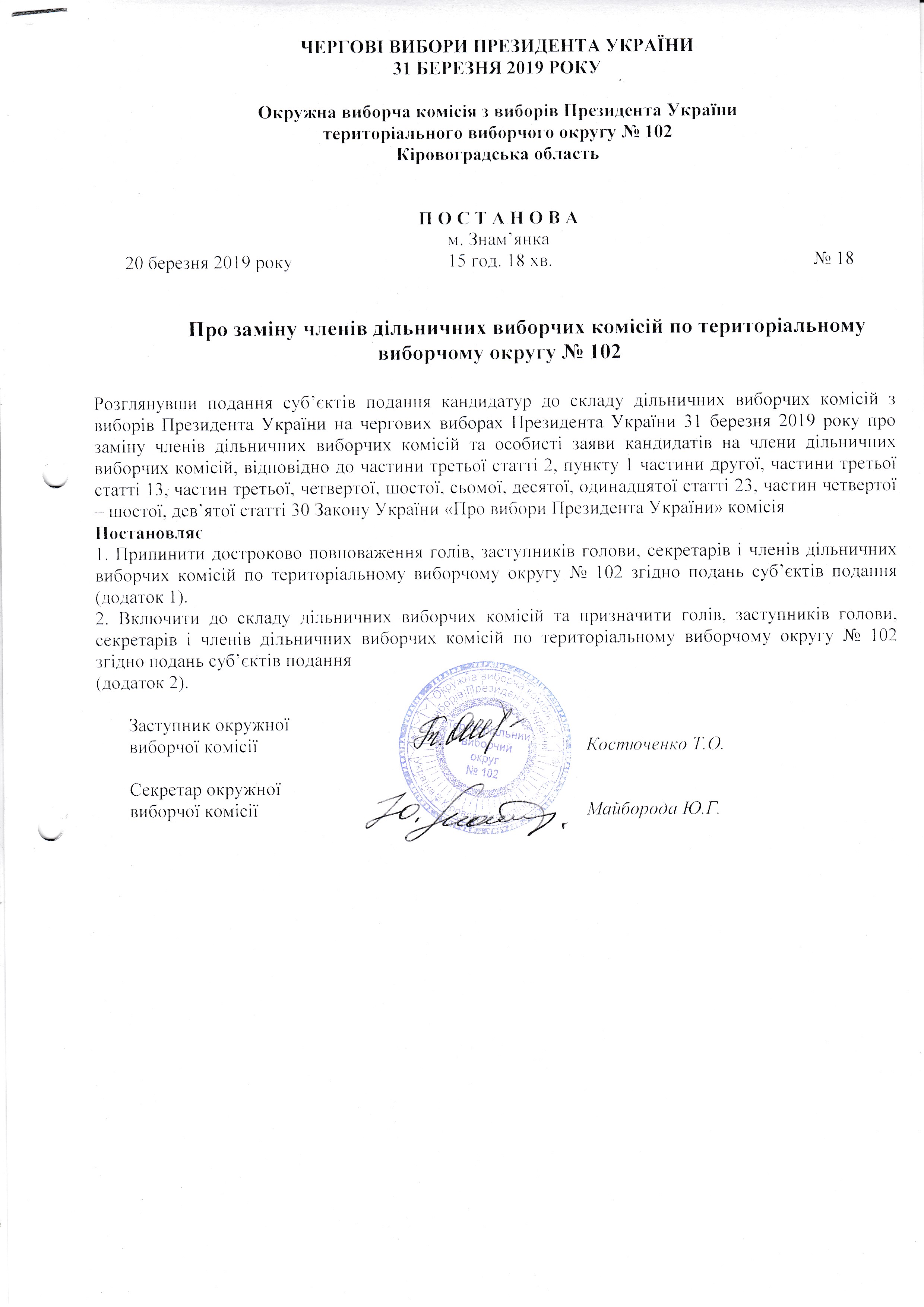 Про зміни у складі дільничних виборчих комісій з виборів Президента України виборчої територіального округу № 102 |