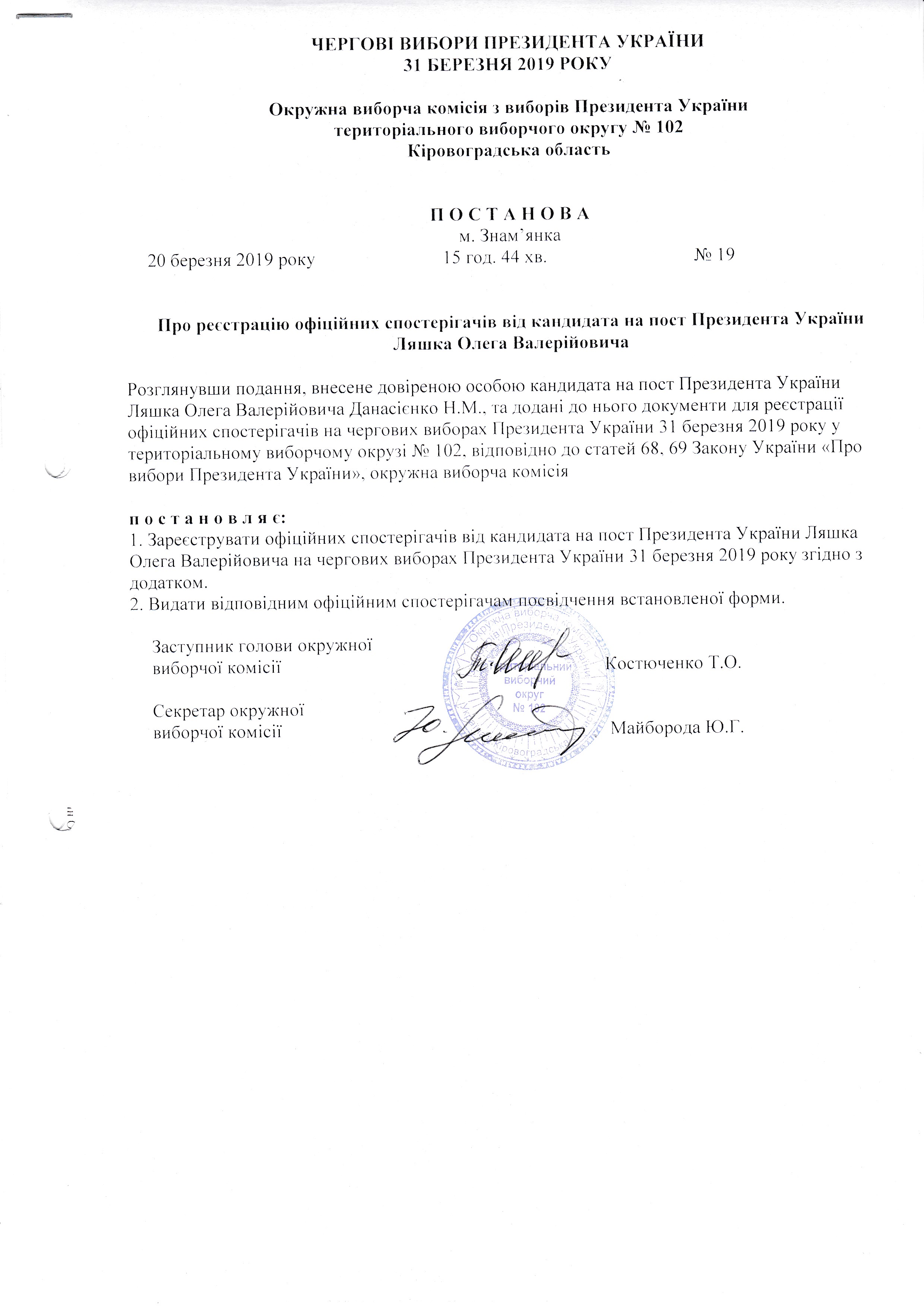 Щодо внесення зміни до Постанови №17 від 19 березня 2019 року "Про реєстрацію офіційних спостерігачів від кандидата на пост Президента України Ляшка Олега Валерійовича на чергових виборах Президента України 31 березня 2019 року у територіальному виборчому округу №102" |