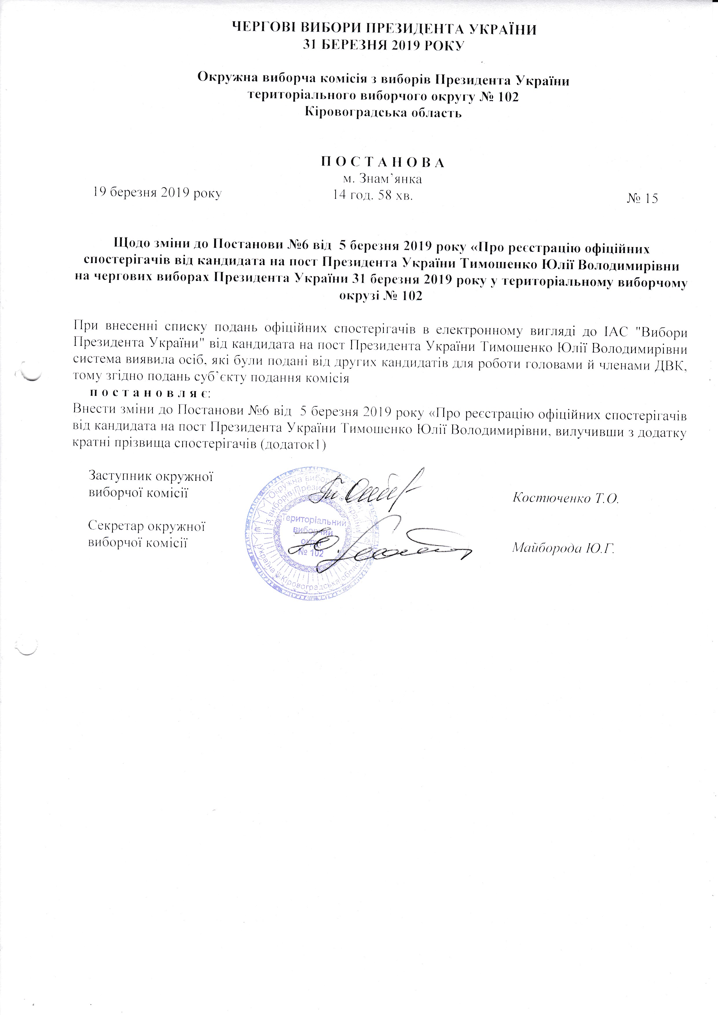 Щодо зміни до Постанови №6 від 5 березня 2019 року "Про реєстрацію офіційних спостерігачів від кандидата на пост Президента України Тимошенко Юлії Володимирівни на чергових виборах Президента України 31 березня 2019 року у територіальному виборчому окрузі №102 |