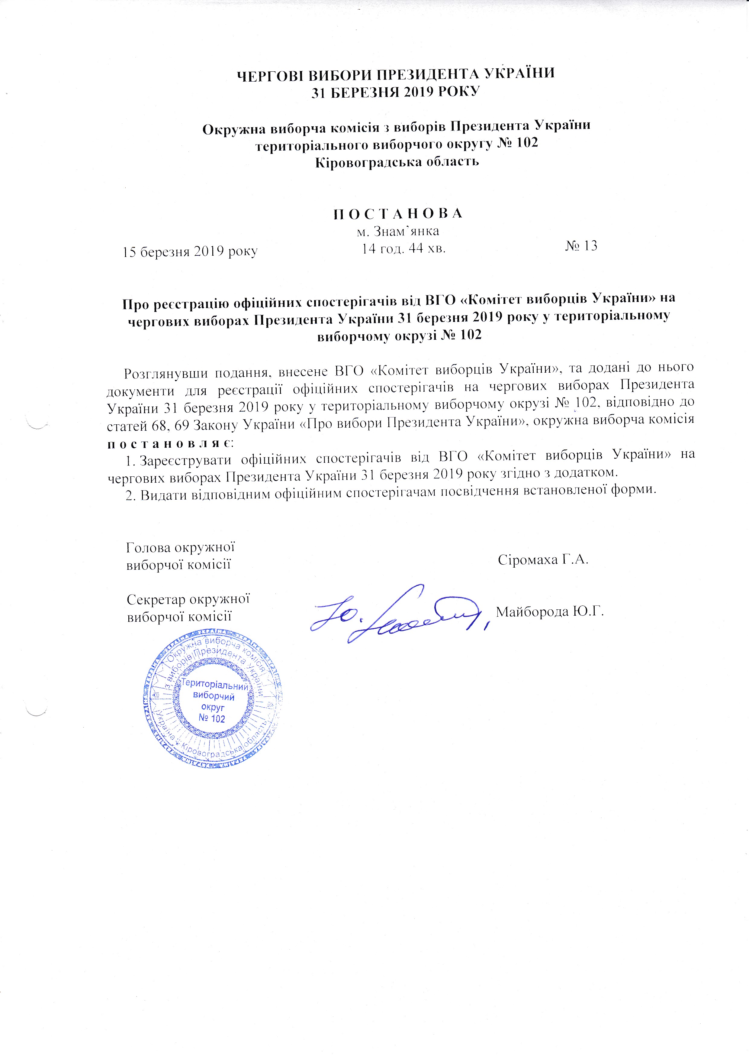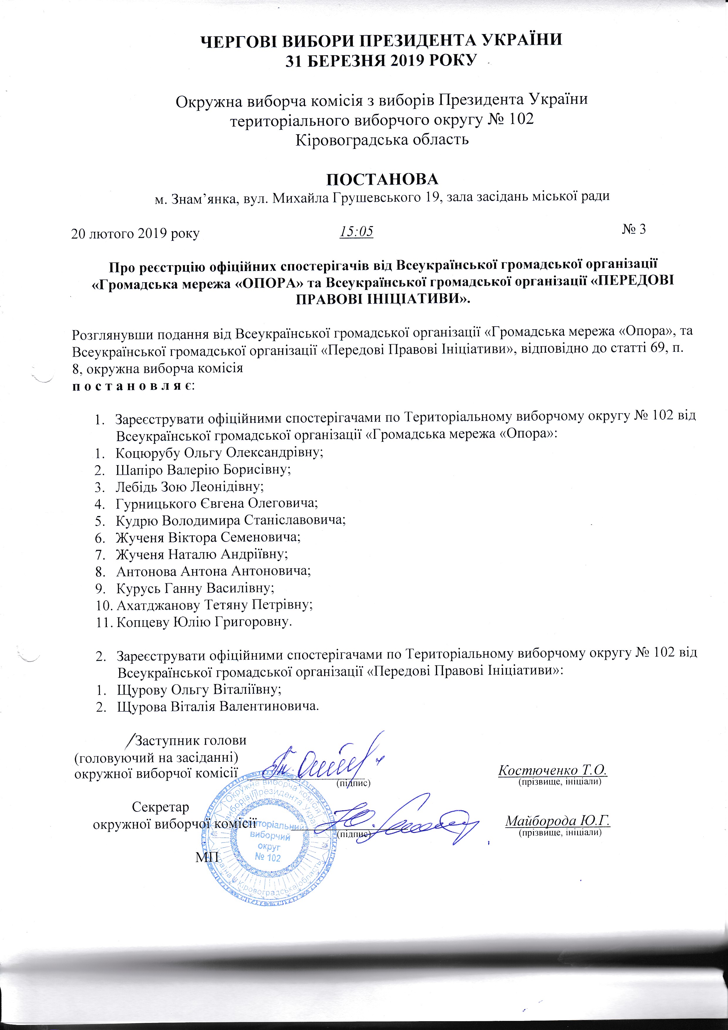 Про реєстрацію офіційних спостерігачів ВГО "Комітет виборців України" на чергових виборах Президента України 31 березня 2019 року у територіальному виборчому окрузі №102 |