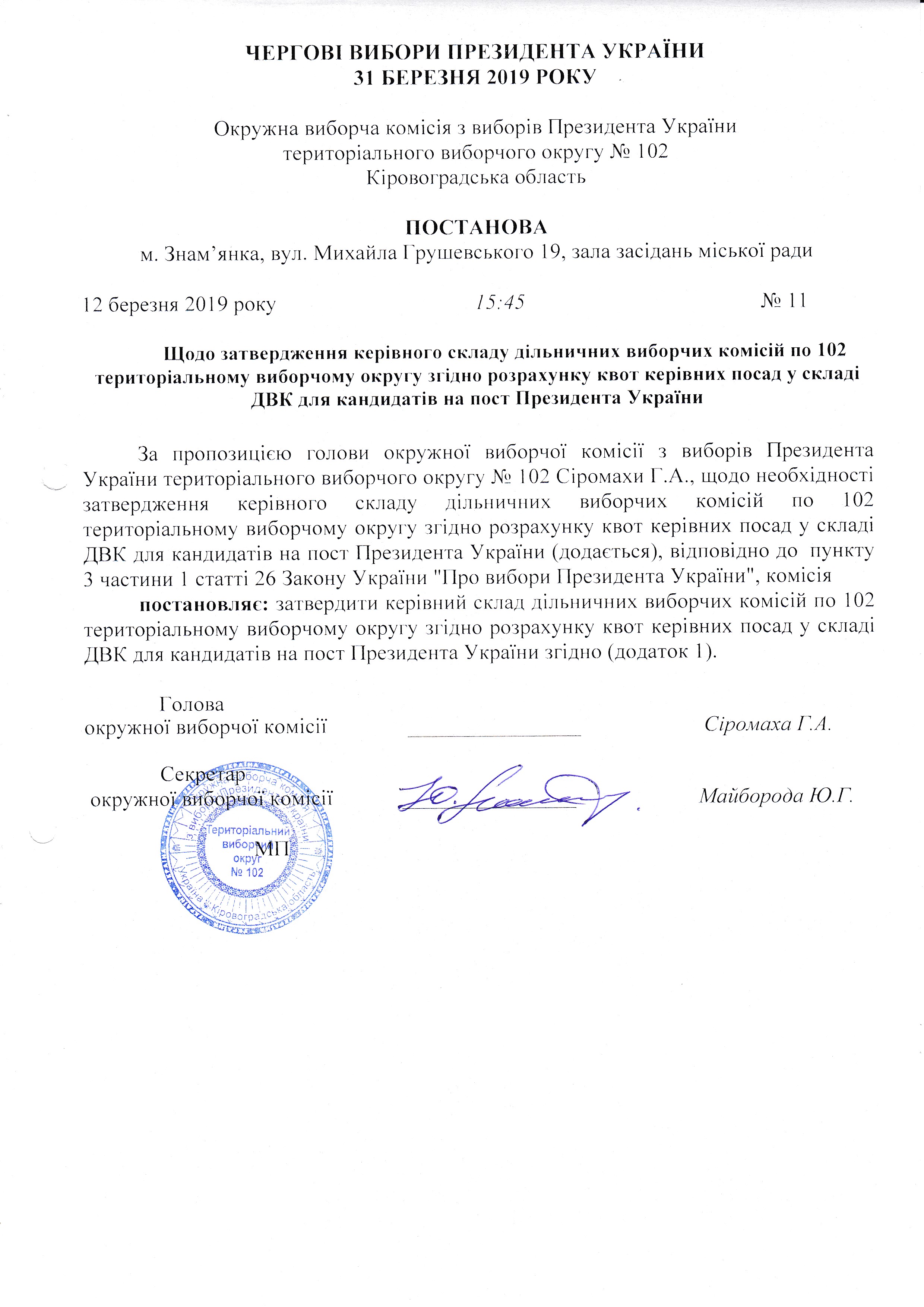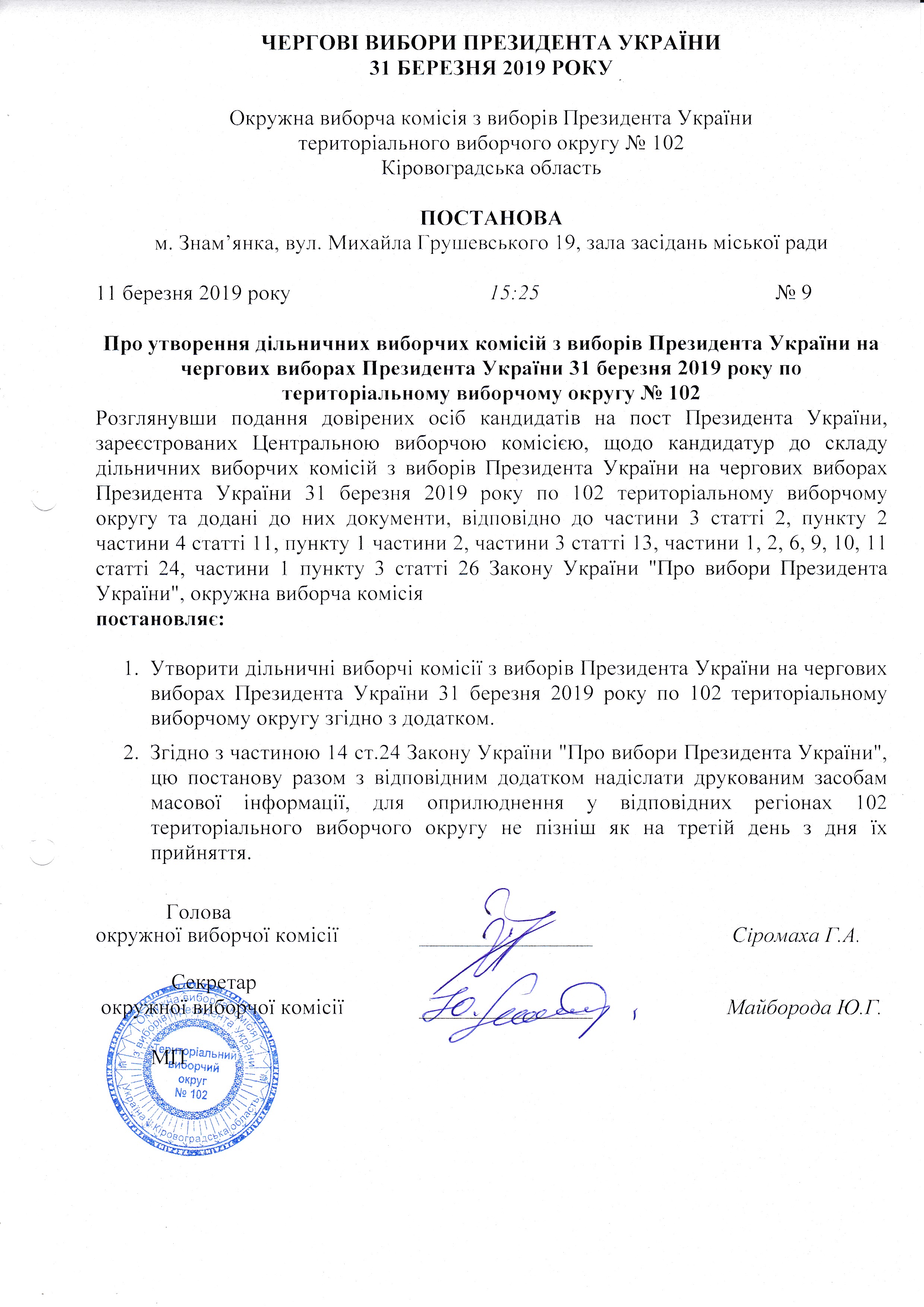 Про утворення дільничних виборчих комісій з виборів Президента України на чергових виборах Президента України 31 березня 2019 року по територіальному виборчому округу № 102 |
