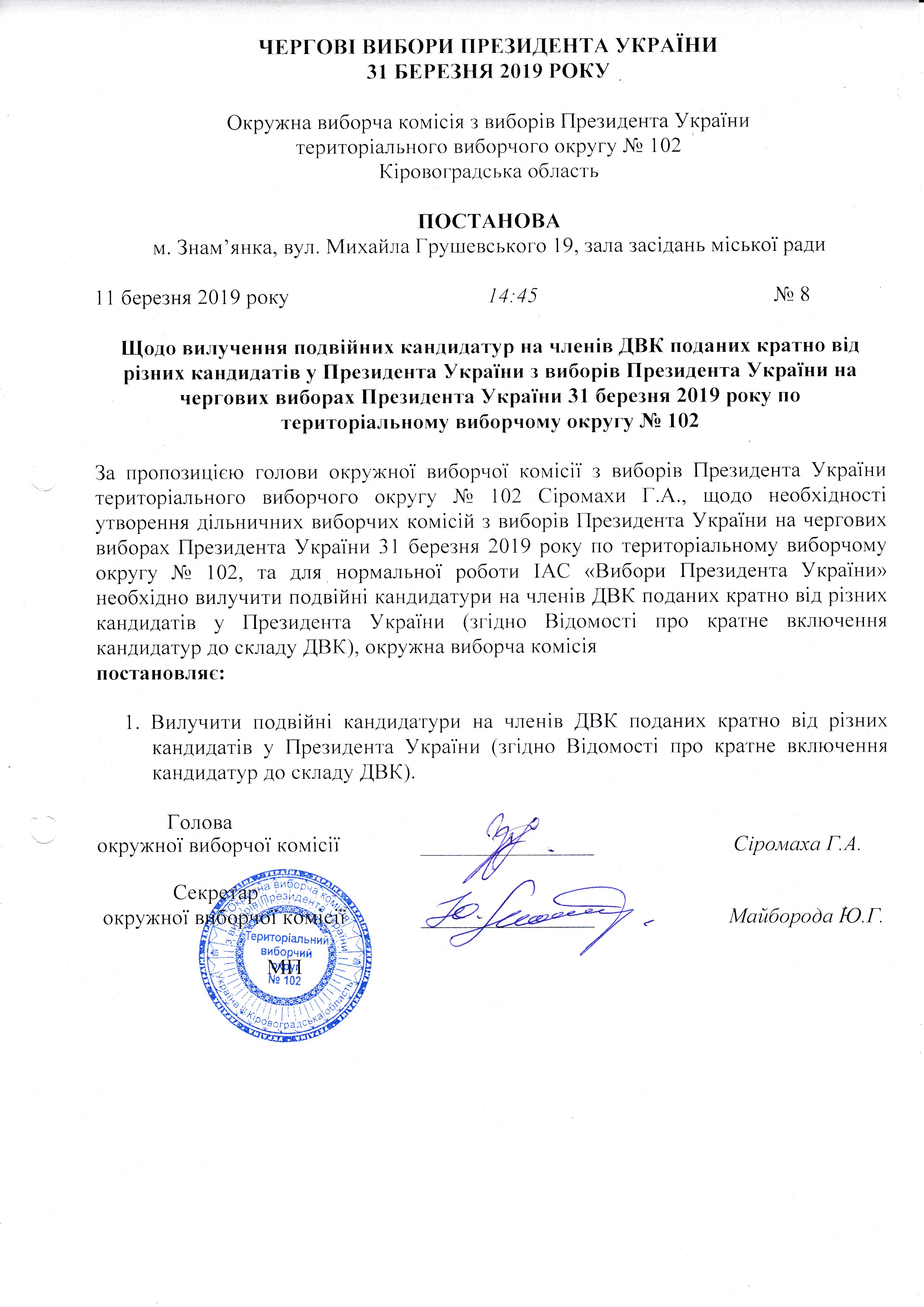 Щодо вилучення подвійних кандидатур на членів ДВК поданих кратно від різних кандидатів У Президента України з виборів Президента України на чергових виборах Президента України 31 березня 2019 року по територіальному виборчому округу № 102 |