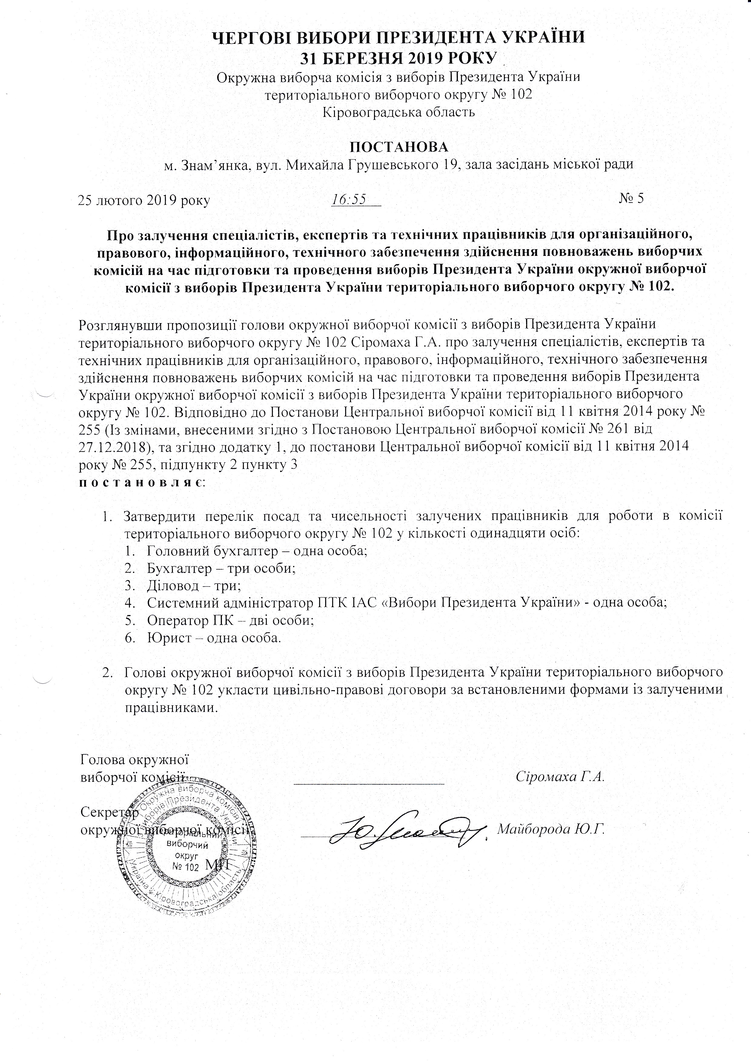 Про залучення спеціалістів, експертів та технічних працівників для організаційного, правового, інформаційного, технічного забезпечення здійснення повноважень виборчих комісій на час підготовки та проведення виборів Президента України окружної виборчої комісії з виборів Президента України територіального виборчого округу № 102 |