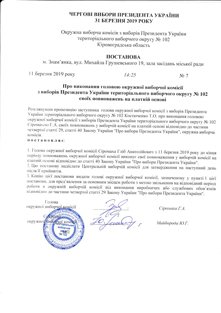 Про виконання головою окружної виборчої комісії з виборів Президента України територіального виборчого округу № 102 своїх повноважень на платній основі |