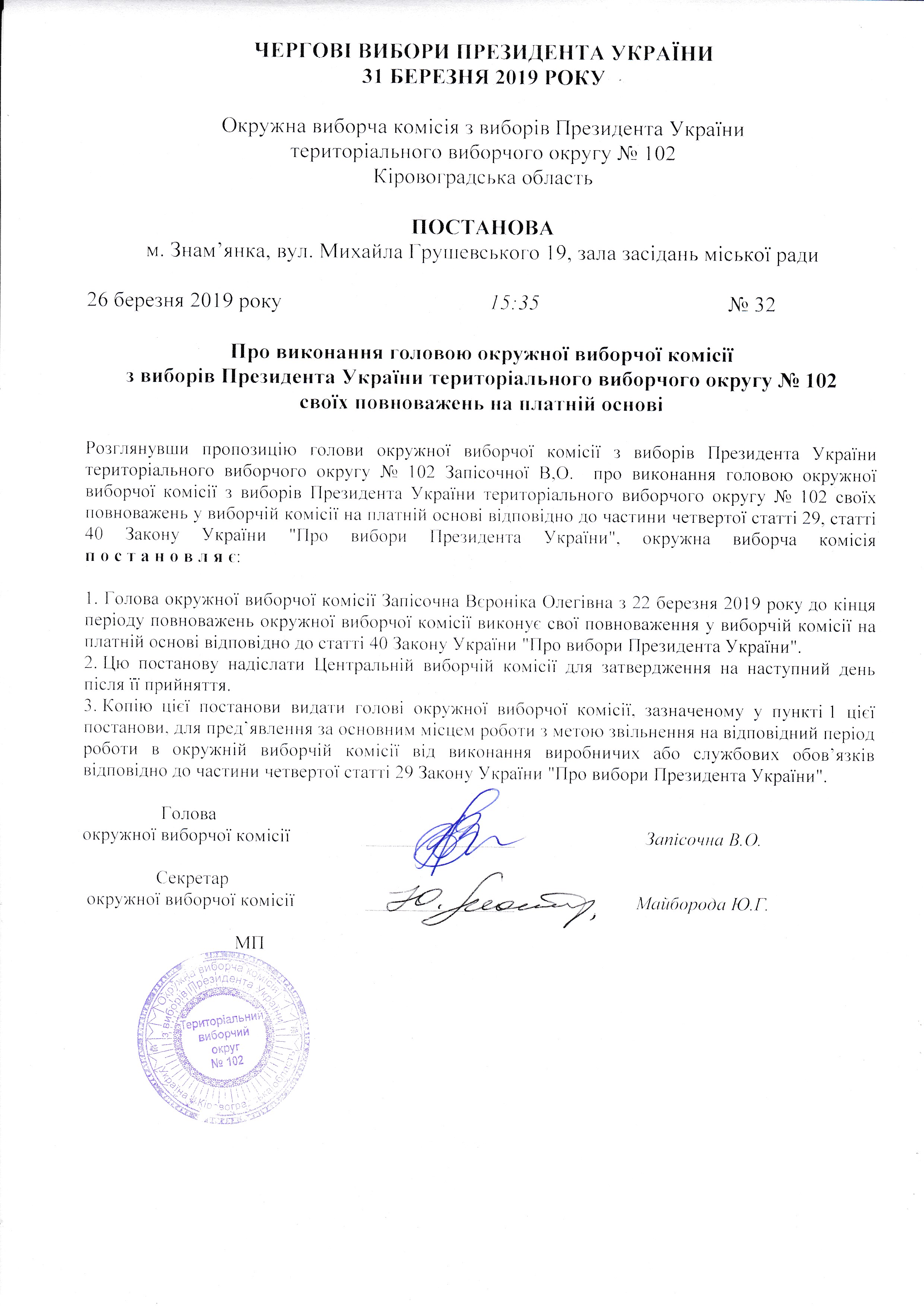 Про виконання головою окружної виборчої комісії з виборів Президента України територіального виборчого округу №102 своїх повноважень на платній основі |