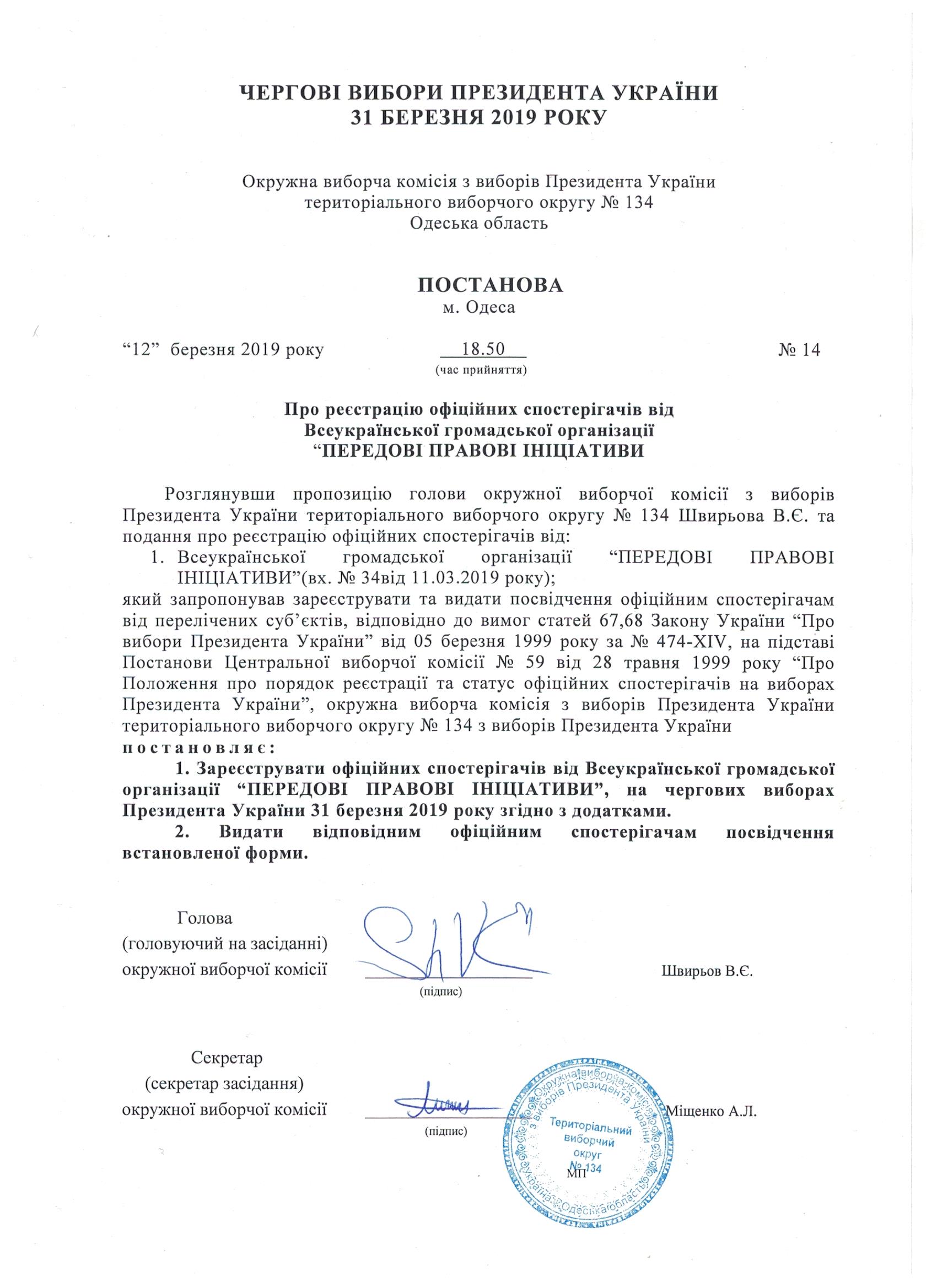 Про реєстрацію офіційних спостерігачів від Всеукраїнської громадської організації "ПЕРЕДОВІ ПРАВОВІ ІНІЦІАТИВИ" |