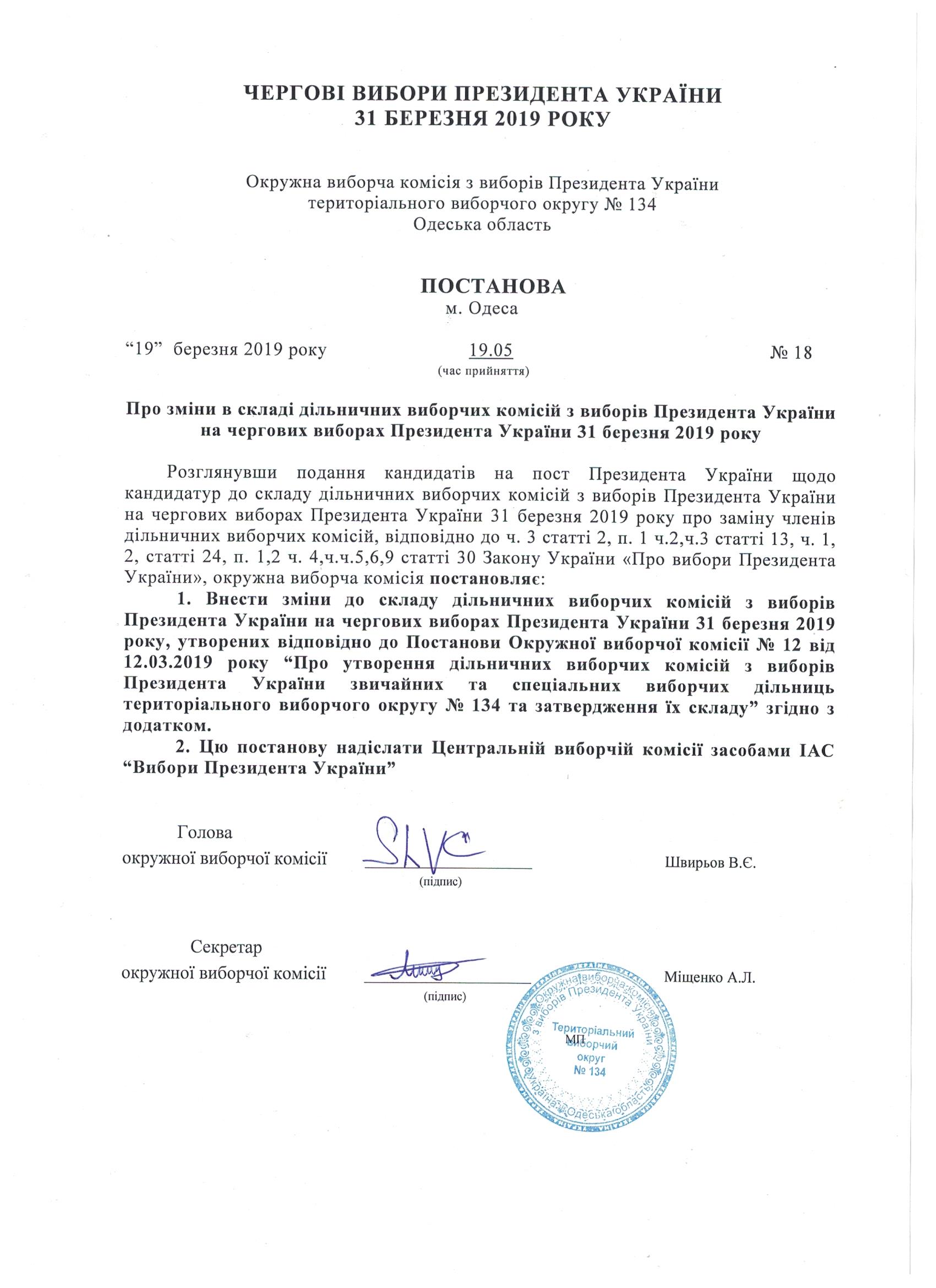 Про зміни в складі дільничих виборчих комісій з виборів Президента України на чергових виборах Президента України 31 березня 2019 року |