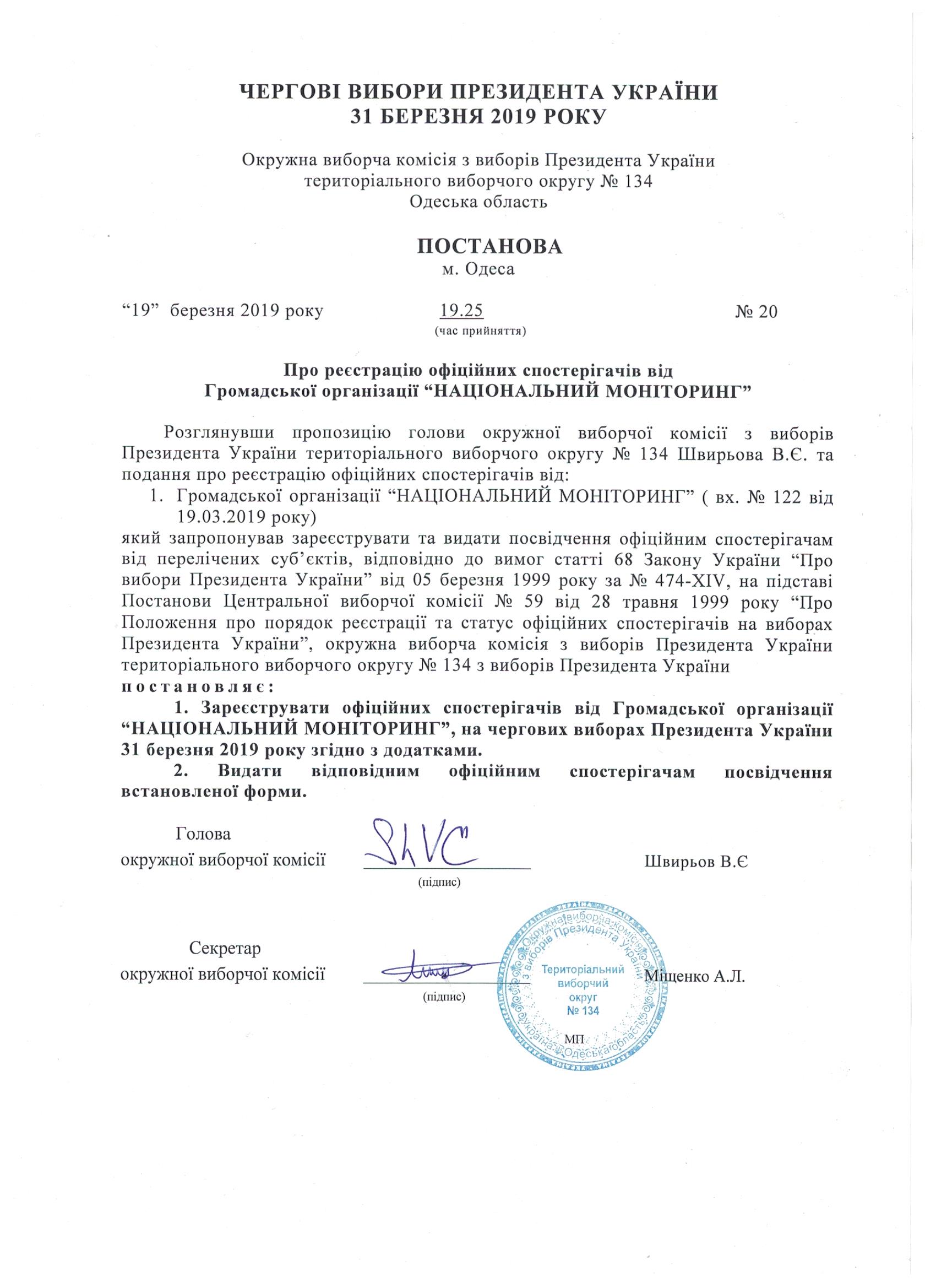 Про реєстрацію офіційних спостерігачів від громадської організації "НАЦІОНАЛЬНИЙ МОНІТОРІНГ" |