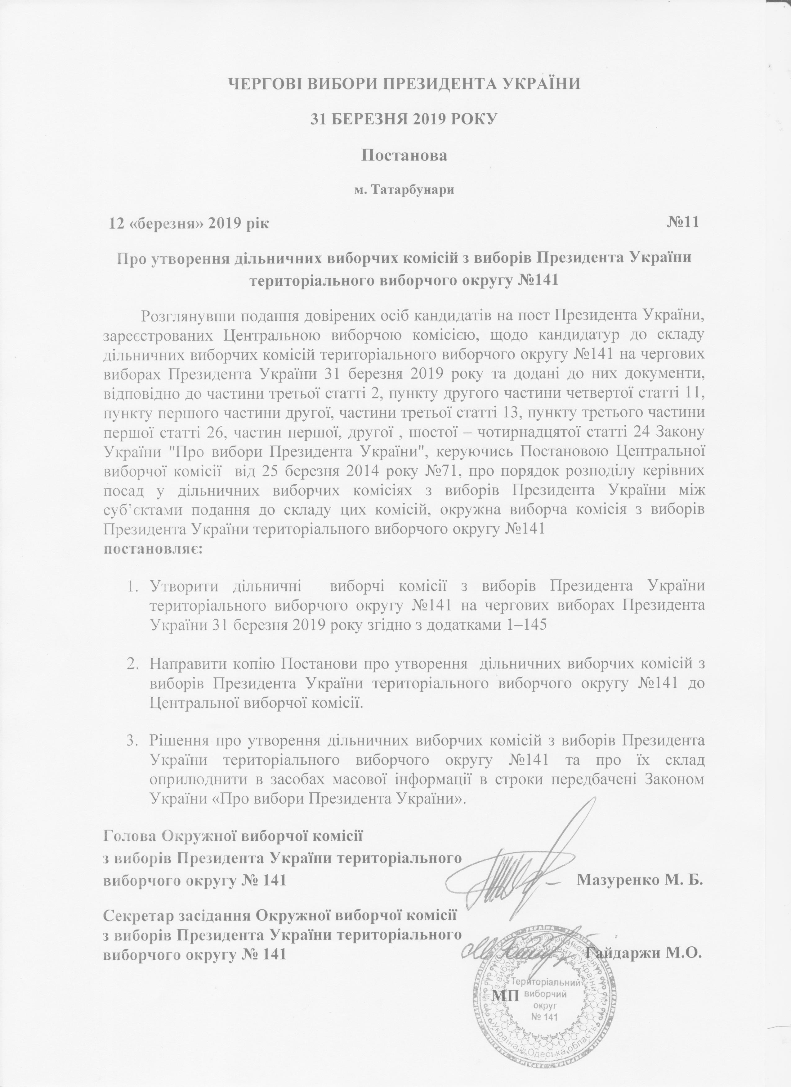 | 11 від 12.03.2019 | Постанова ОВК | Про утворення дільничних виборчих комісій з виборів Президента України територіального виборчого округу № 141 |
