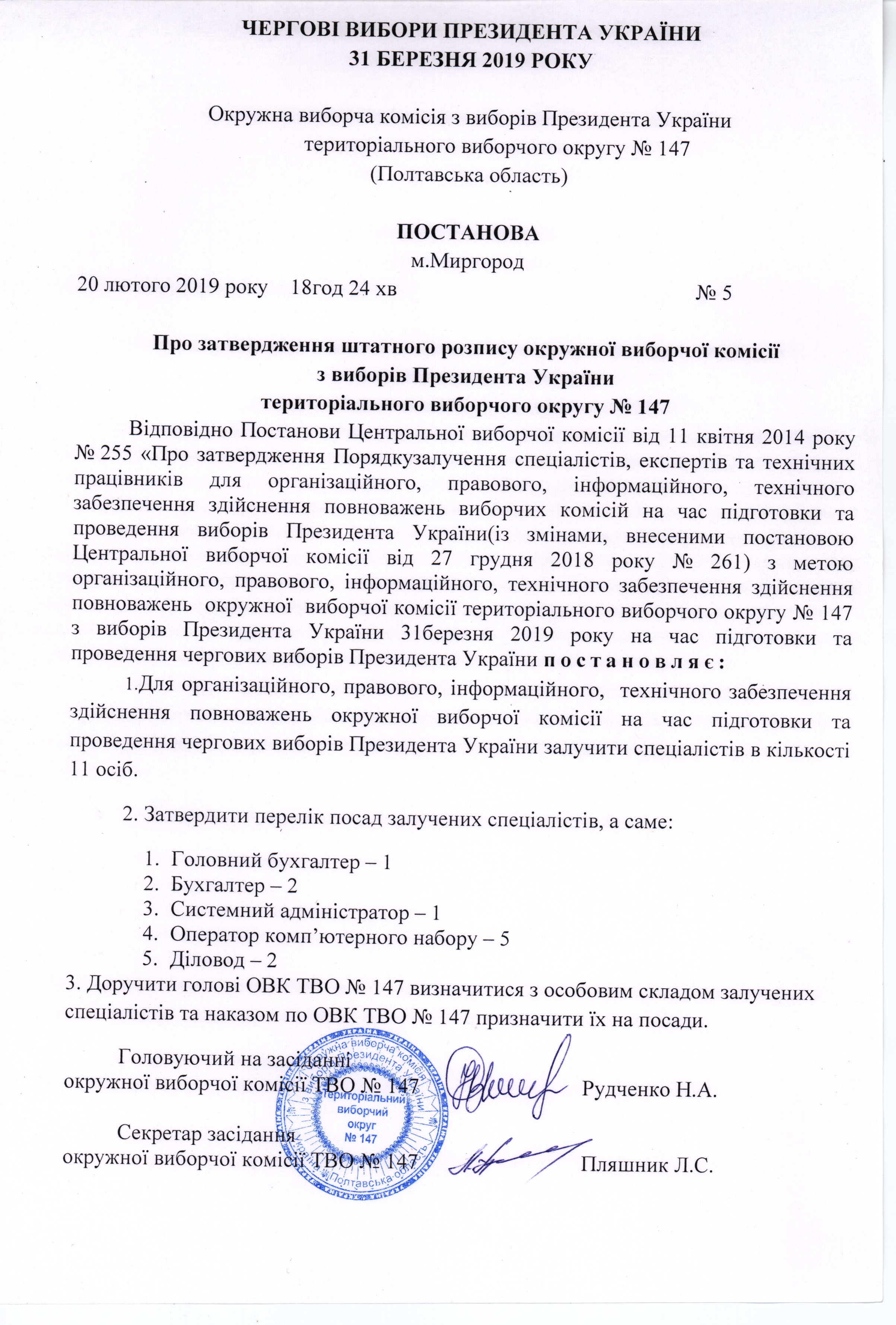 Про затвердження штатного розпису ОВК 147 |