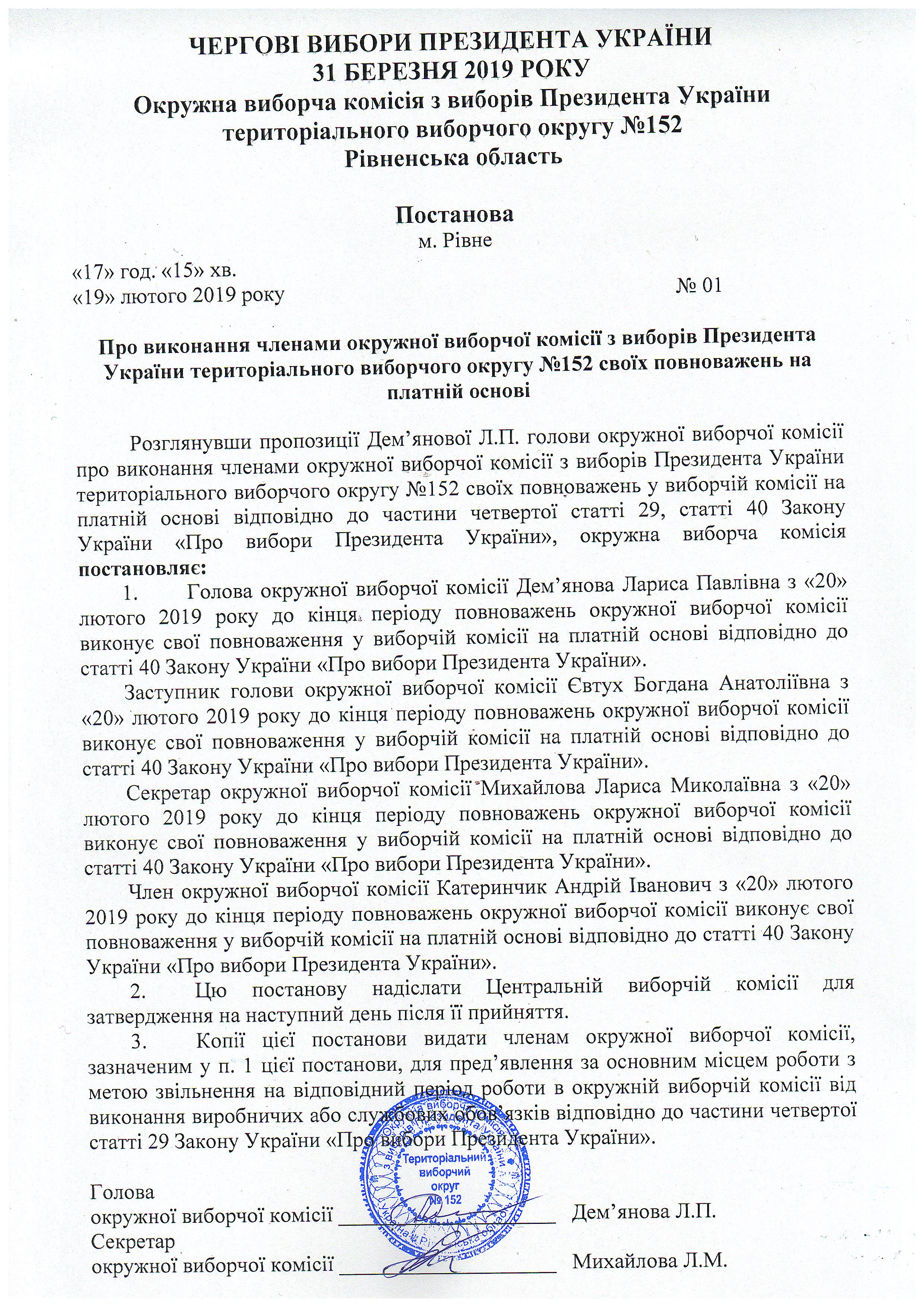 Про виконання членами окружної виборчої комісії з виборів Президента України територіального виборчого округу №152 своїх повноважень на платній основі |