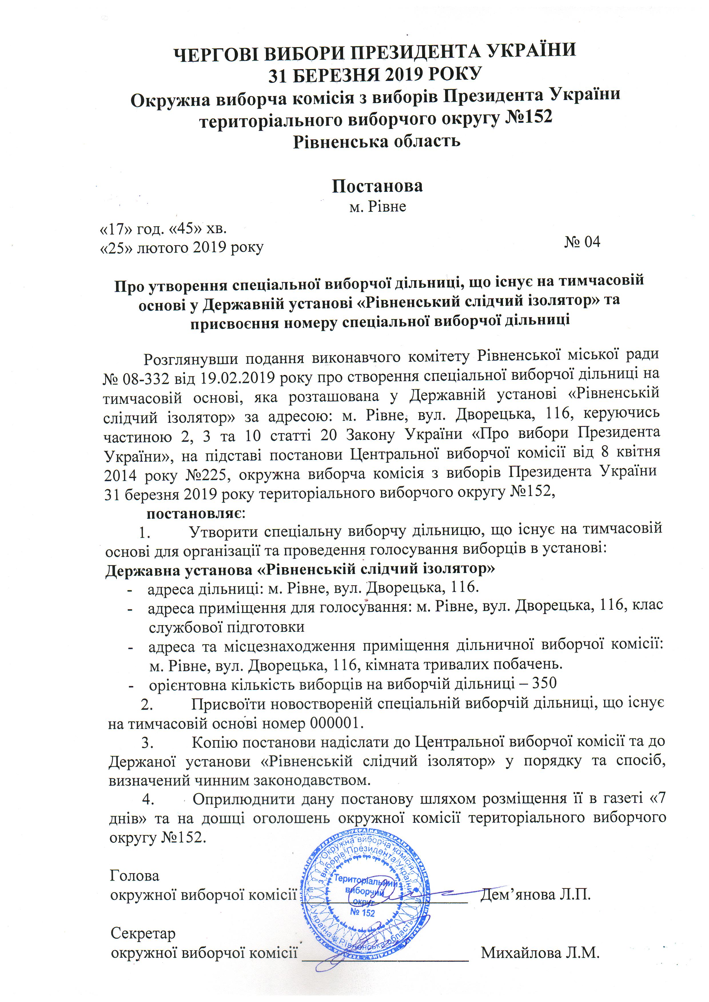 Про внесення змін по постанови №1 ОВК з виборів Президента України ТВО № 152 |