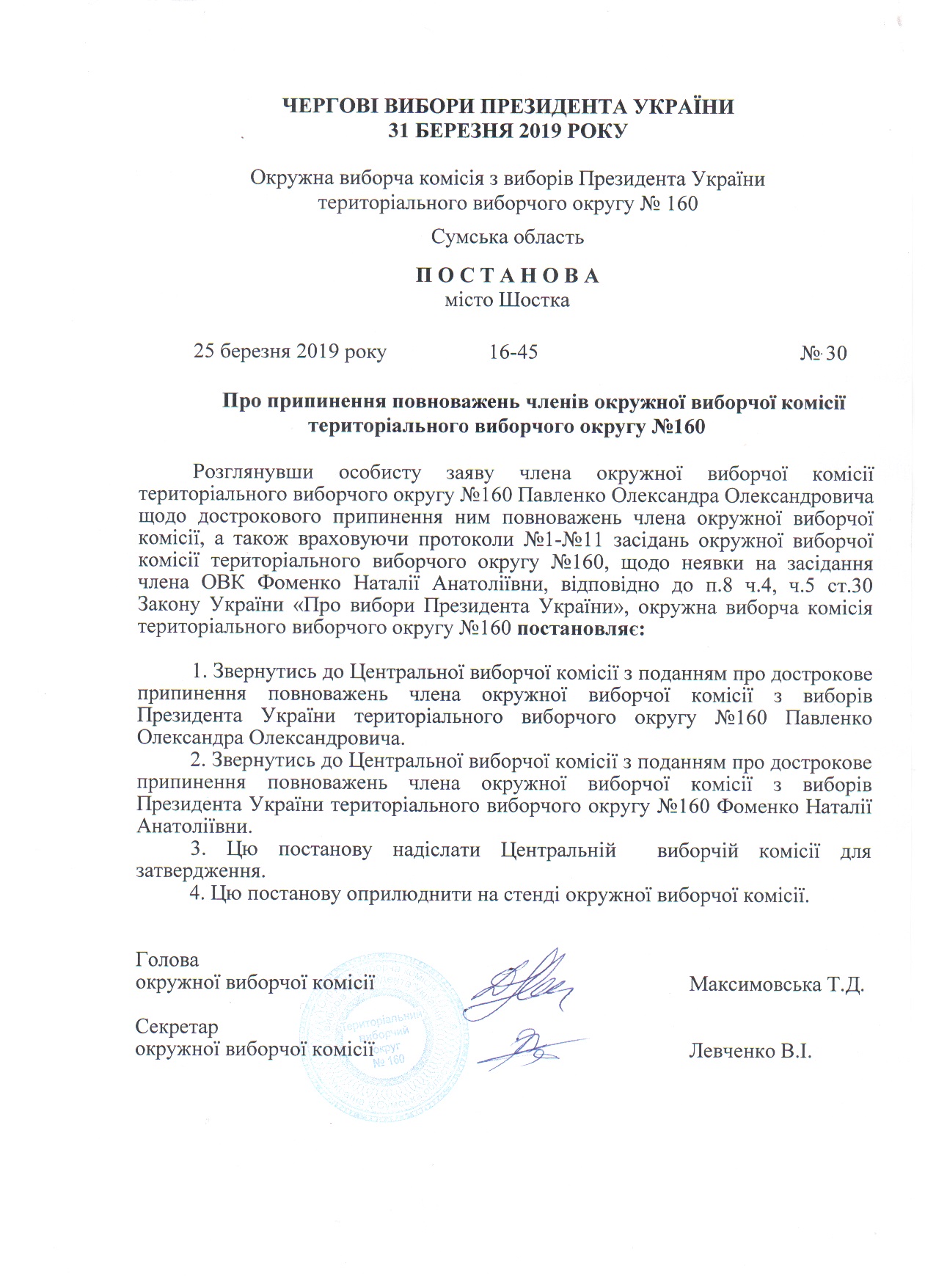Про припинення повоноважень членів окружної виборчої комісії ТВО №160 |