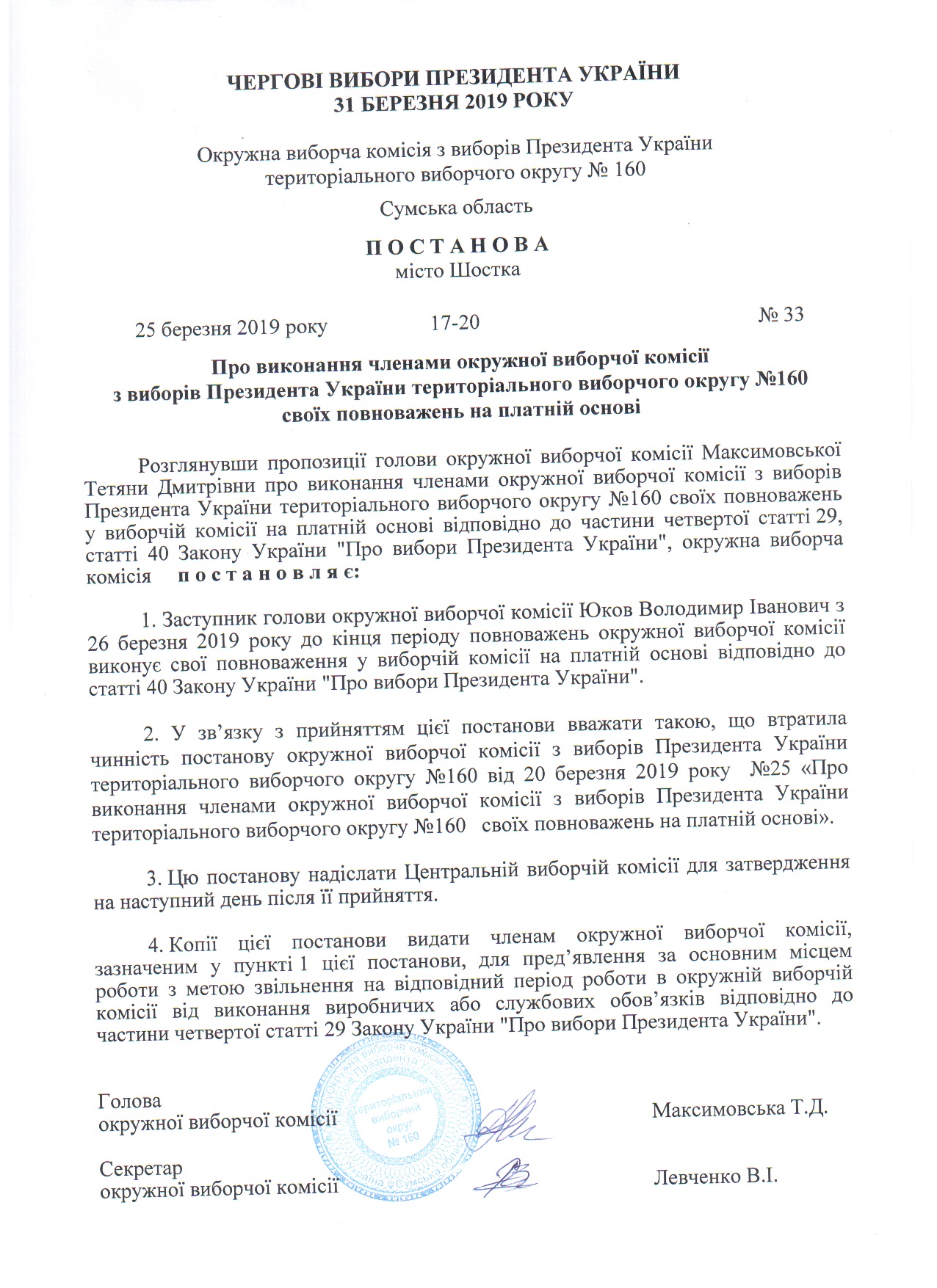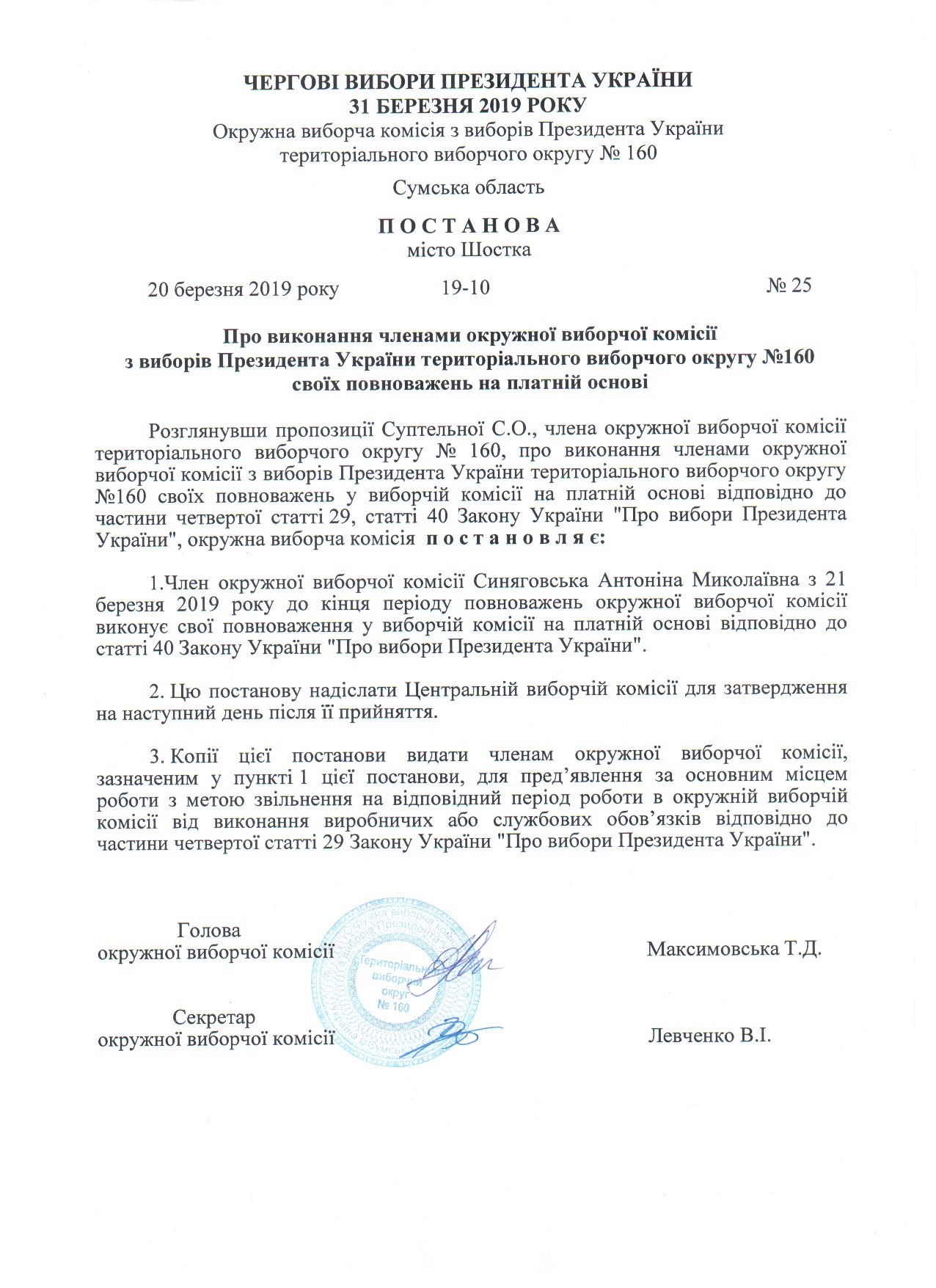 Про виконання членами окружної виброчої комісії з виборів Президента України територіального виборчого округу № 160 своїх повноважень на платній основі |