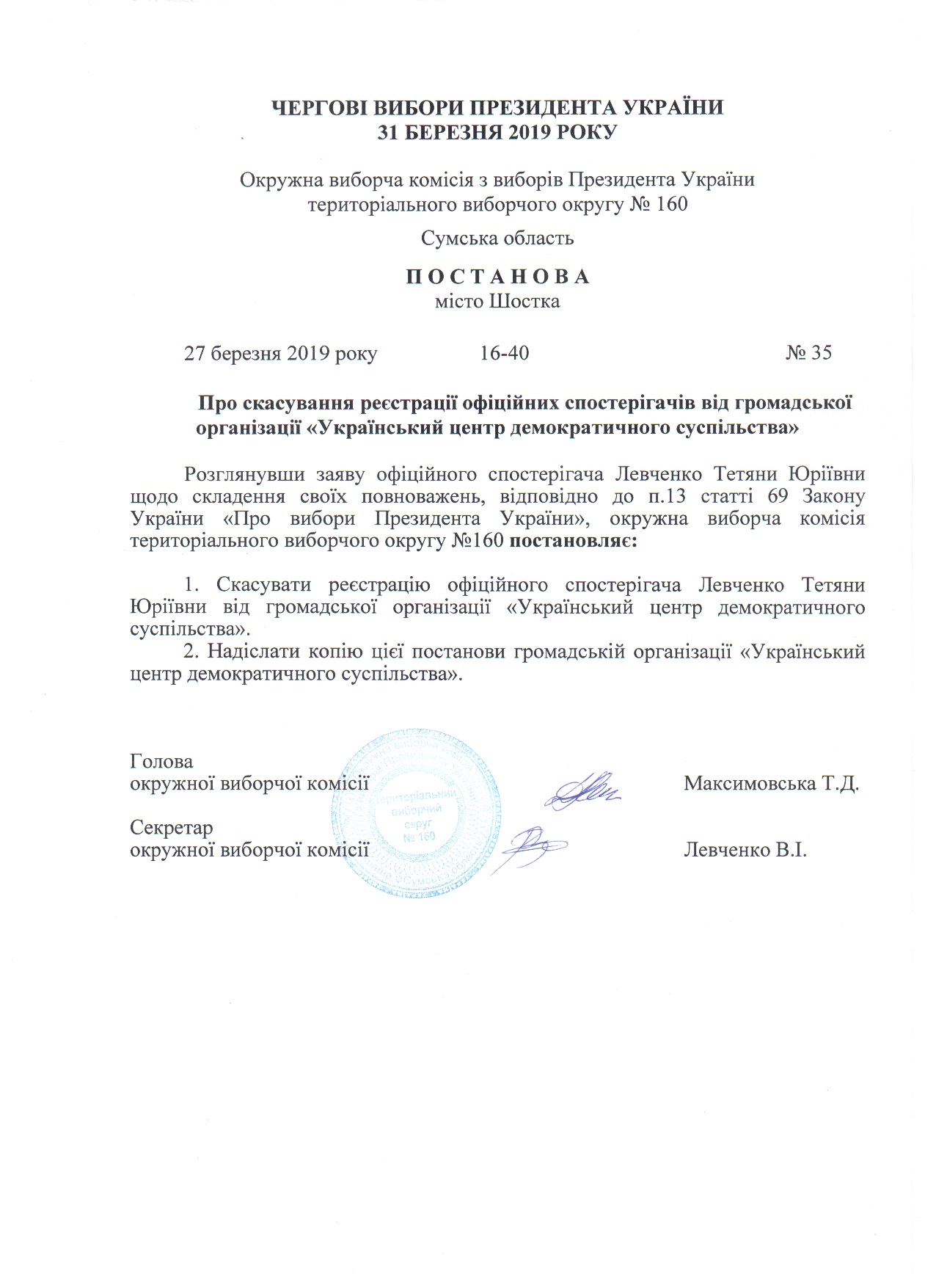 Про скасування реєстрації офіційних спостерігачів від громадських організації "Український центр демократичного суспільства" |