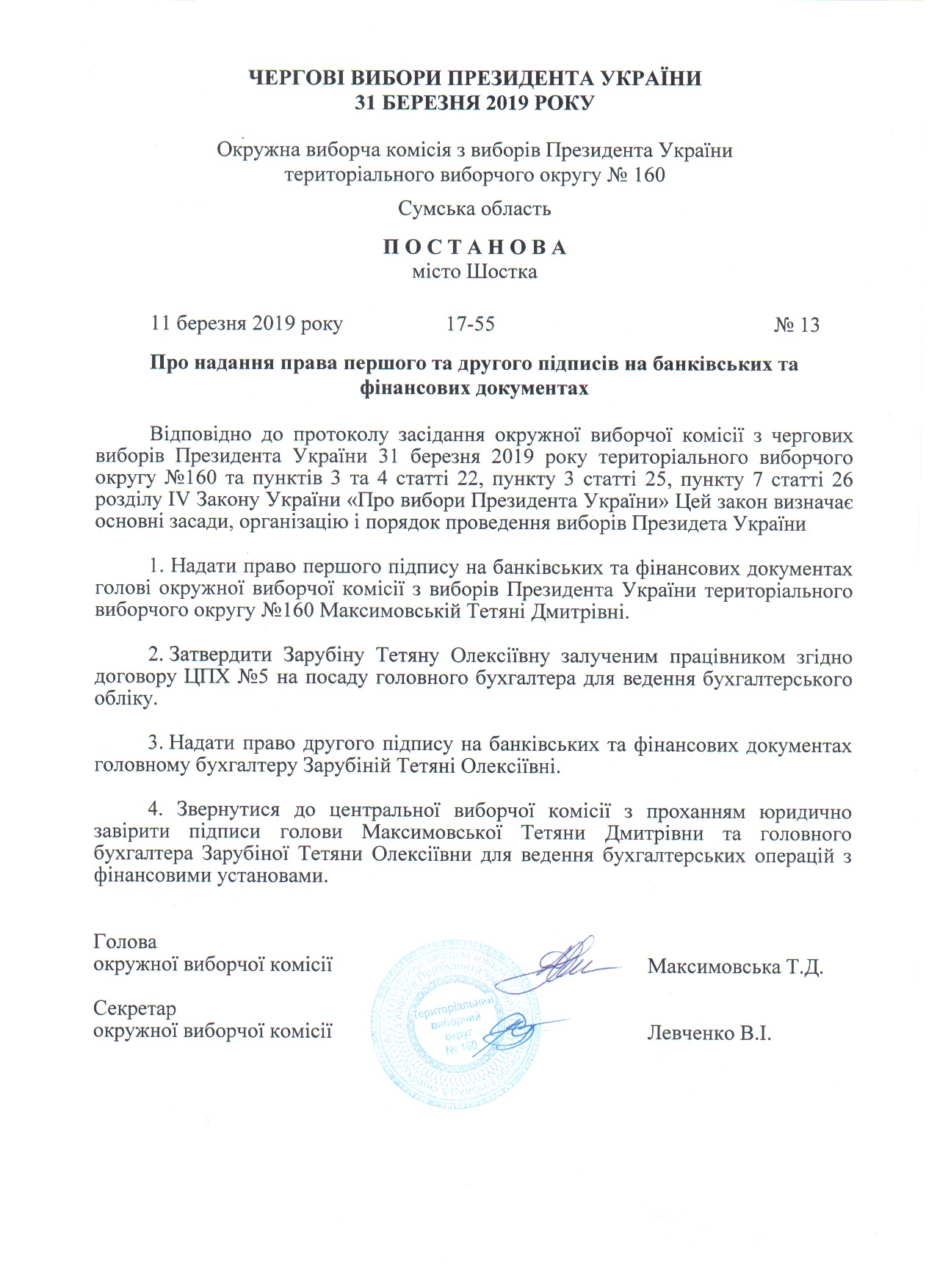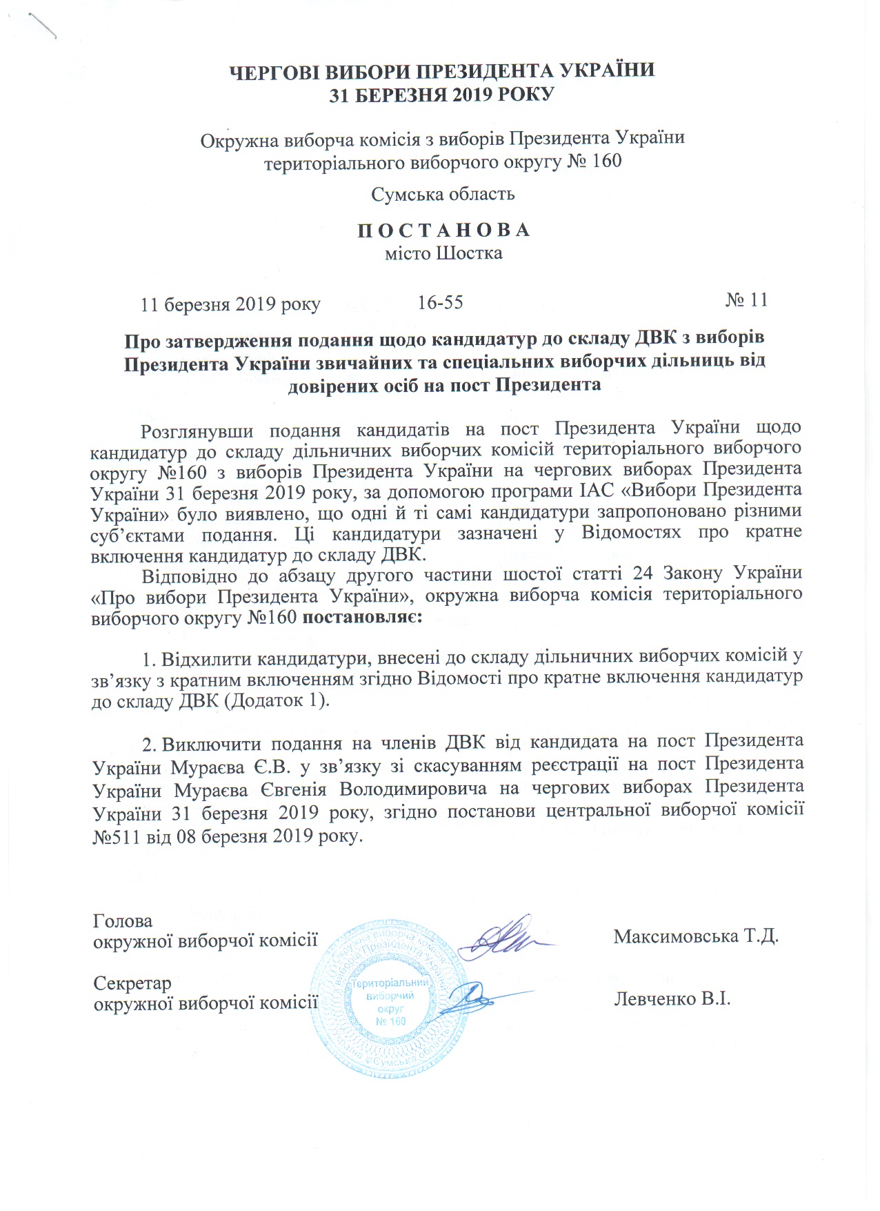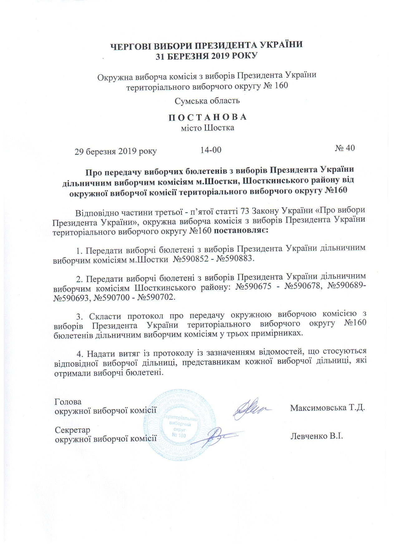 Про передачу виборчих бюлетенів з виборів Перзидента України дільничним виборчим комісіям м.Шостки, Шосткинському району від ОВК ТВО № 160 |