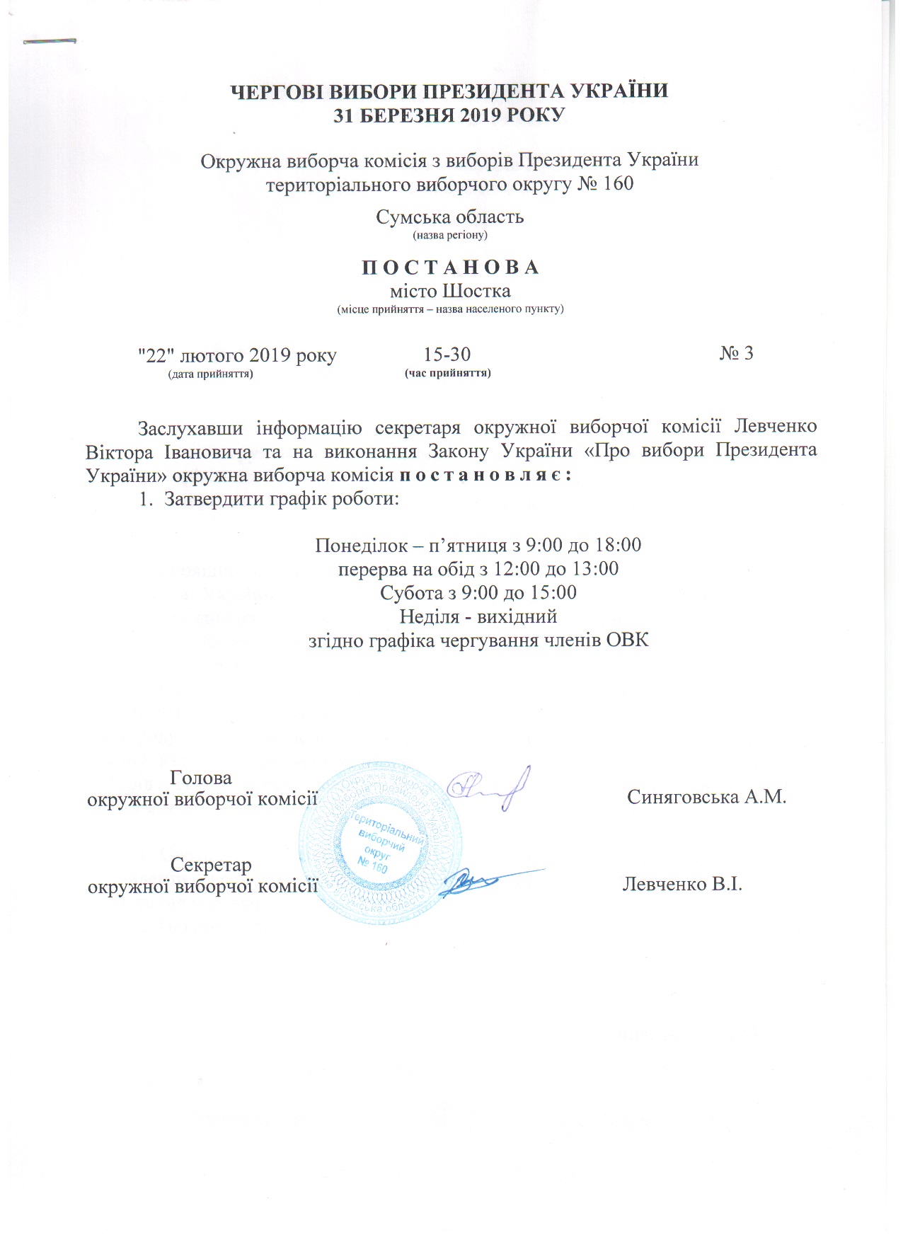 Про затвердження графіку роботи ОВК з виборів Президента України ТВО № 160 |