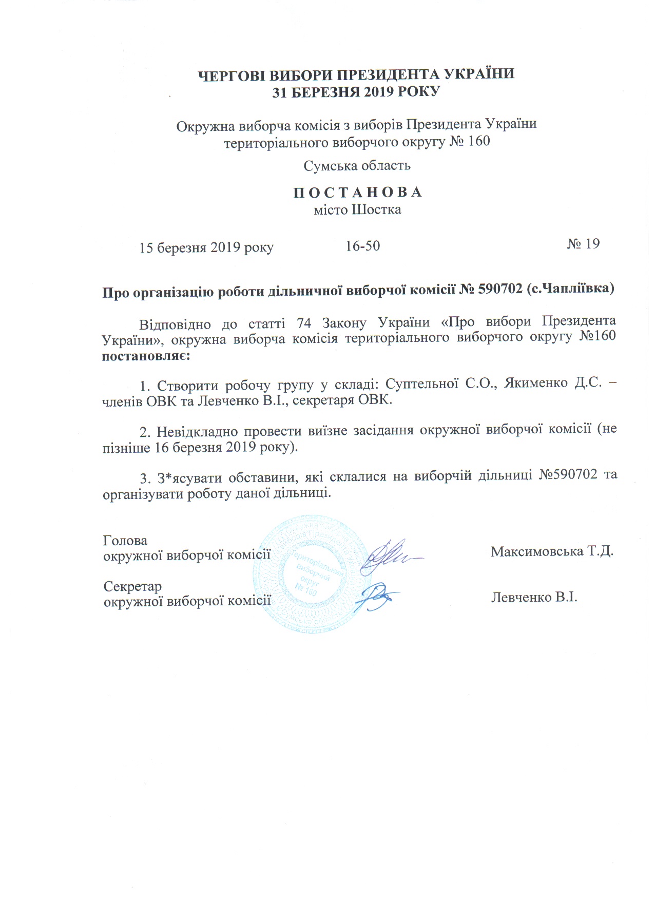 Про організацію роботи дільничної виборчої комісії № 590702 (с. Чапліївка) |
