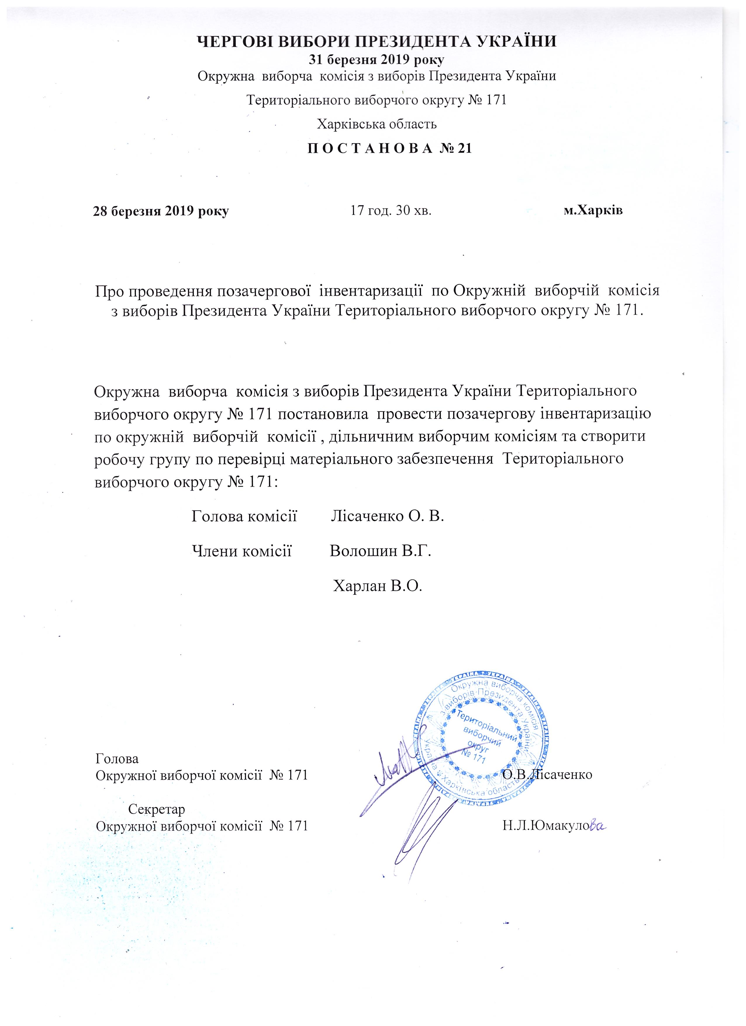 Про проведення позачергової інвентаризації по Окружній виборчій комісії з виборів Президента України Територіального виборчого округу №171 |
