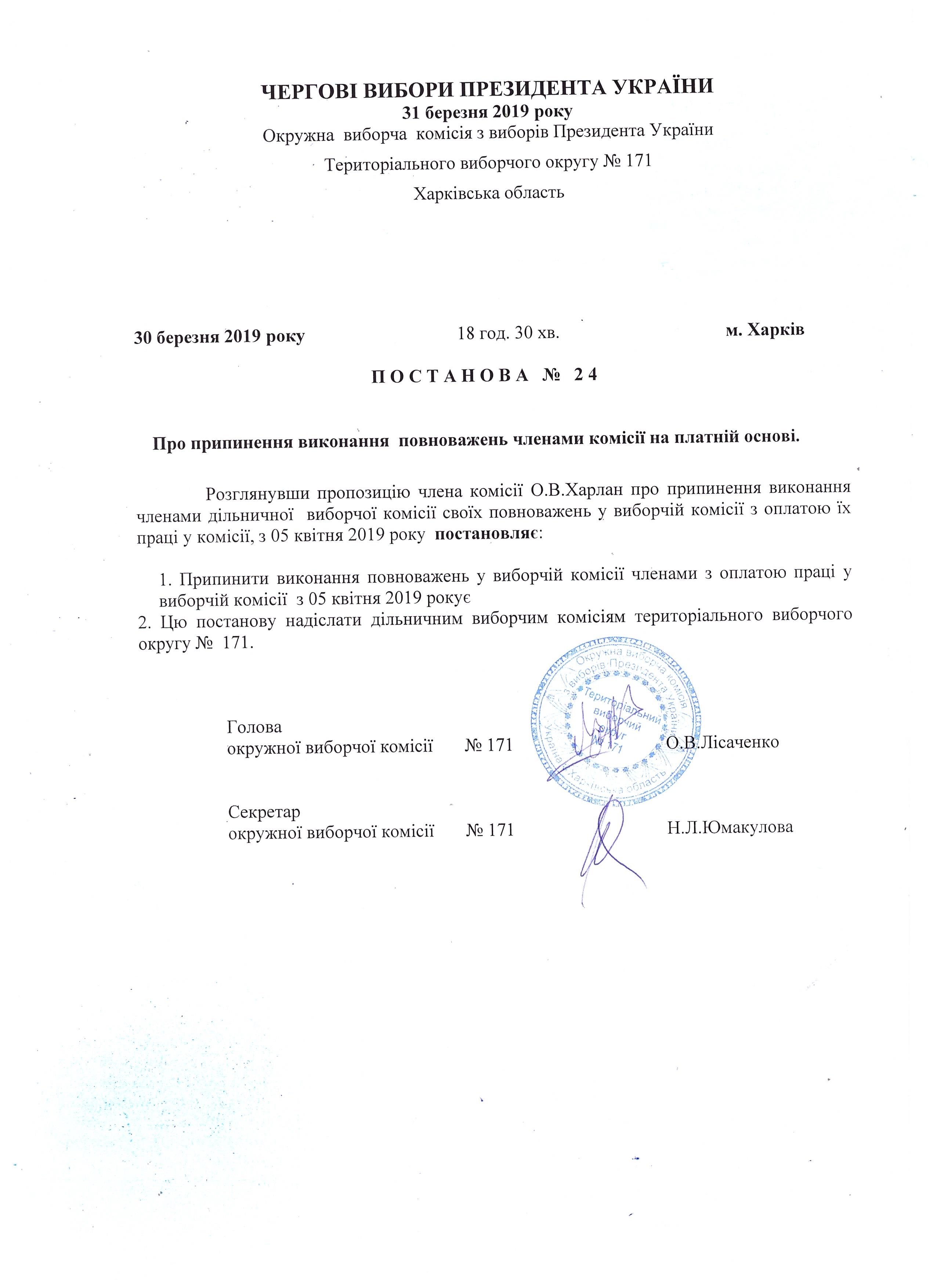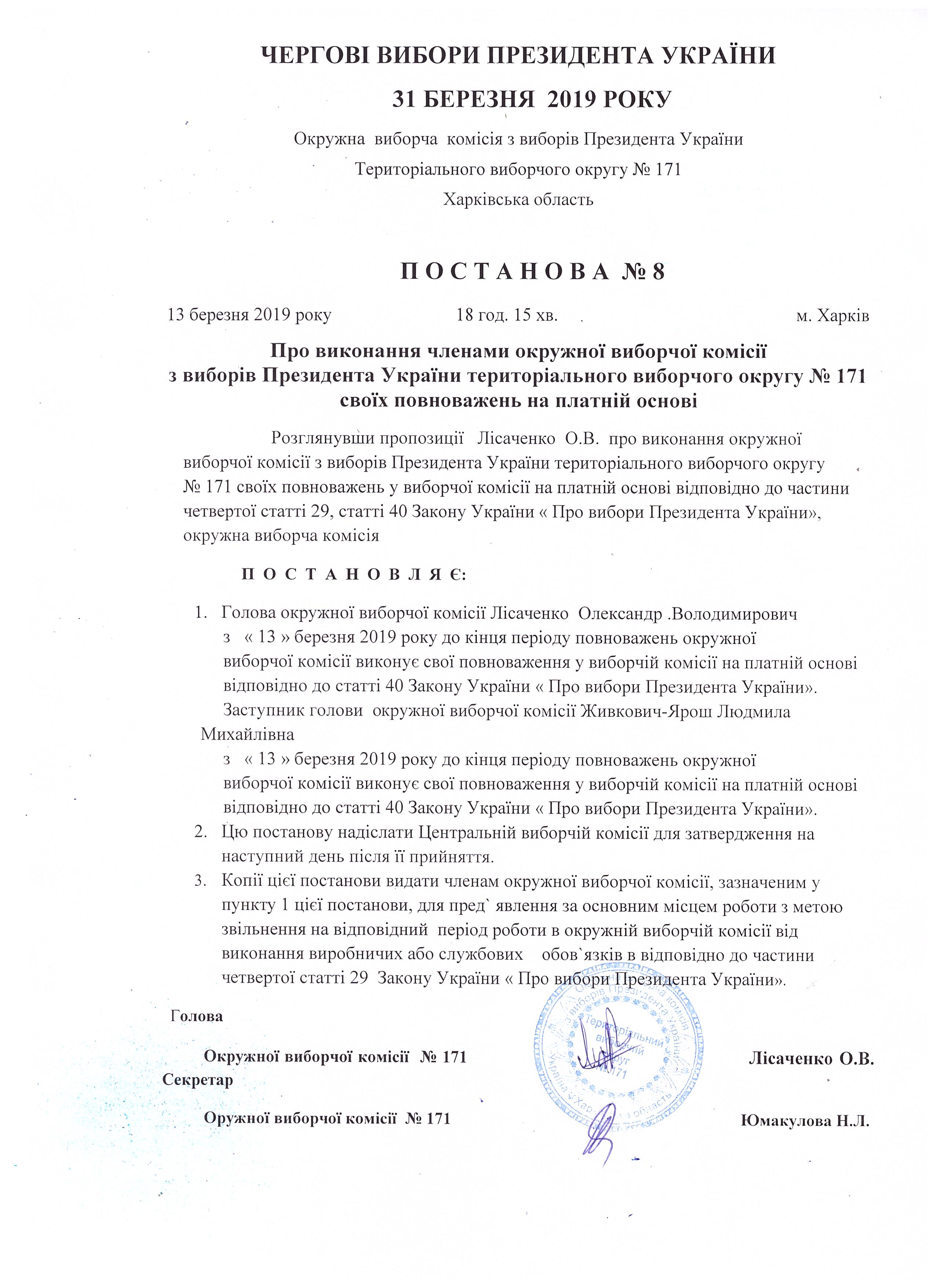 Про виконання членами окружної виборчої комісії з виборів Президента України територіального виборчого округу №171 своїх повноважень на платній основі |