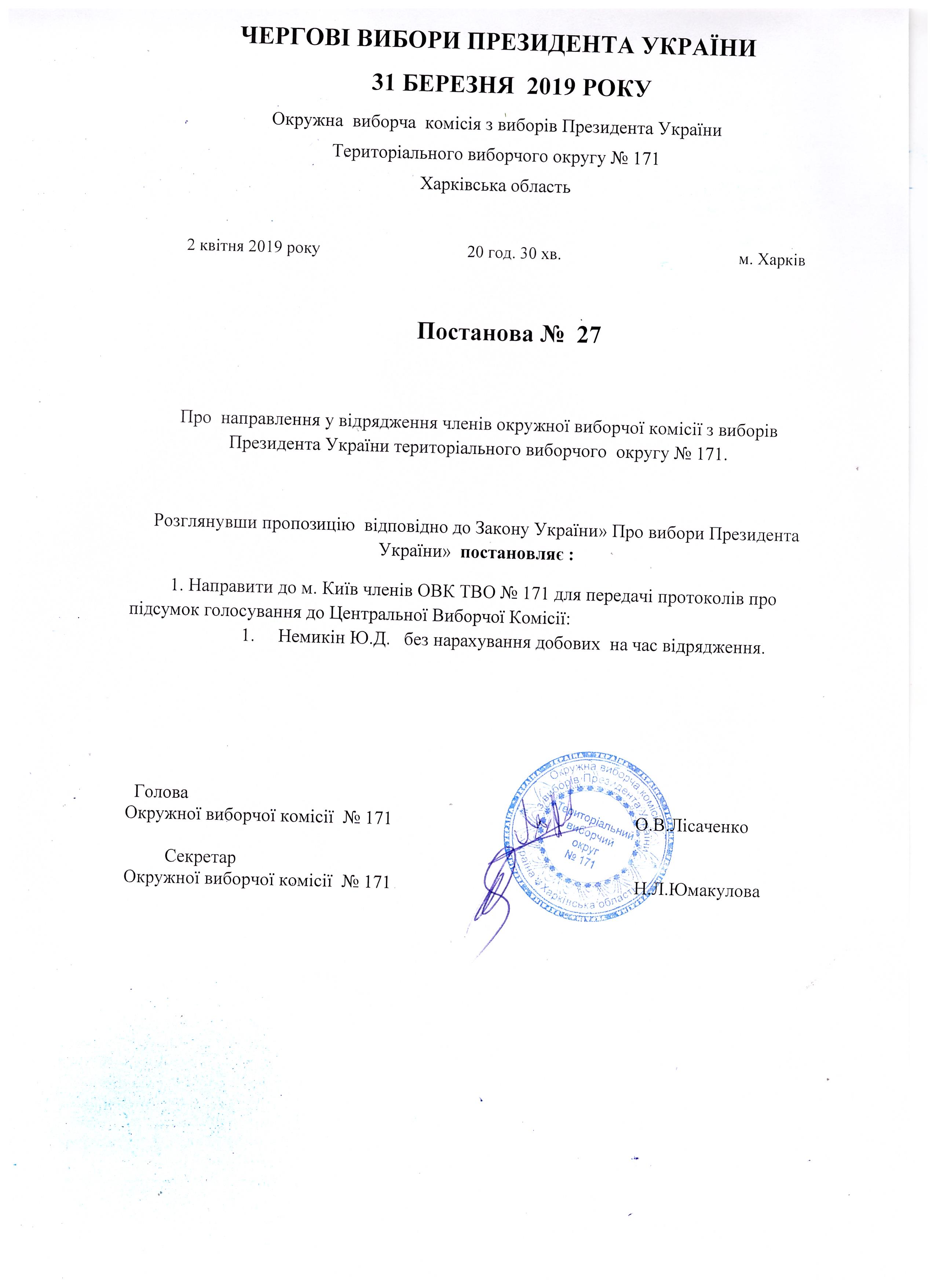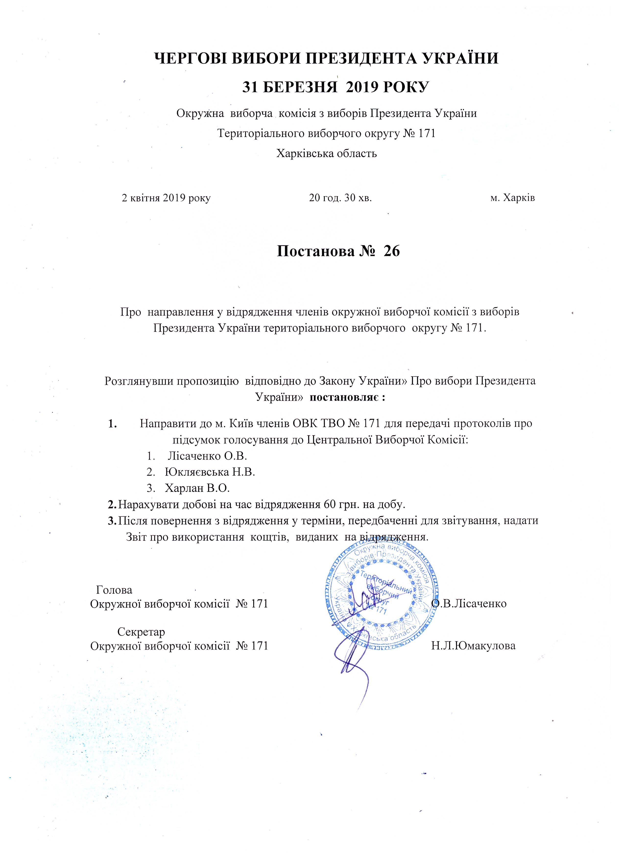 Про направлення у відрядження членів окружної виборчої комісії з виборів Президента України територіального виборчого округу №171 |