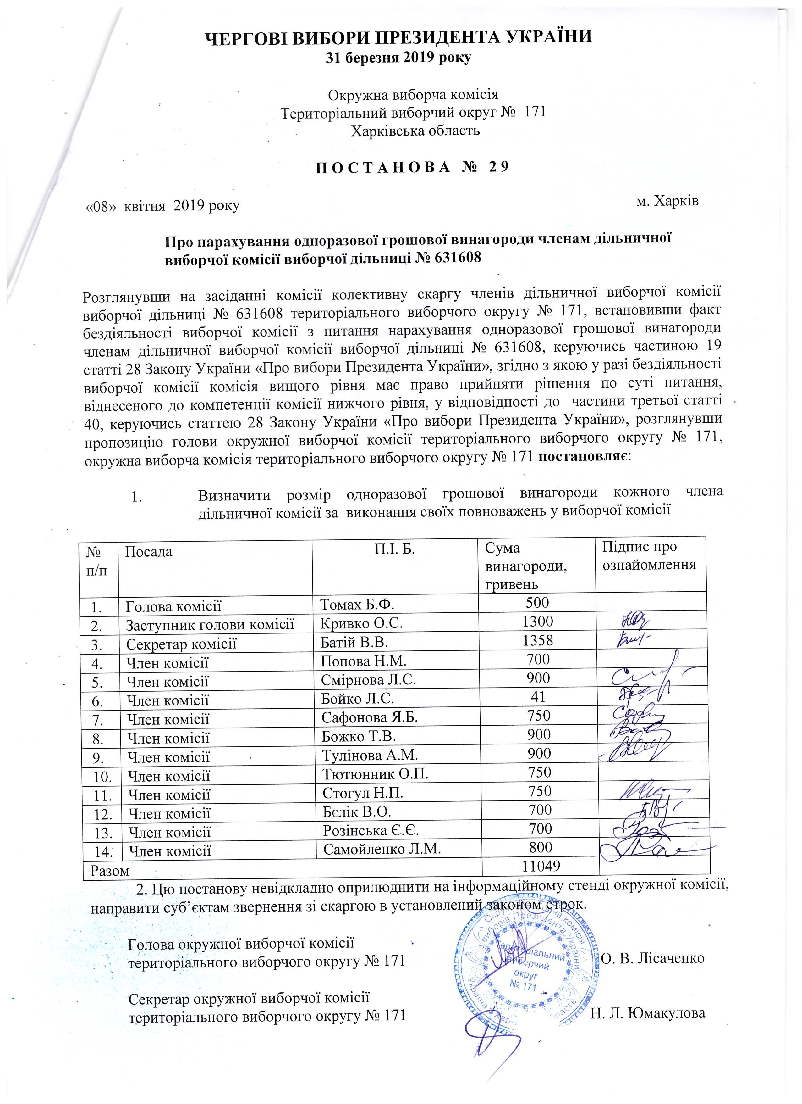 Про нарахування одноразової грошової винагороди членам дільничної виборчої комісії виборчої дільниці № 631608 |