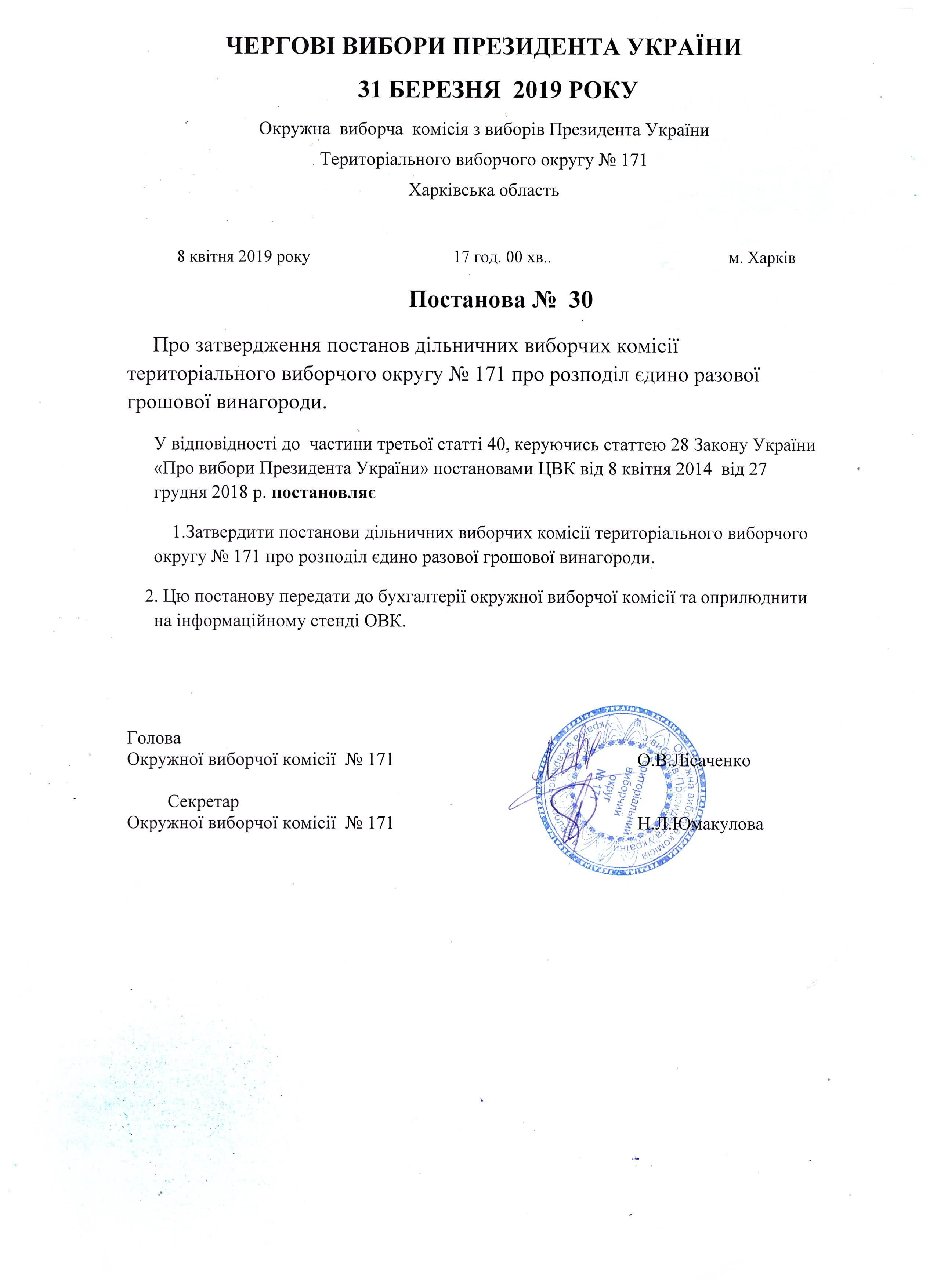 Про затвердження постанов дільничних виборчих комісій територіального виборчого округу № 171 про розподіл єдиноразової грошової винагороди. |
