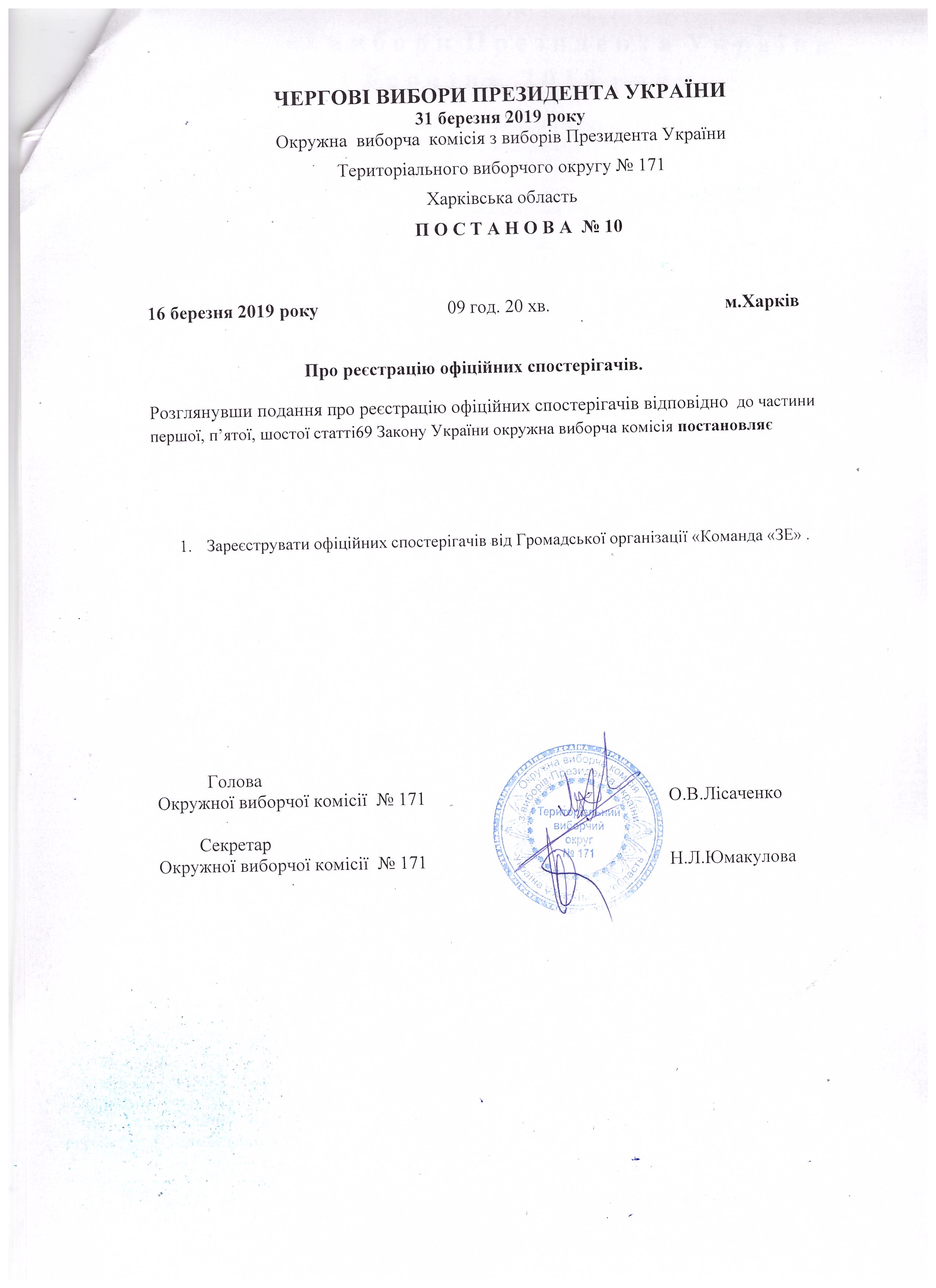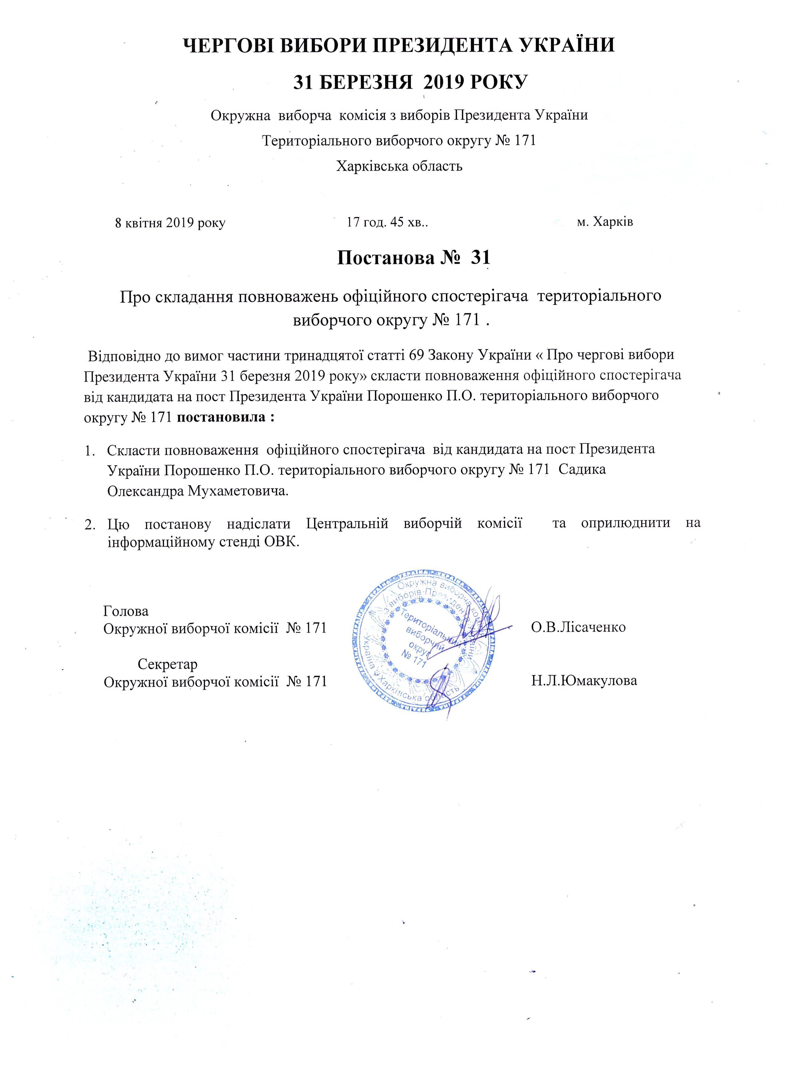 Про складання повноважень офіційного спостерігача теритіальнного виборчого округу № 171 |