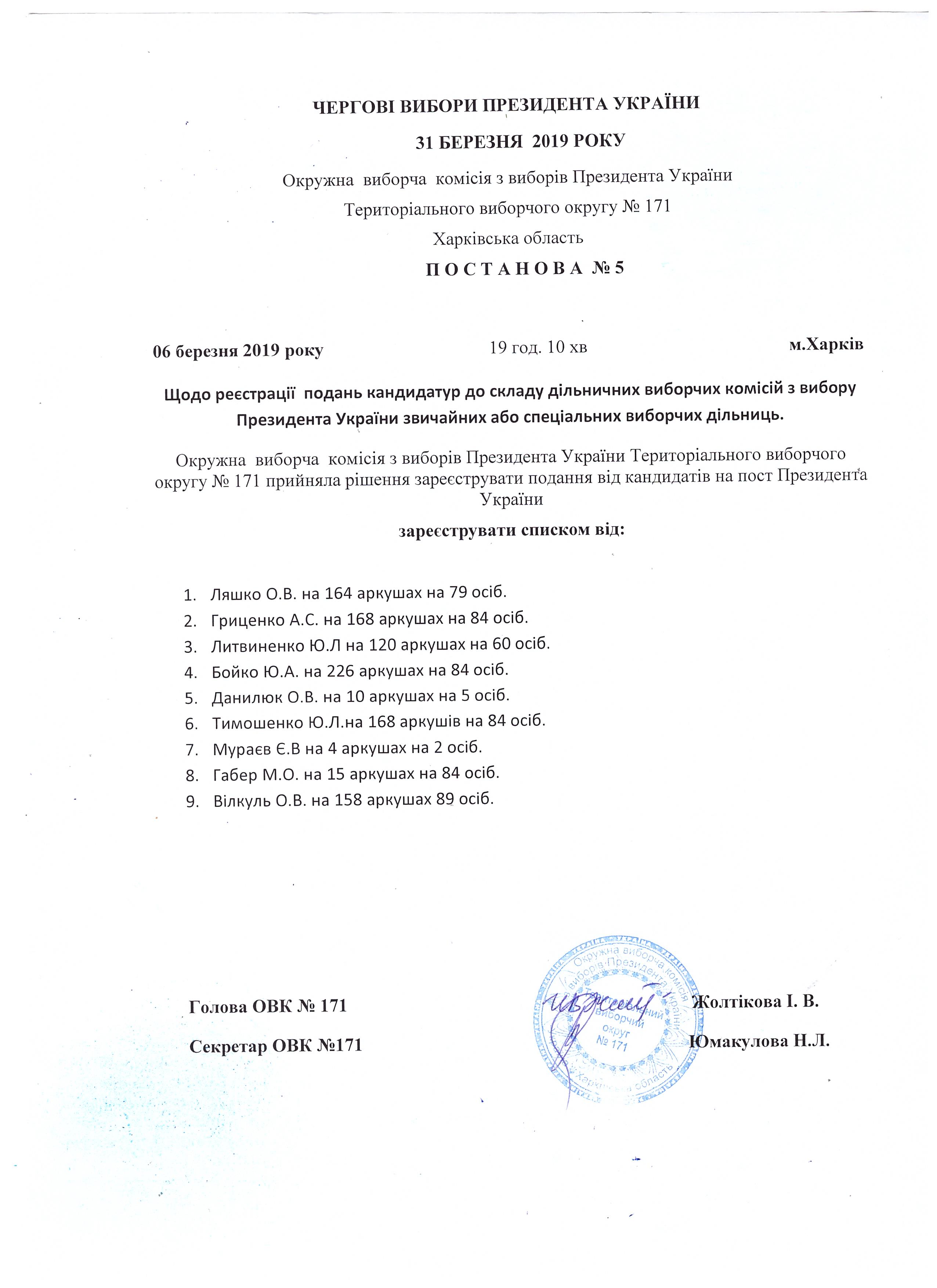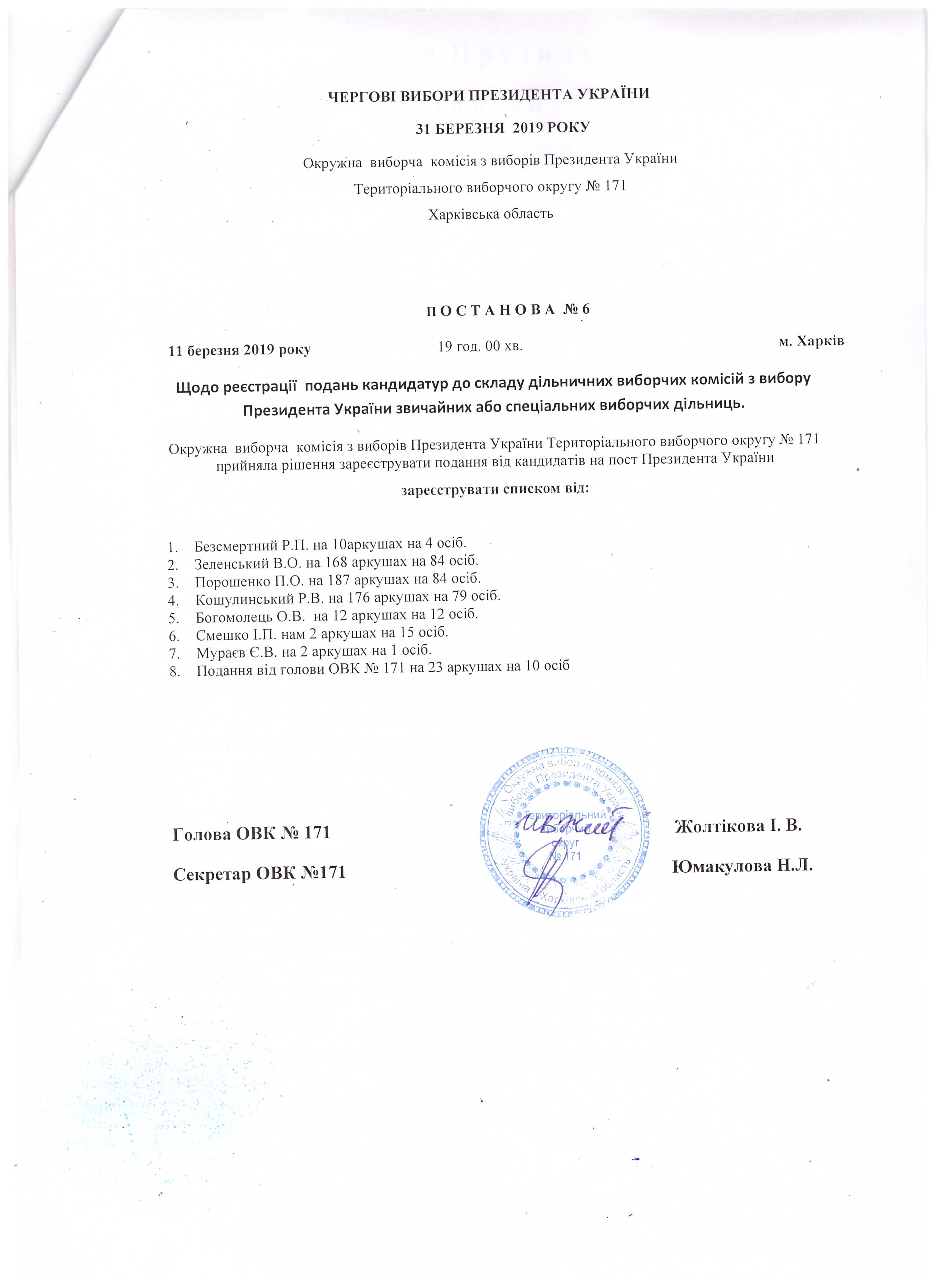 Про утворення дільничих виборчих комісій з Виборів Президента України на чергових виборах Президента України 31 березня 2019 року в Територіальному виборчому окрузі №171 |