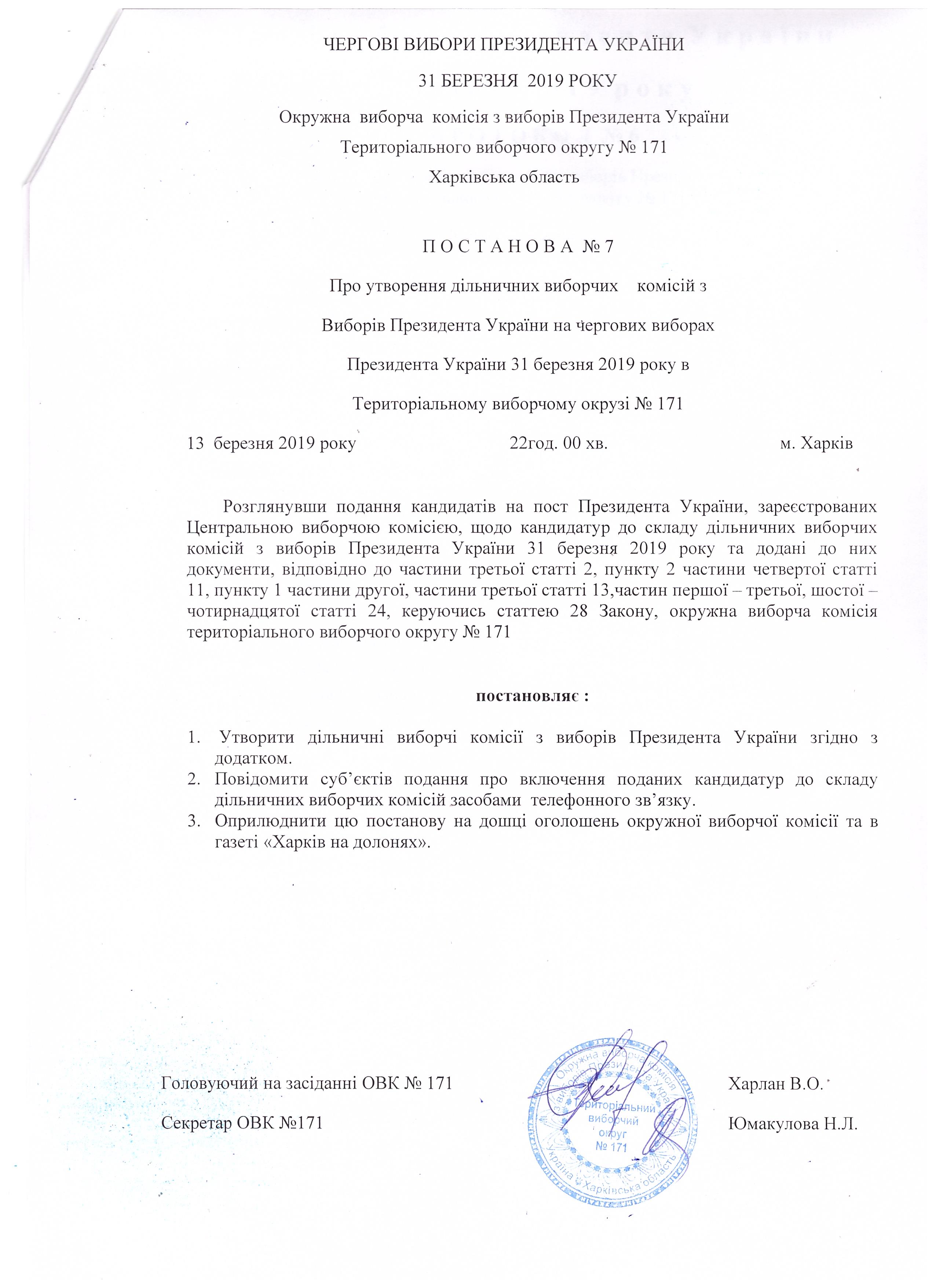 Про внесення змін у постанову від 12 березня 2019 р. №7 окружної виборчої комісії "Про утворення дільничних виборчих комісій з виборів Президента України 31 березня 2019 року в територіальному виборчому окрузі № 171" |
