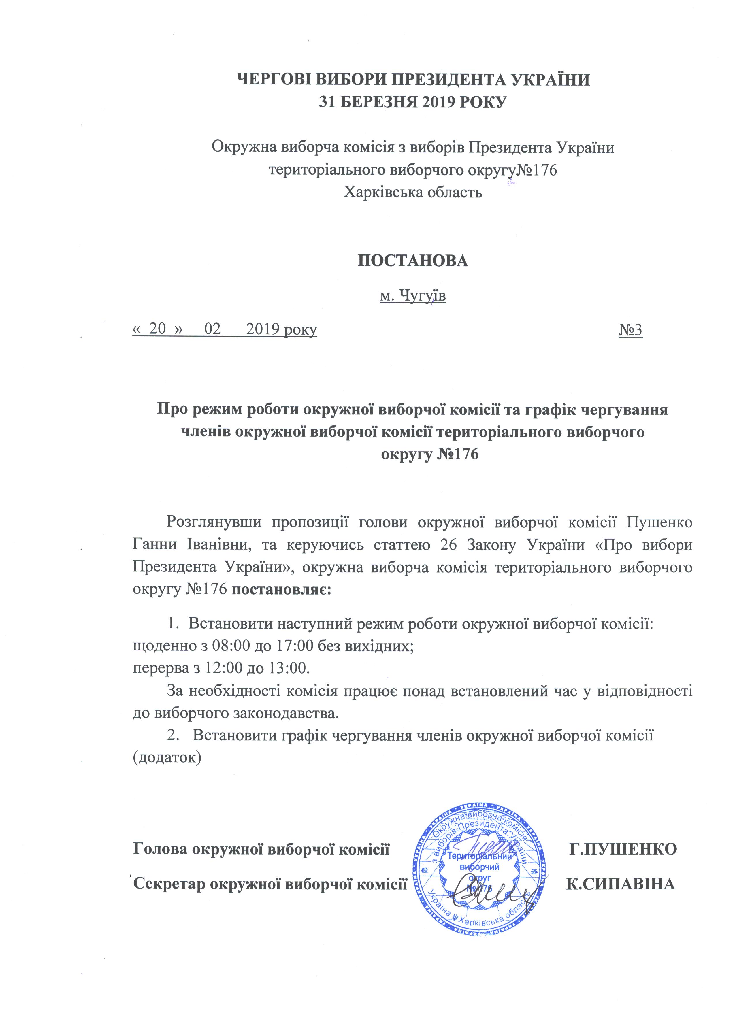 Про режим роботи окружної виборчої комісії та графік чергування членів окружної виборчой комісії територіального виборчого округу №176 |