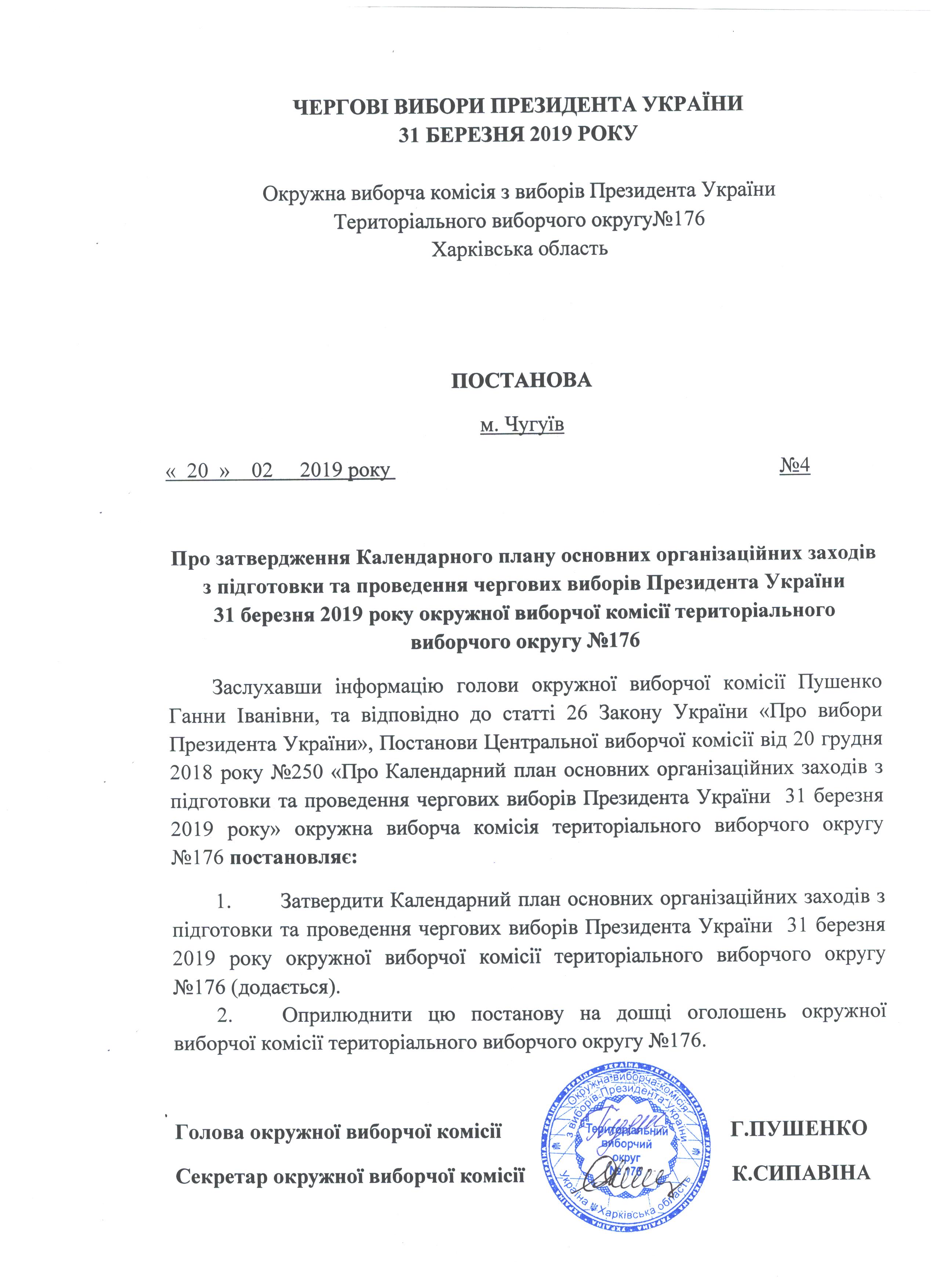 Про затвердження Календарного плану основних організаційних заходів з підготовки та проведення чергових виборів Президента України 31 березня 2019 року окружної виборчої комісії територіального виборчого округу №176 |