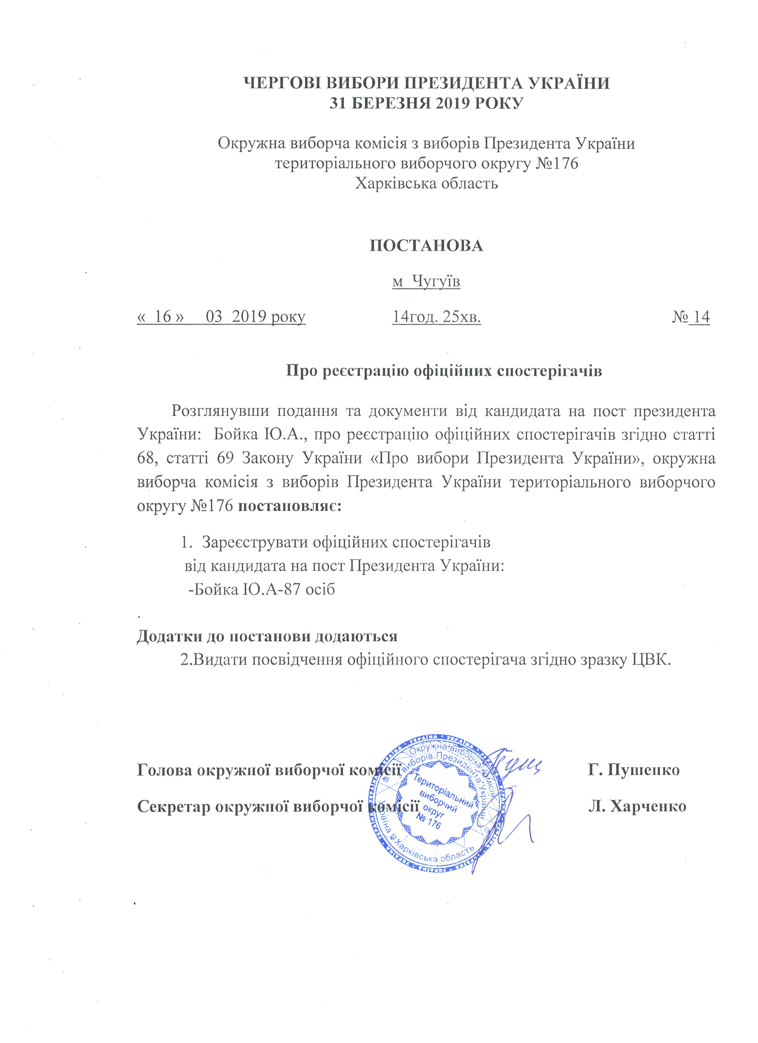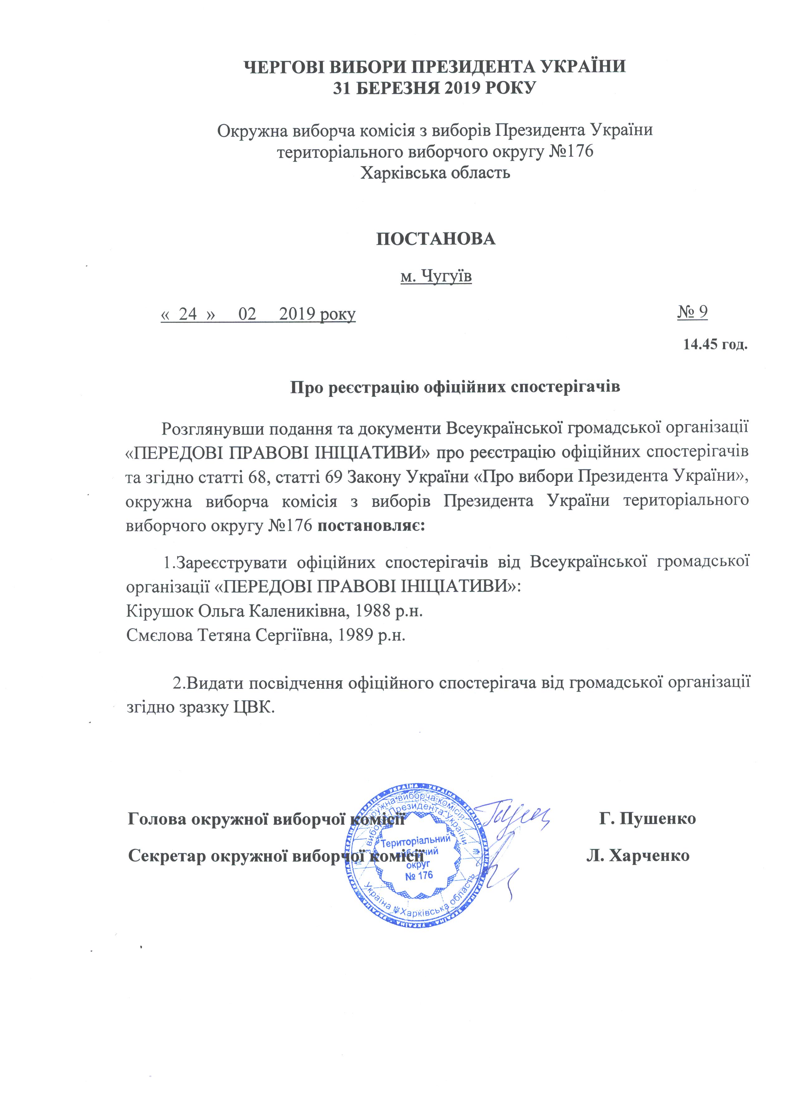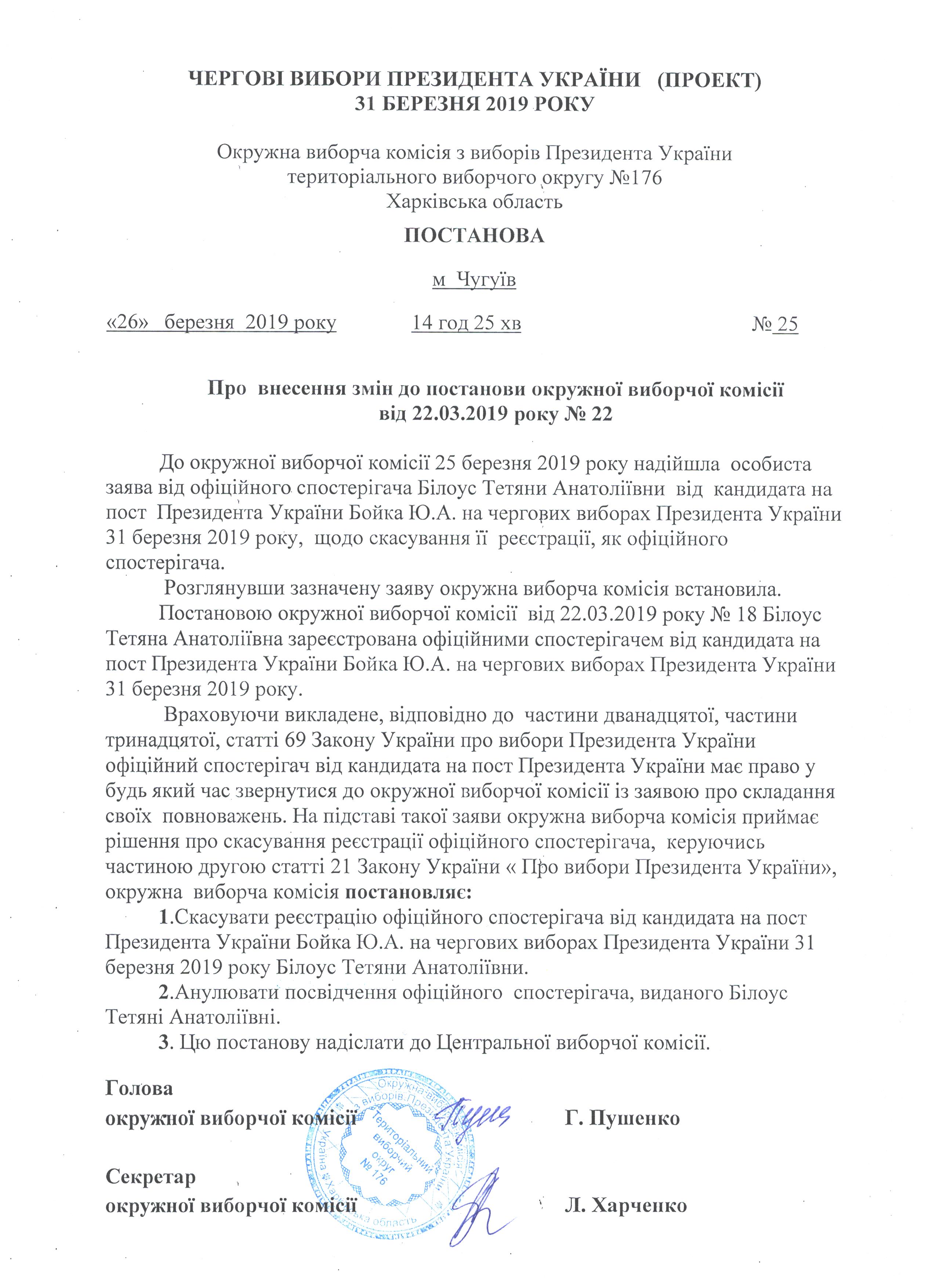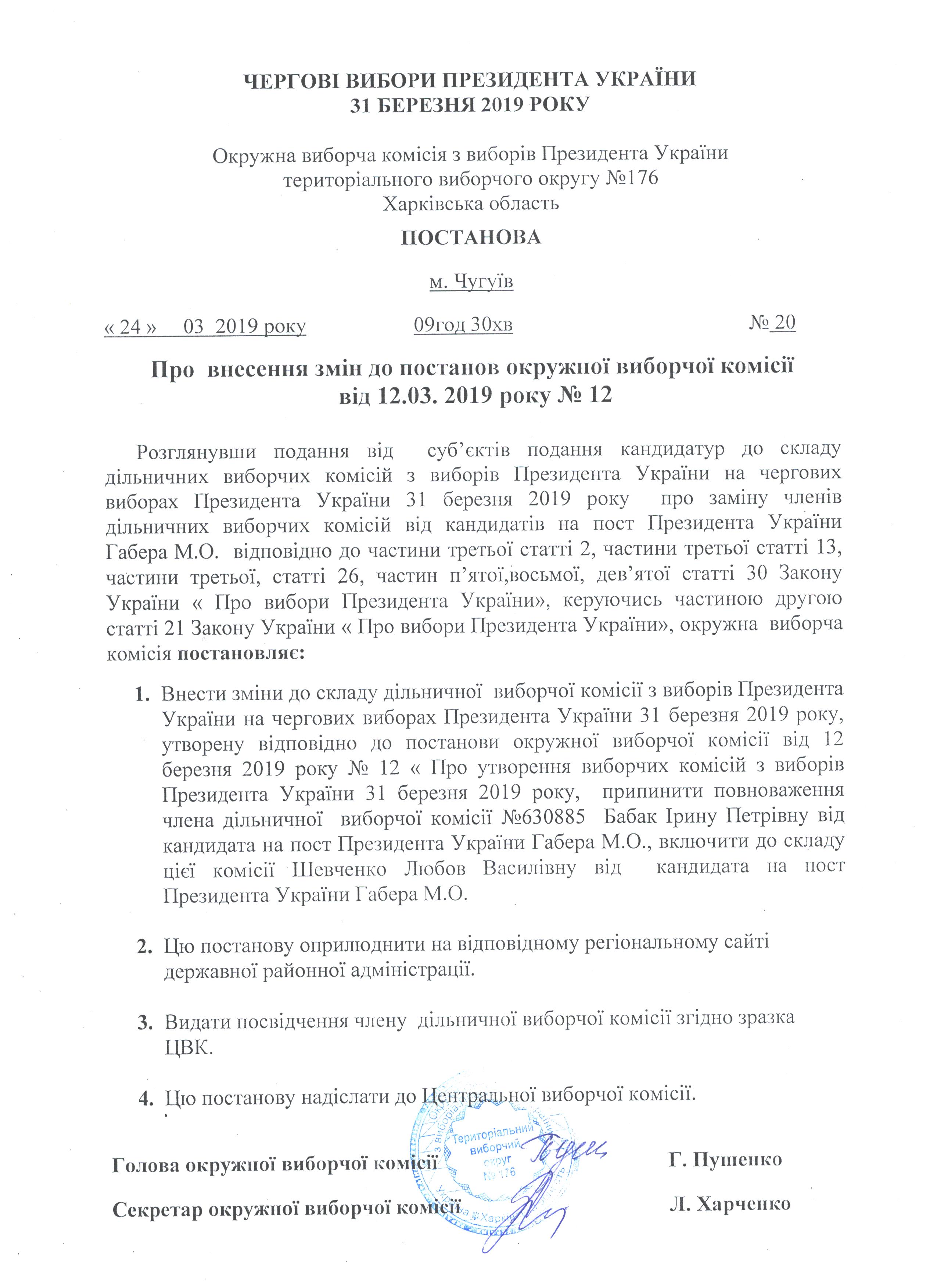 Про внесення змін до постанови №6 від 20.02.2019 року окружної виборчої комісії з виборів Президента України територіального виборчого округу №176 для підготовки та проведення чергових виборів Президента України 31 березняч 2019 |