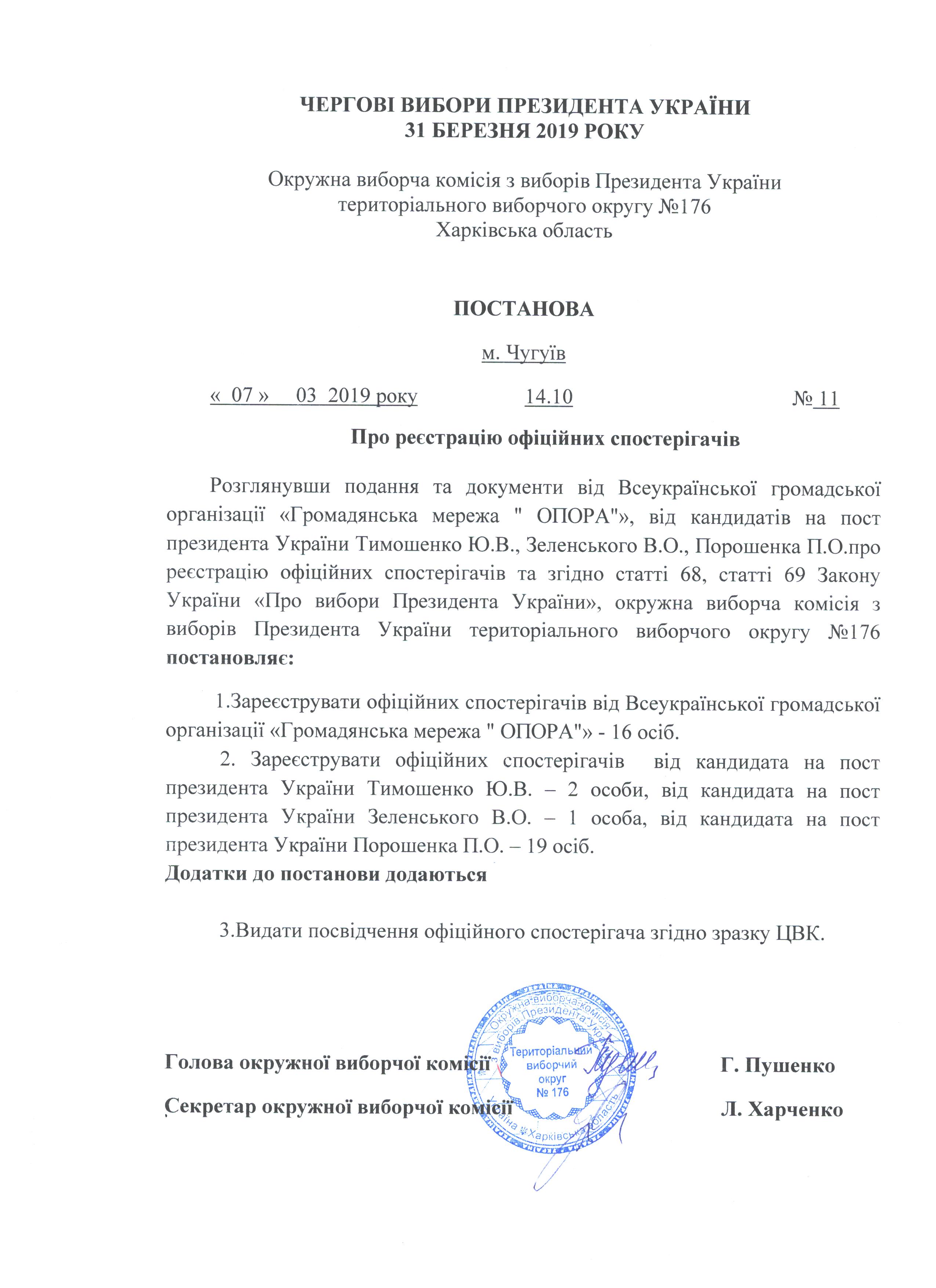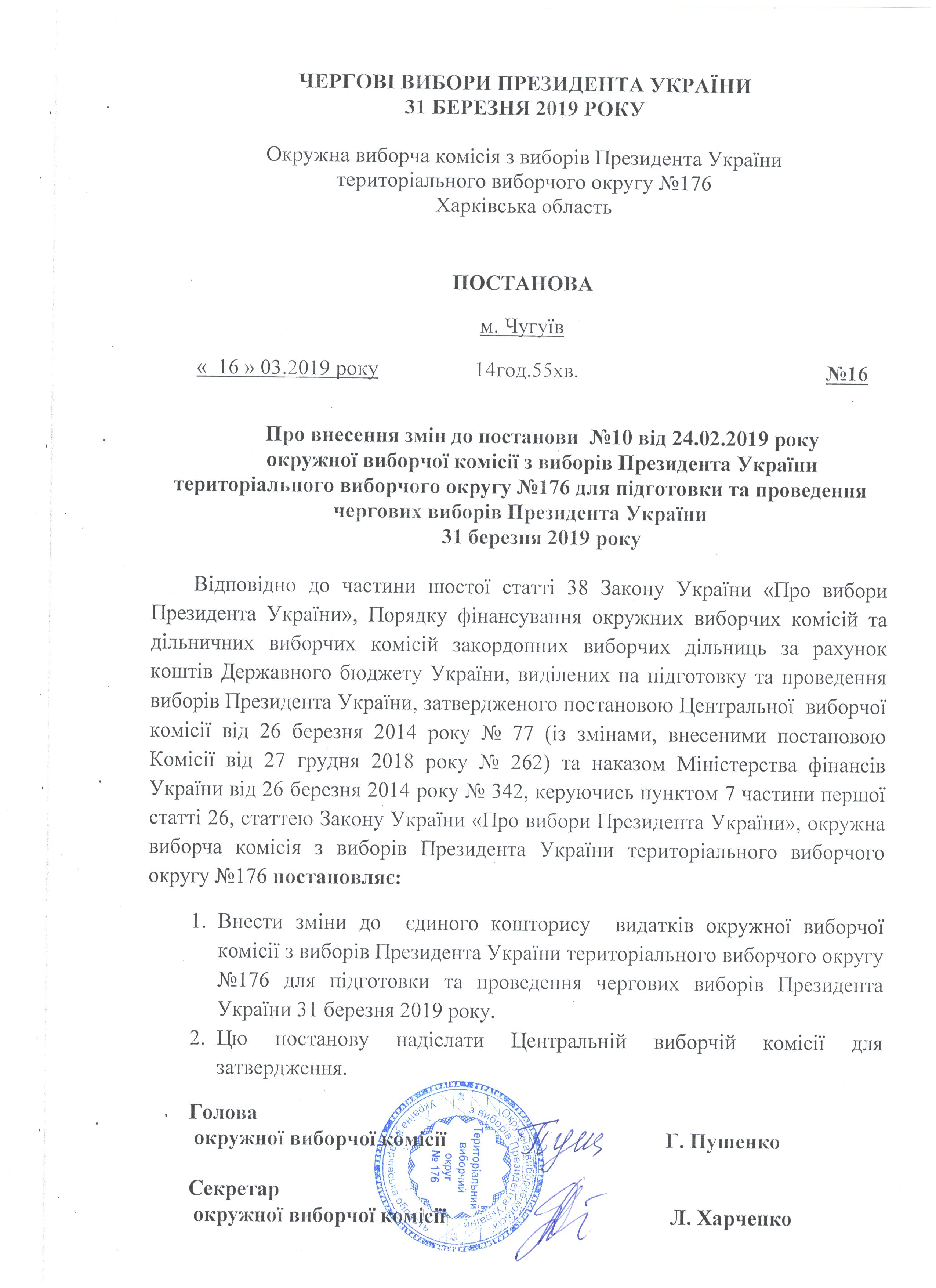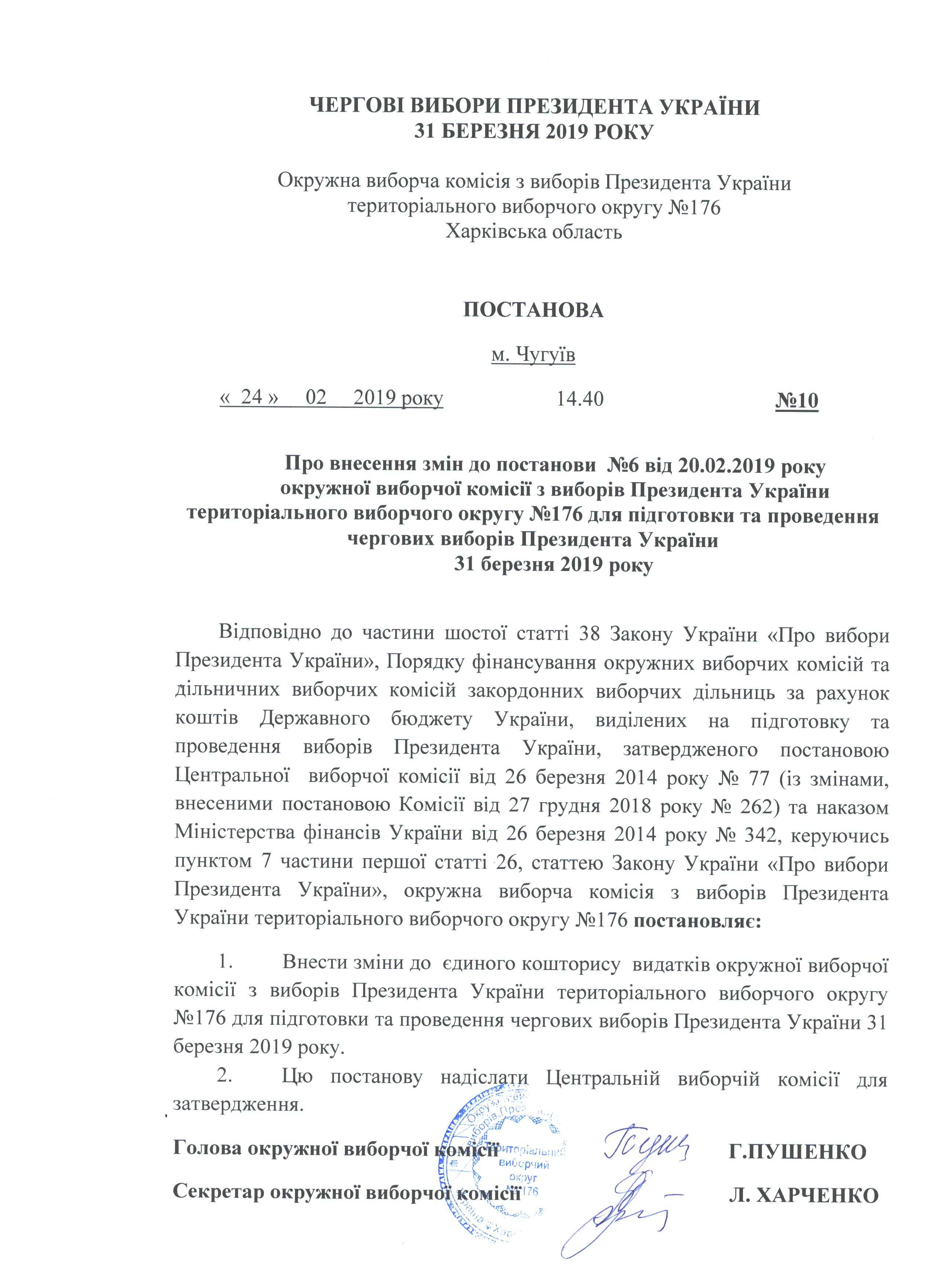 Про внесення змін до постанови № 10 від 24.02.2019 окружної виборчої комісії з виборів Президента України територіального виборчого округу № 176 для підготовки та проведення чергових виборів Президента України 31 березня 2019 року |