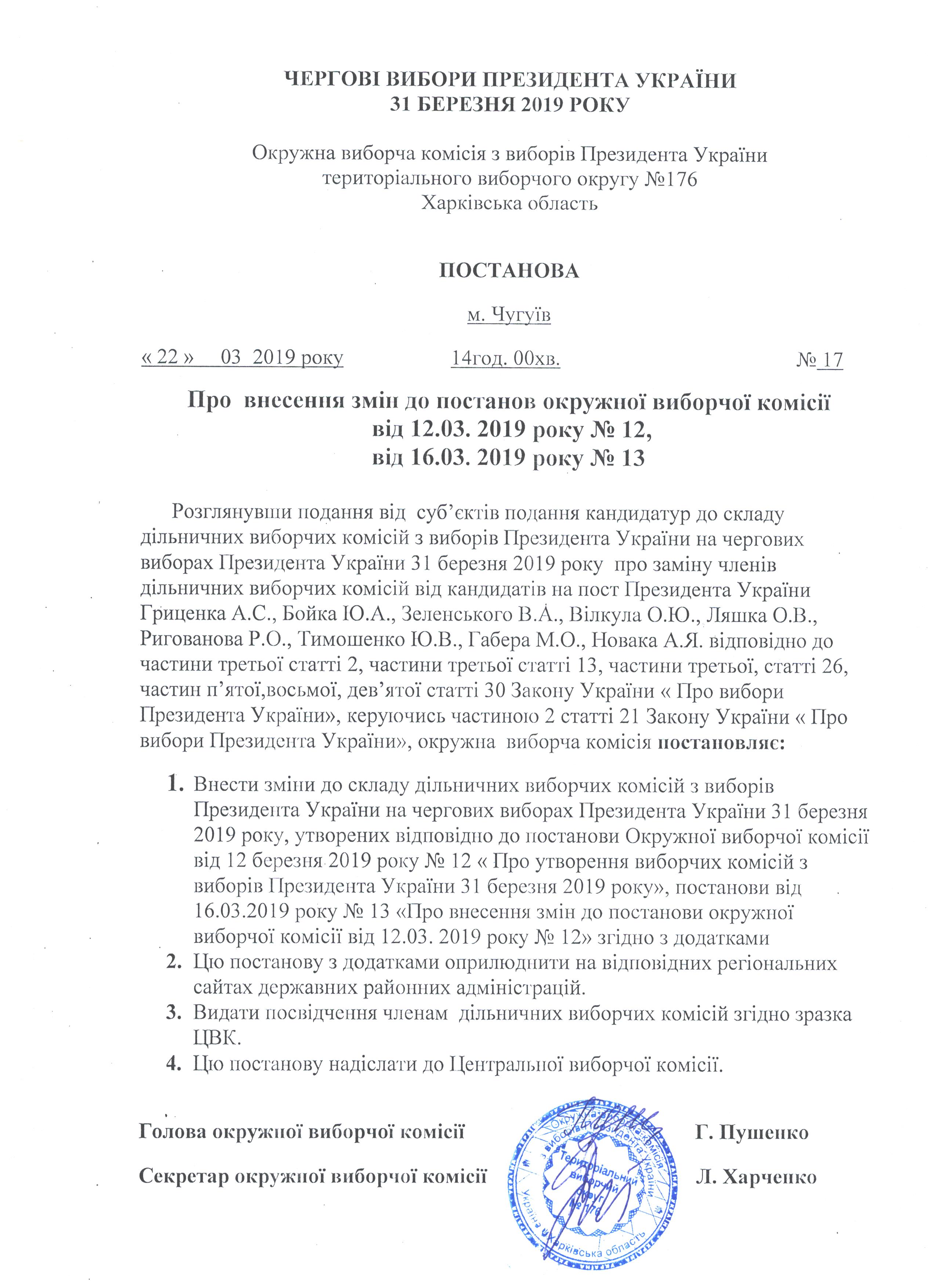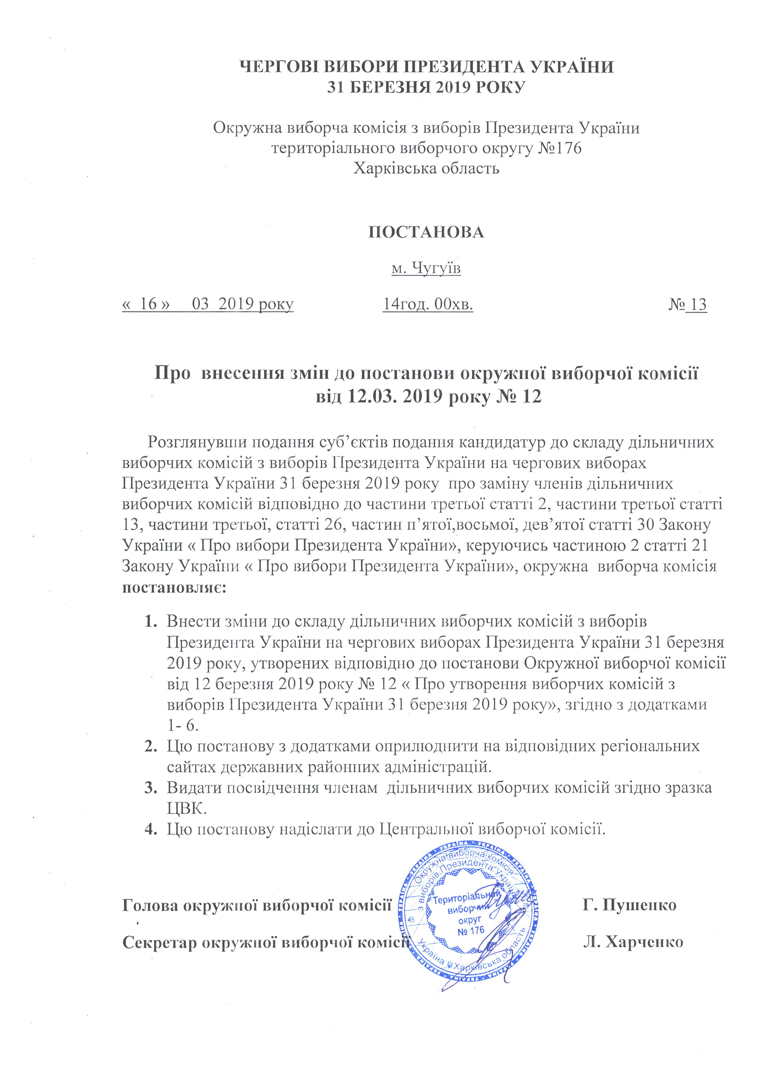 Про внесення змін до постанов окружної виборчої комісії від 12.03.2019 року №12, від 16.03.2019 року №13 Про утворення дільничих виборчих комісій з виборів президента України 31 березня 2019 року територіального виборчого округу №176 |