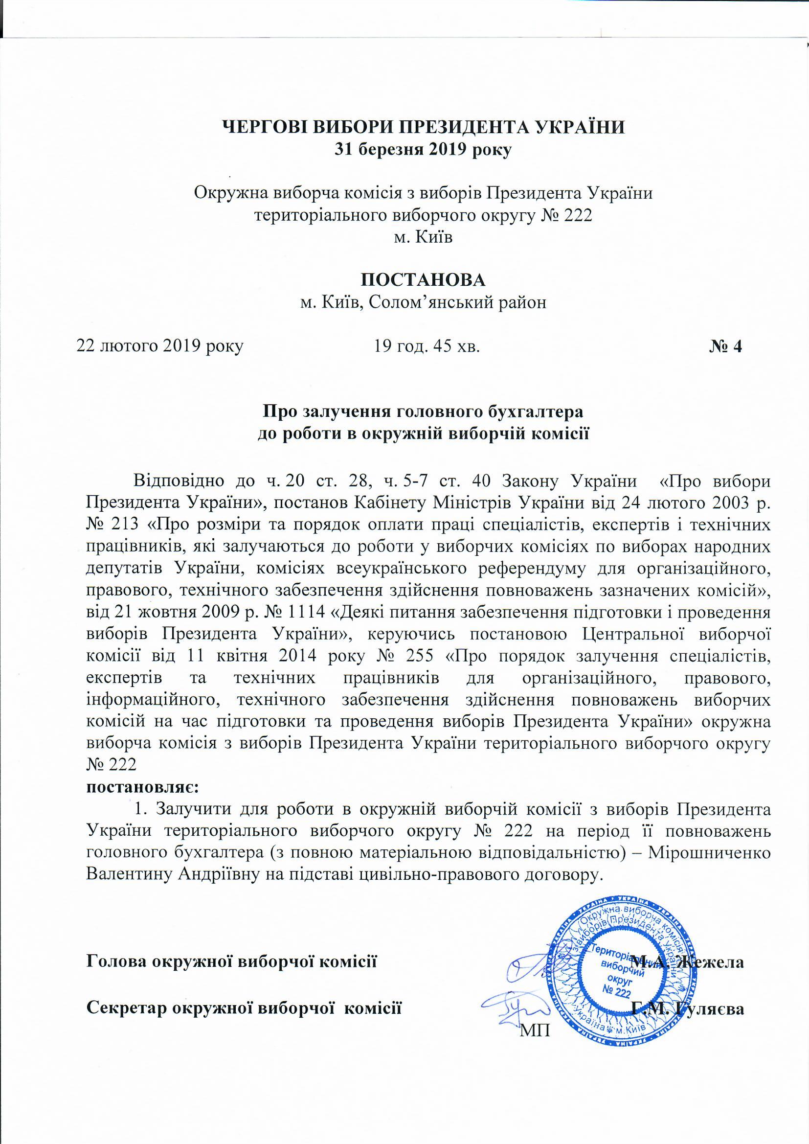 Про затвердження переліку посад та чисельності залучених спеціалістів і технічних працівників для роботи в ОВК з виборів призидента України ТВО № 222 |