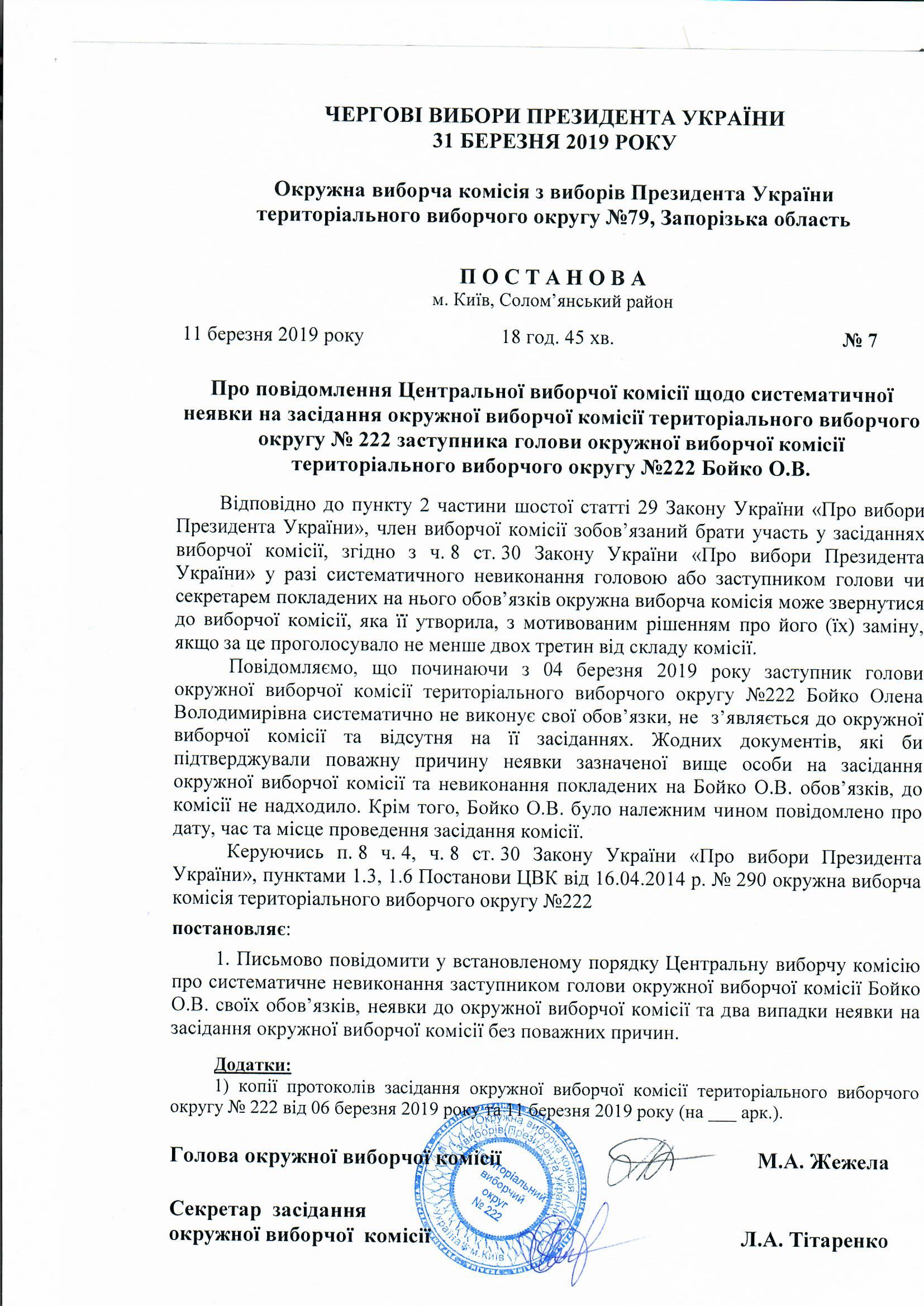Про повідомленя ЦВК щодо систематичної неявки на засідання ОВК ТВО № 222 заступника голови ОВК ТВО № 222 Бойко О.В. |