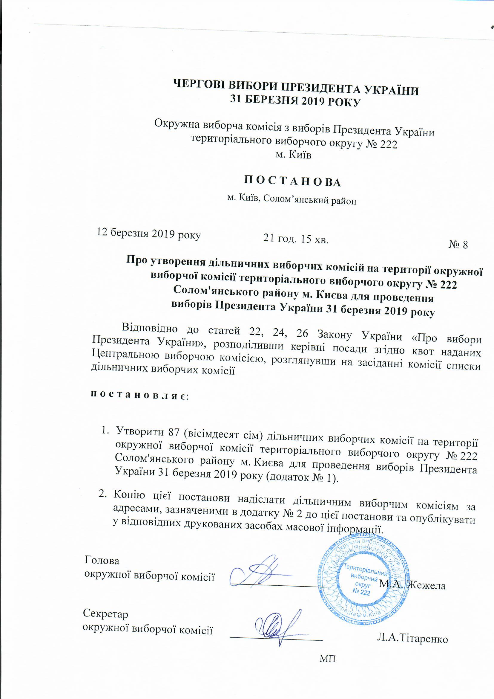 Про утворення дільничих виборчих комісій на території окружної виборчої комісії територіального виборчого округу №222 Соломянського р-н м.Києва для проведення виборів Президента України 31 березня 2019 року |