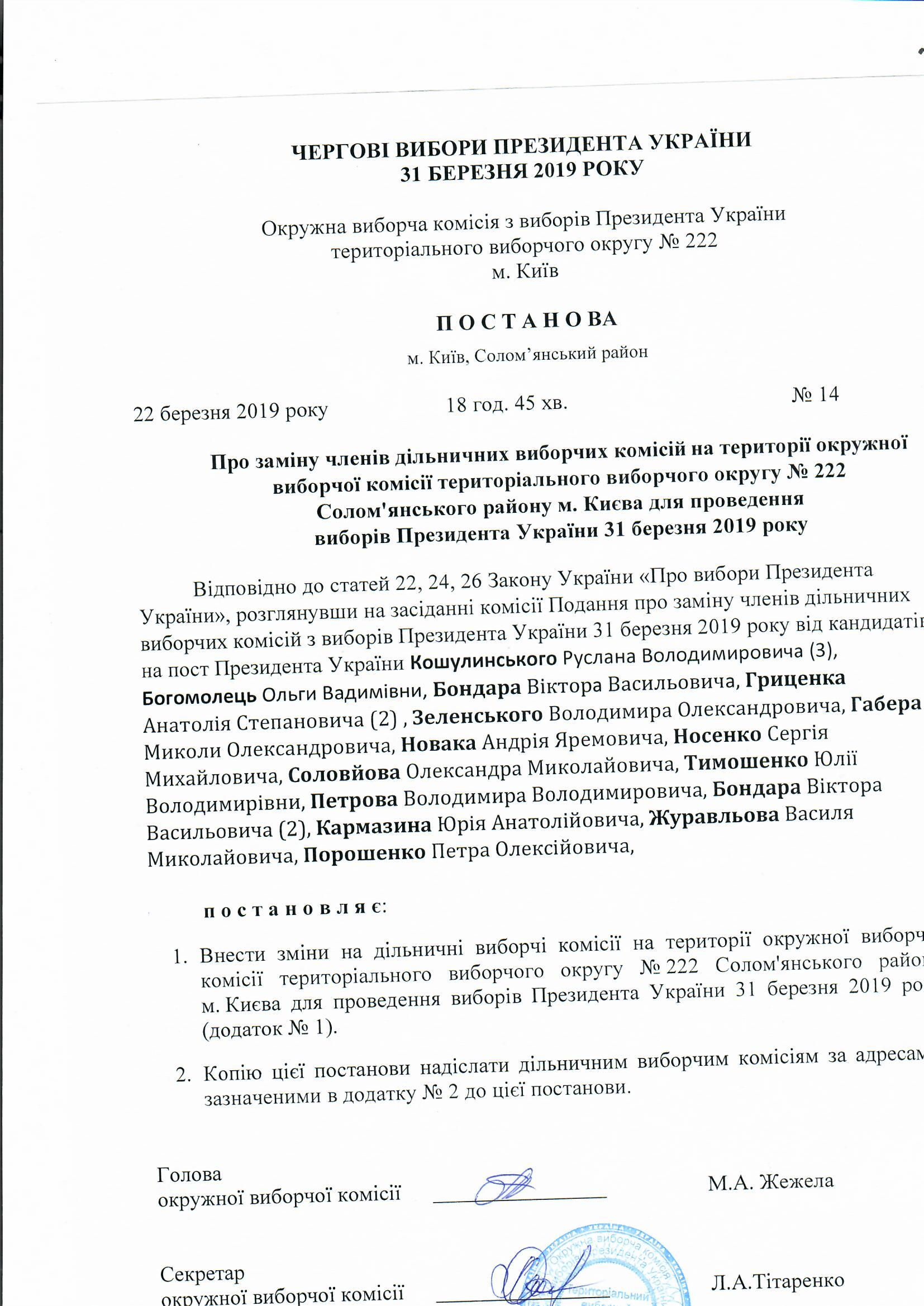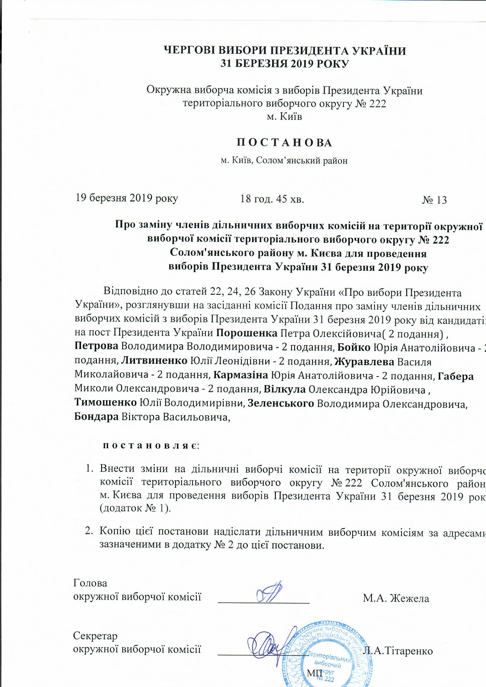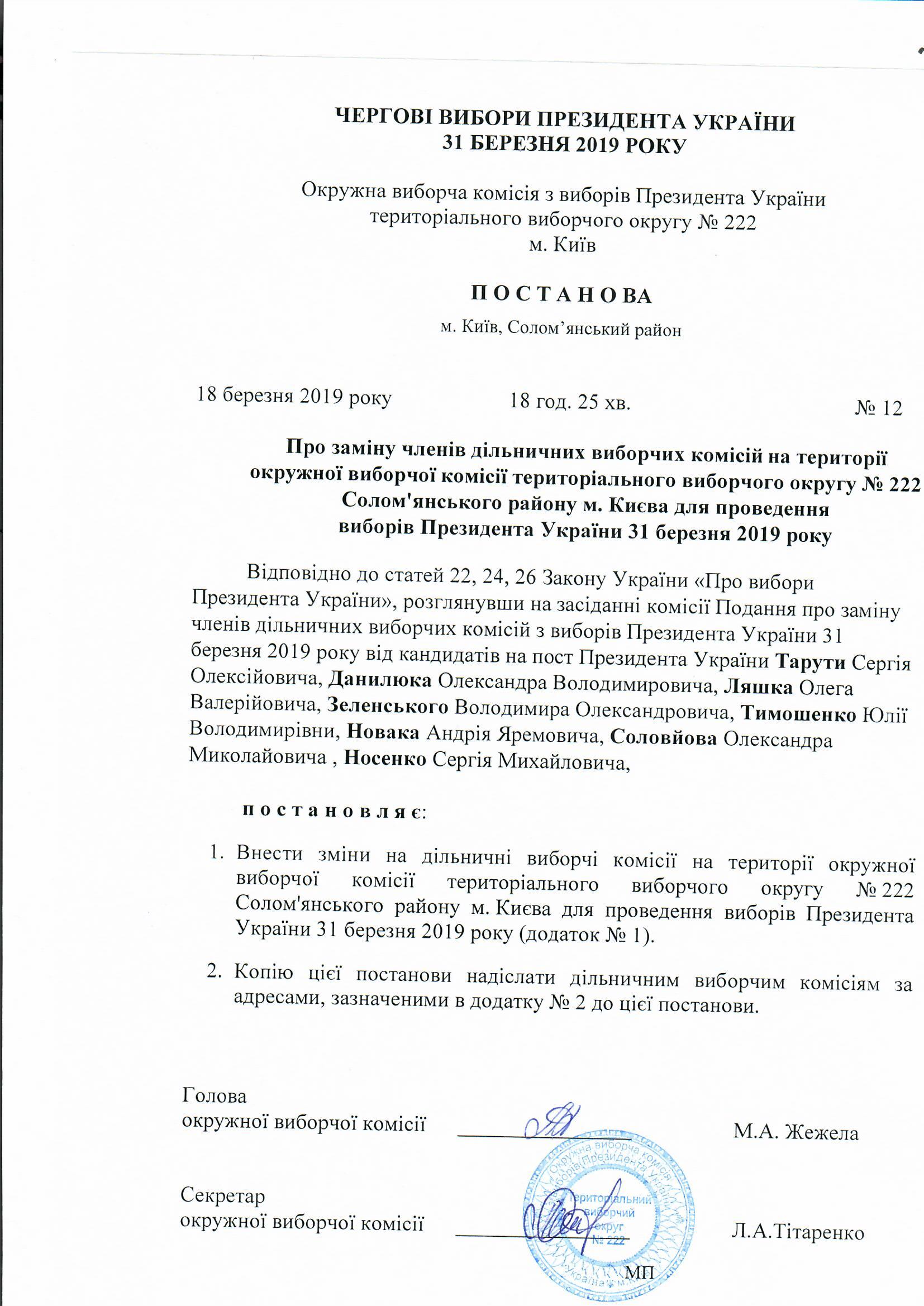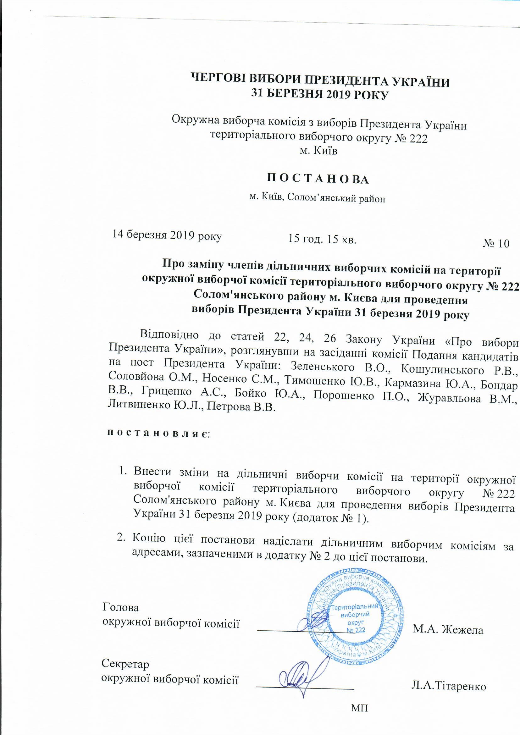 Про зміну членів дільничних виборчих комісій на території окружної виборчої комісії териториального виборчого округу №222 Солом'янського району м. Києва для проведення виборів Президента України 31 березня 2019 року |