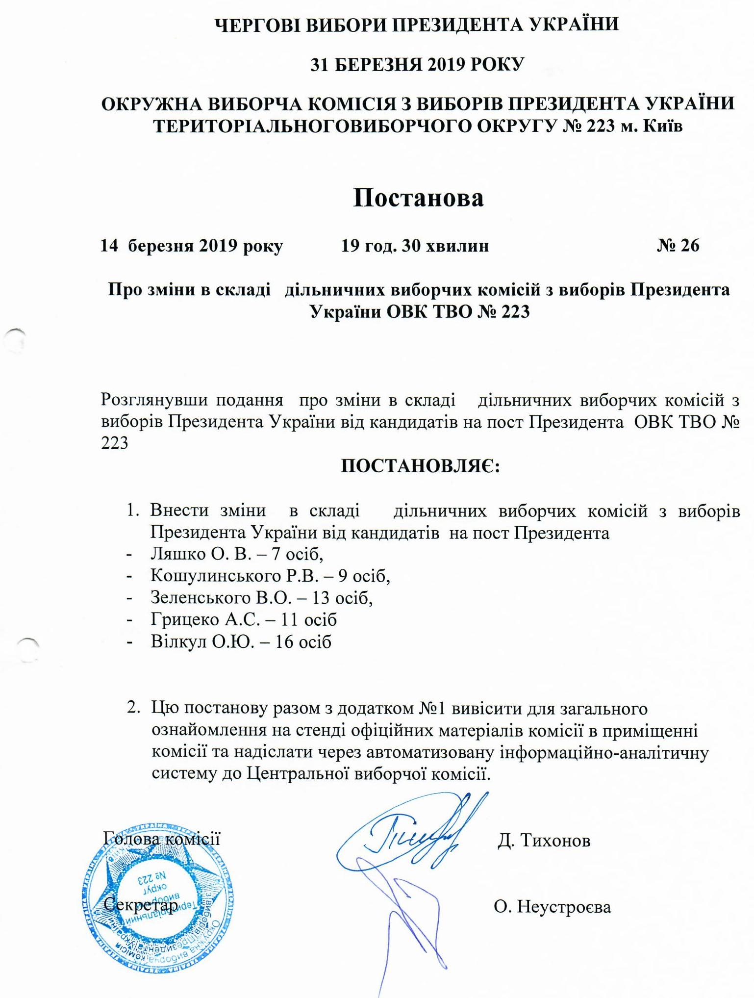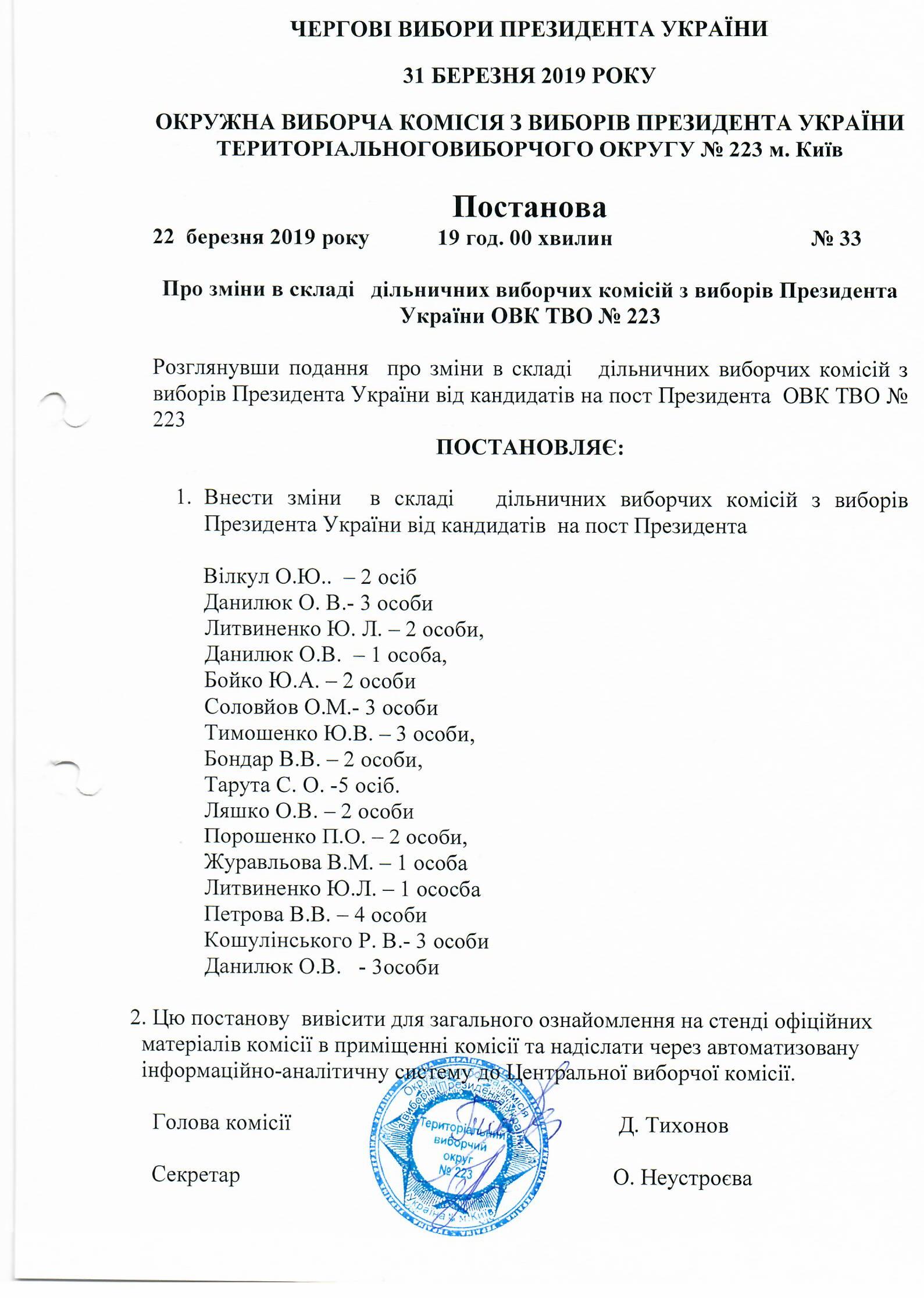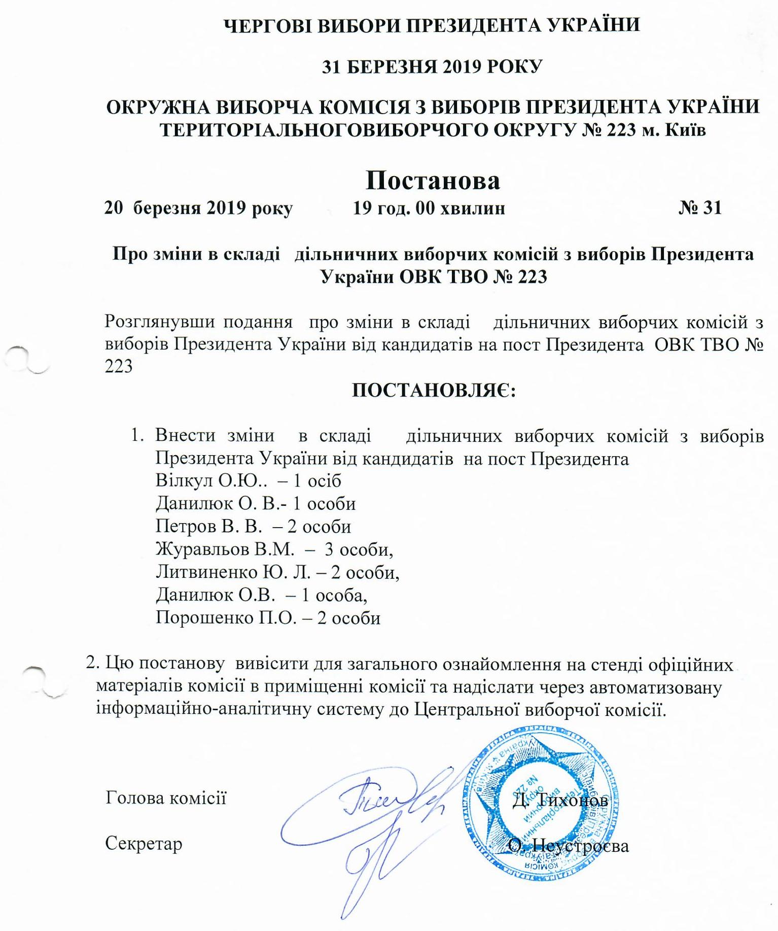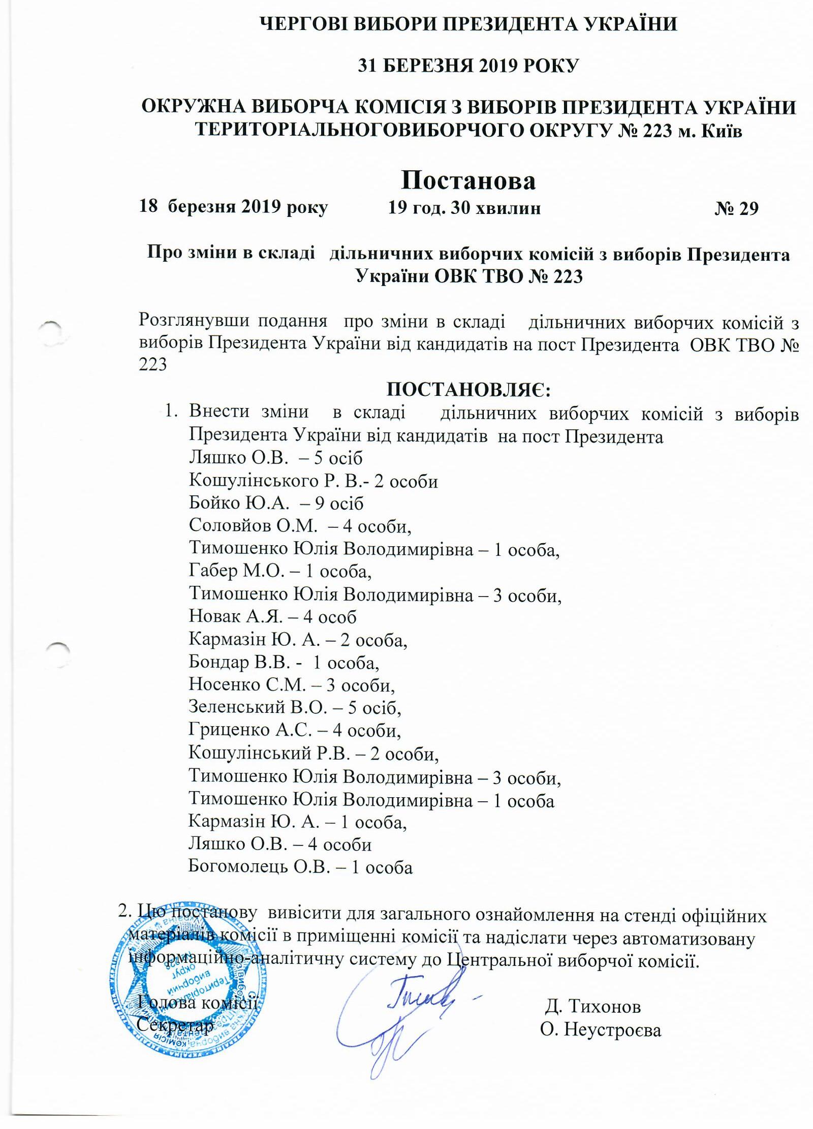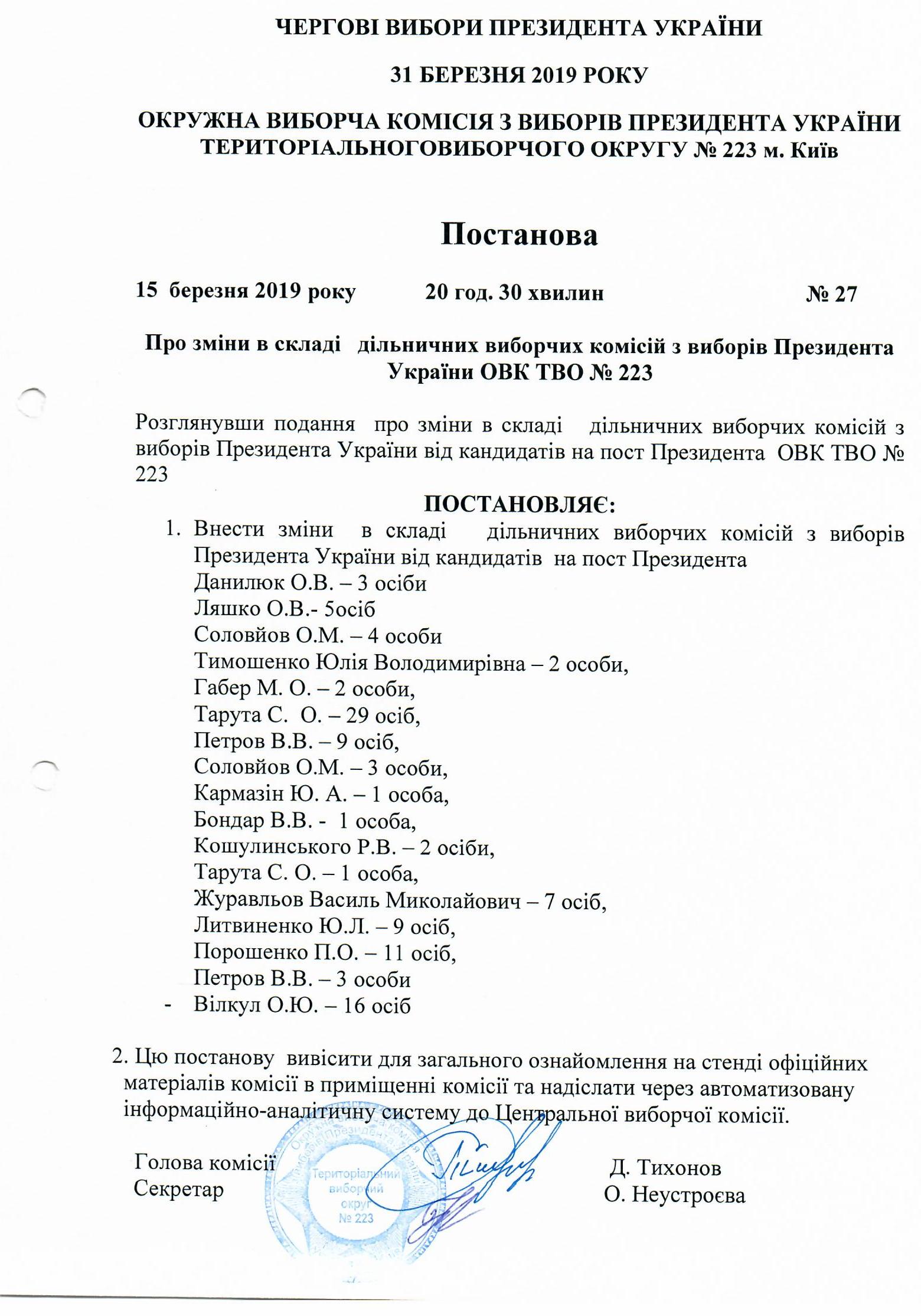 Про зміни в складі дільничних виборчих комісій з виборів Президента України ОВК ТВО №223 |