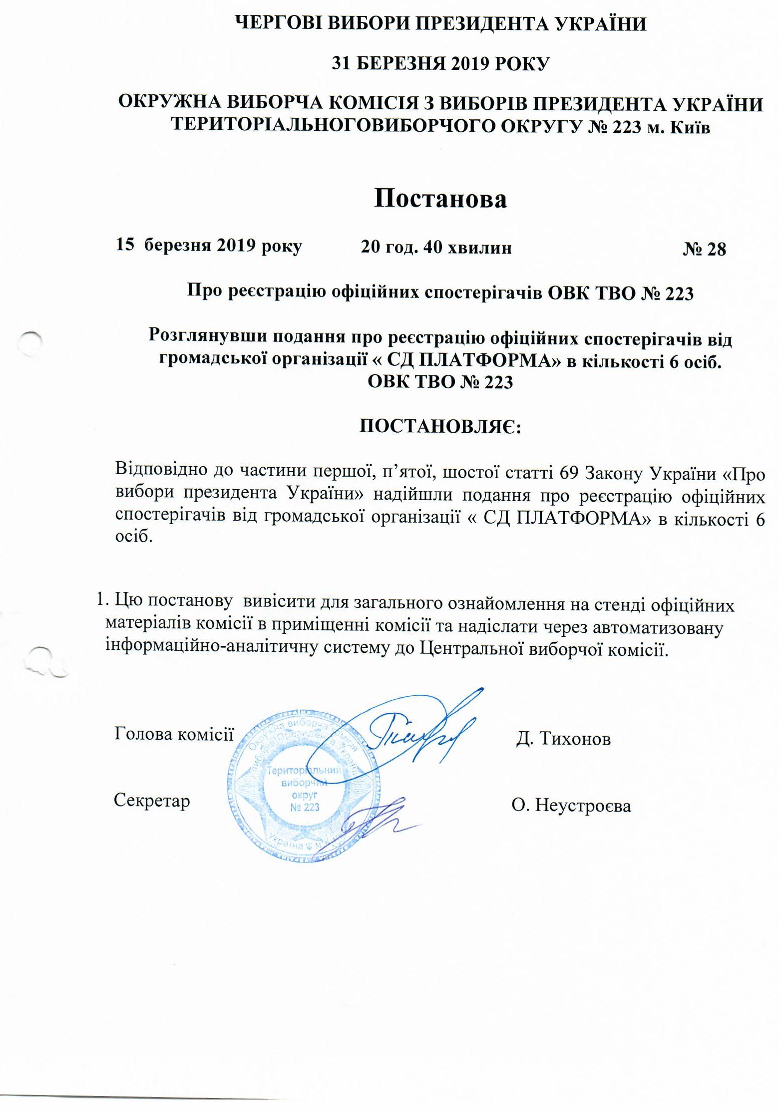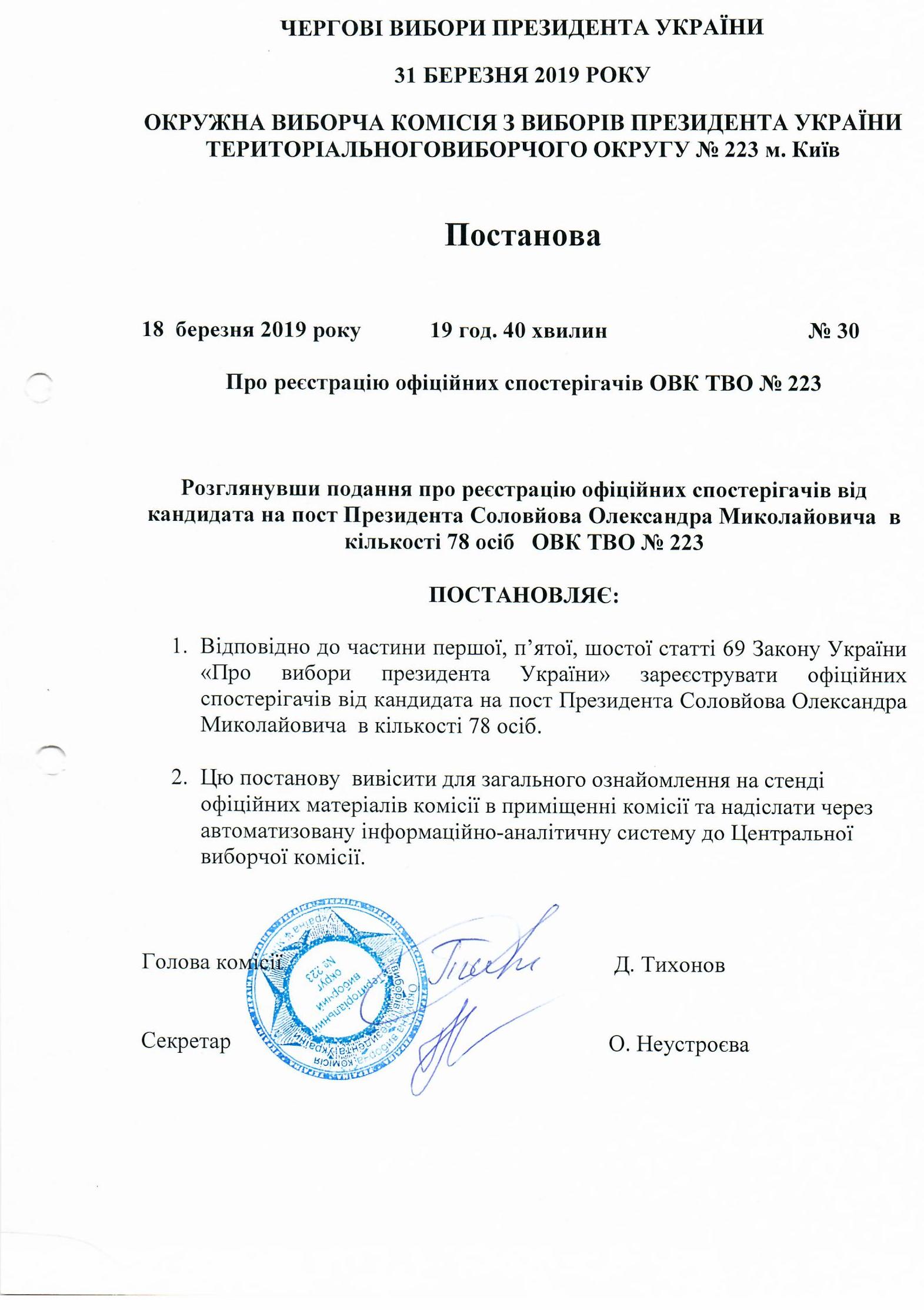 Про реєстрацію офіційних спостерігачів ОВК ТВО №223 |