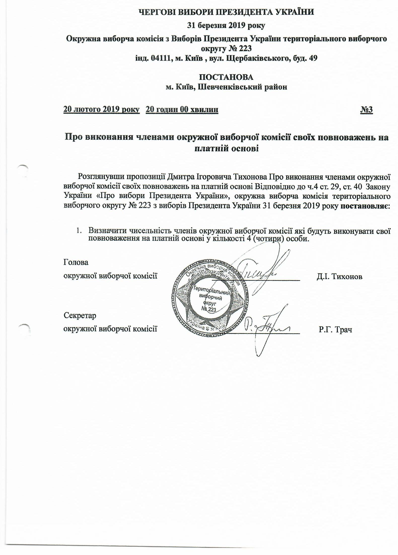 Про виконання членами ОВК з виборів Президента України ТВО № 223 своїх повноважень на платній основі |
